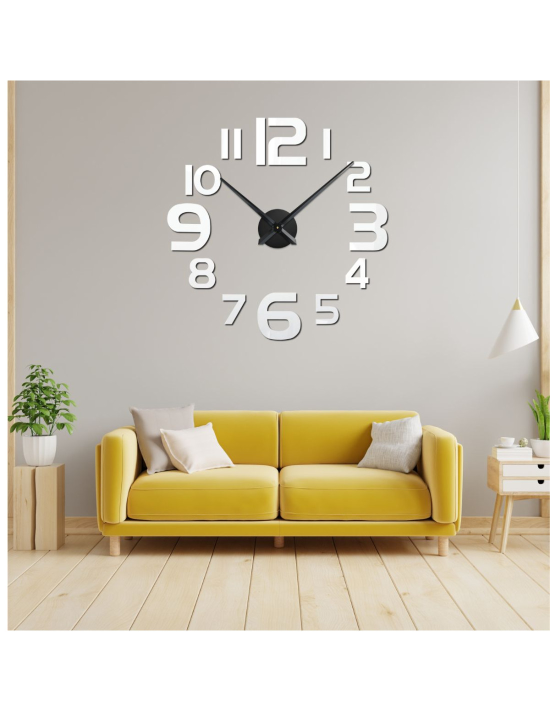 Elegantní černý ciferník s výraznými čísly v minimalistickém stylu dodává prostoru stylový a čistý vzhled.