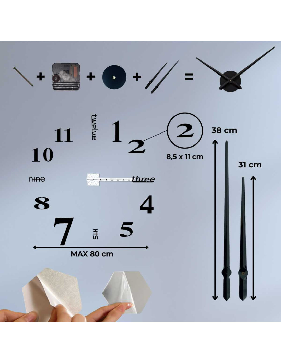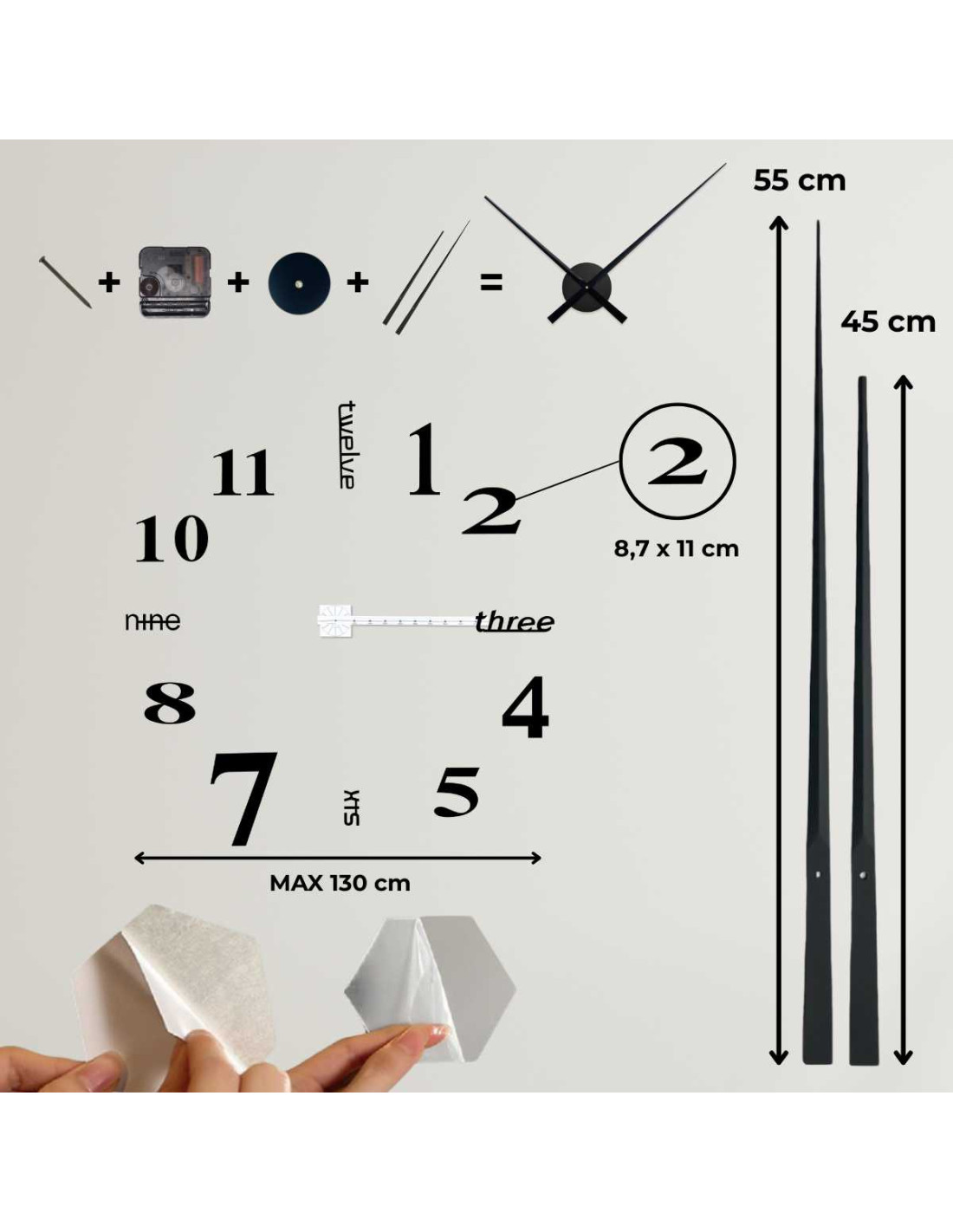 - Číslice ciferníku mají samolepící vrstvu, takže instalace je rychlá a bez vrtání.