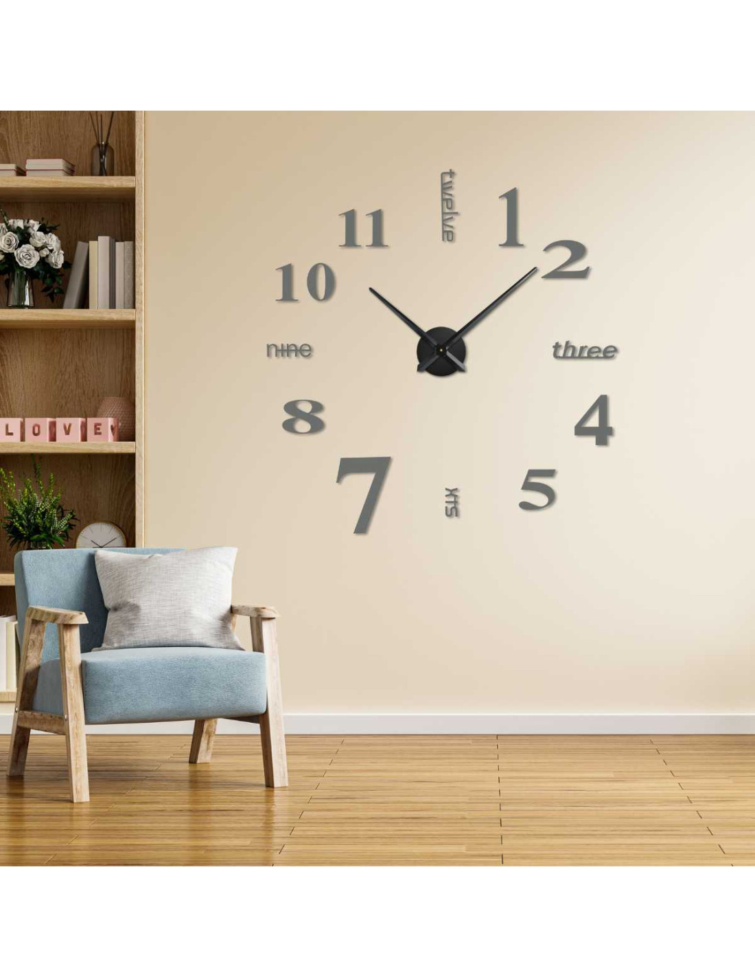 Nástěnné hodiny s moderním designem kombinují velké číslice a psaná časová označení.