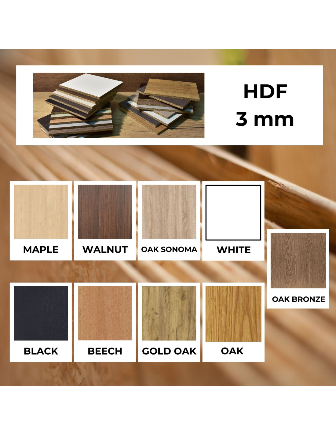 • Překližka má tloušťku 5 mm / HDF má tloušťku 3 mm.