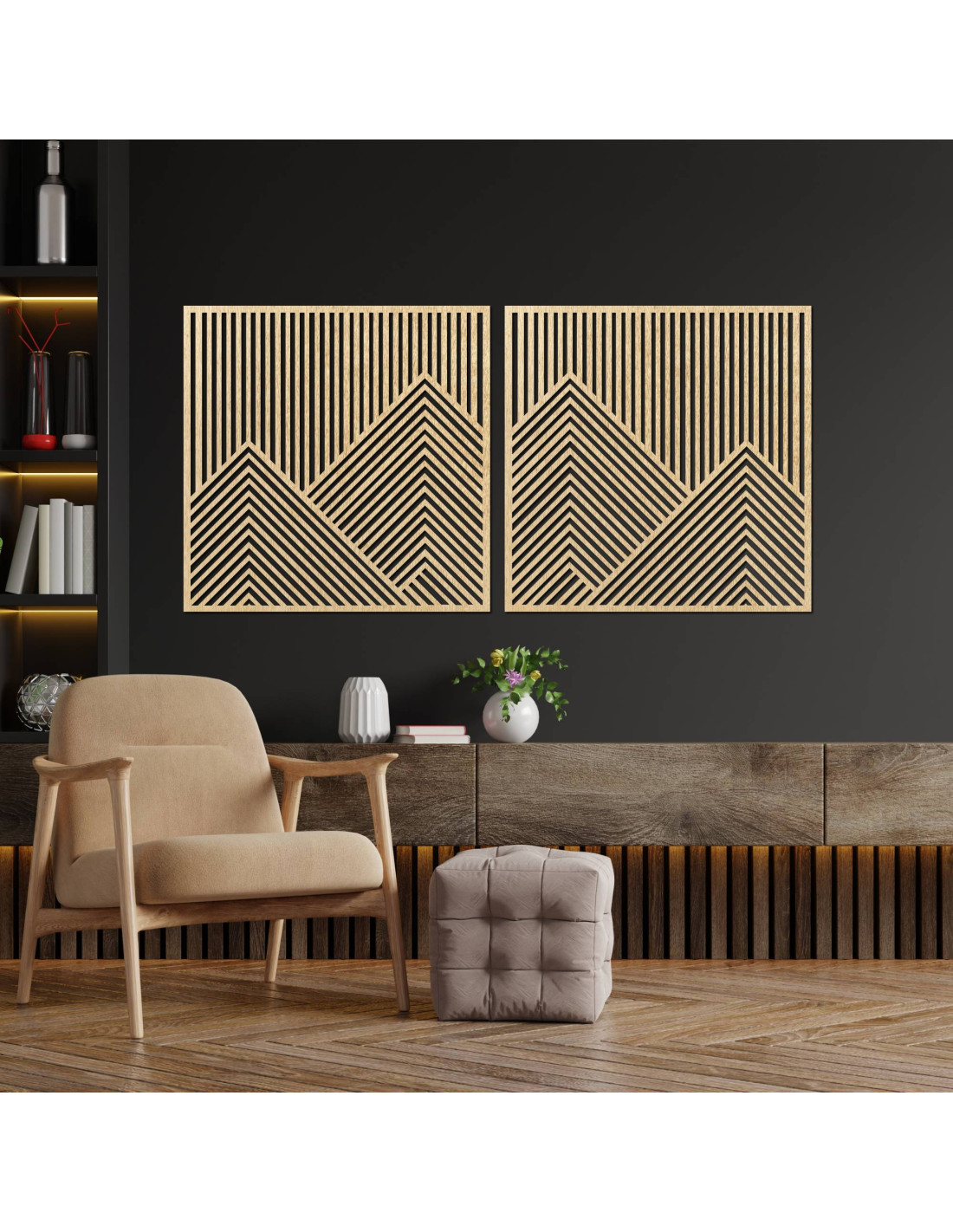 Nástěnná dekorace ze dřeva s geometrickými horskými liniemi - sada 2 kusů