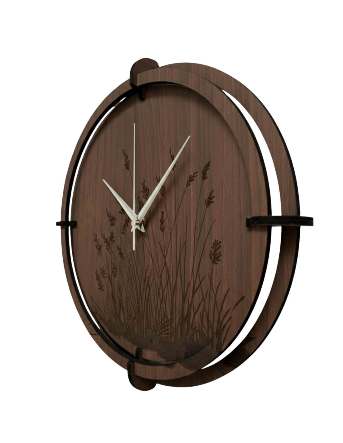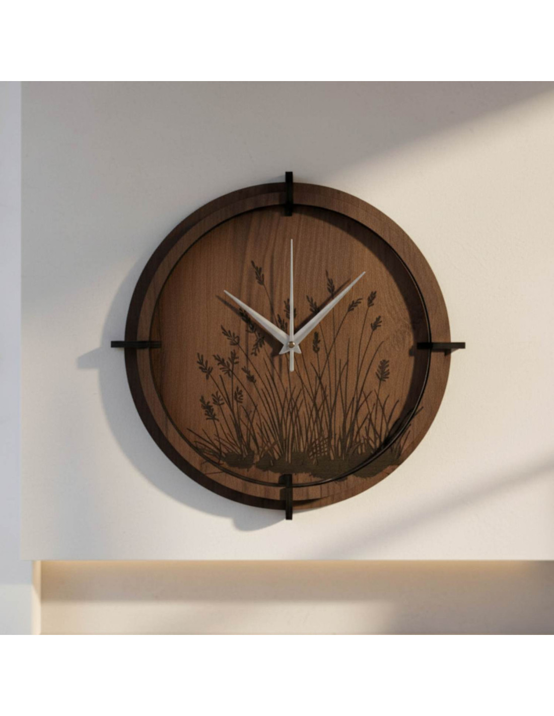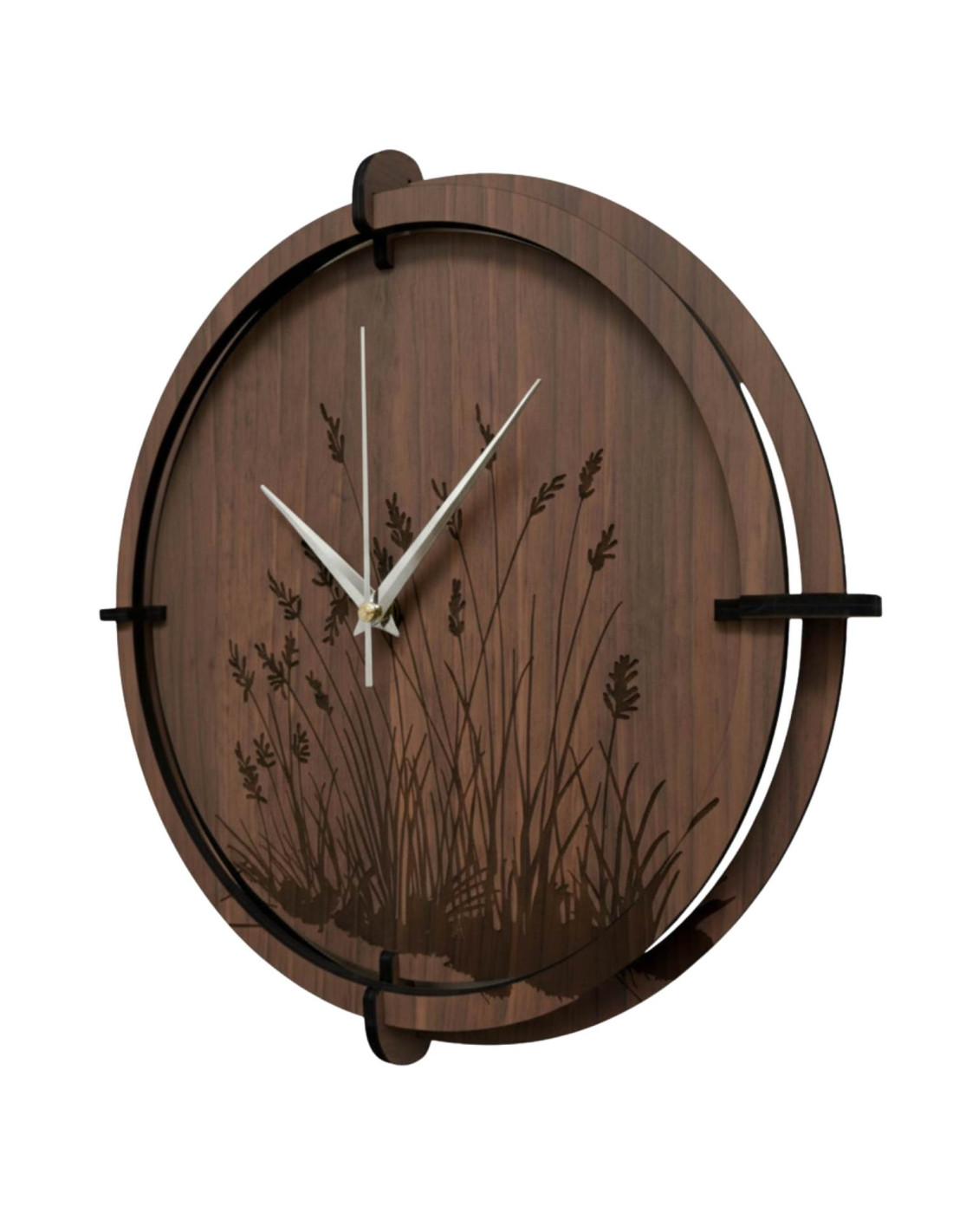 Moderní dřevěné nástěnné hodiny s jemně gravírovaným motivem luční trávy vnášejí do interiéru klid, harmonii a přírodní design .
