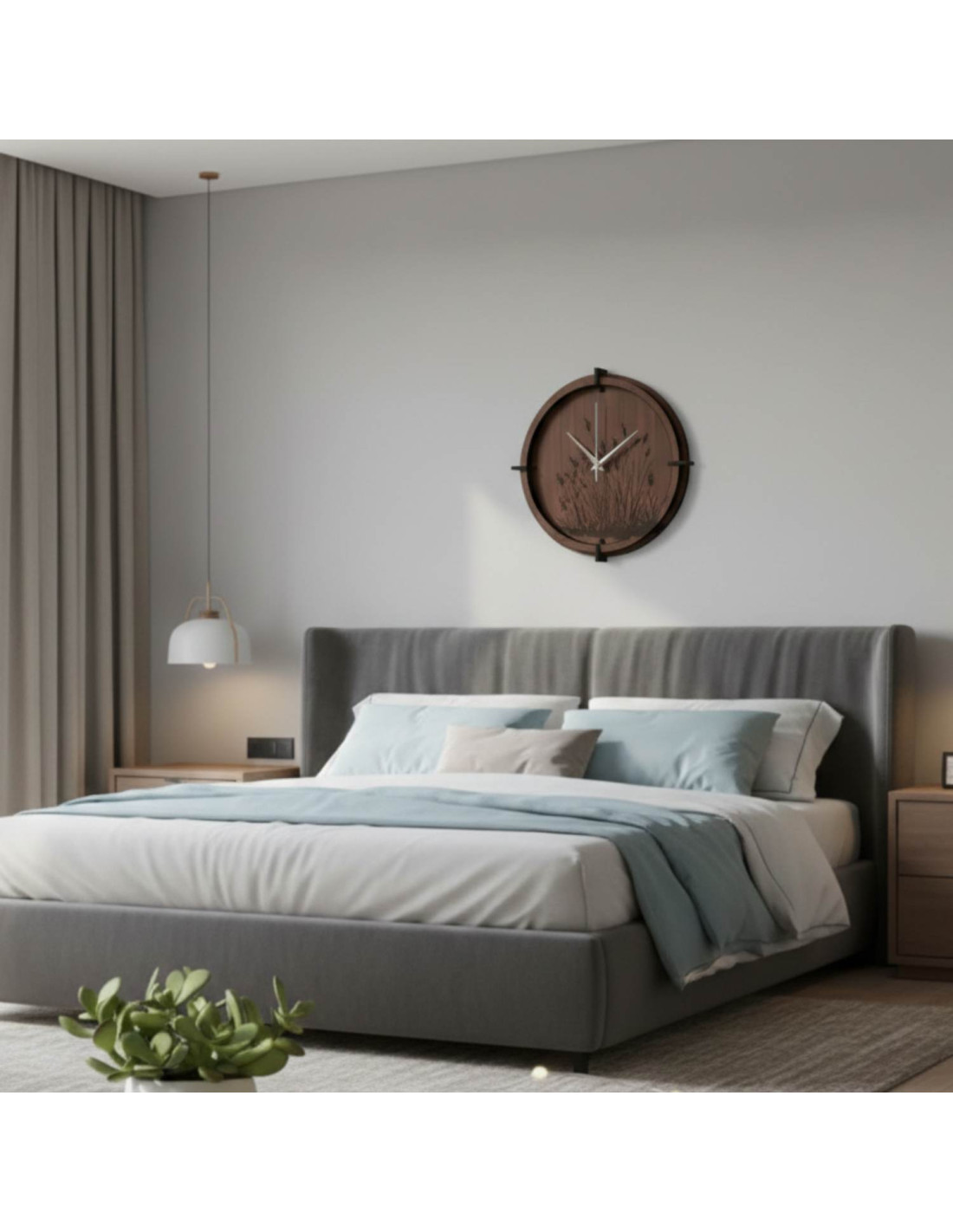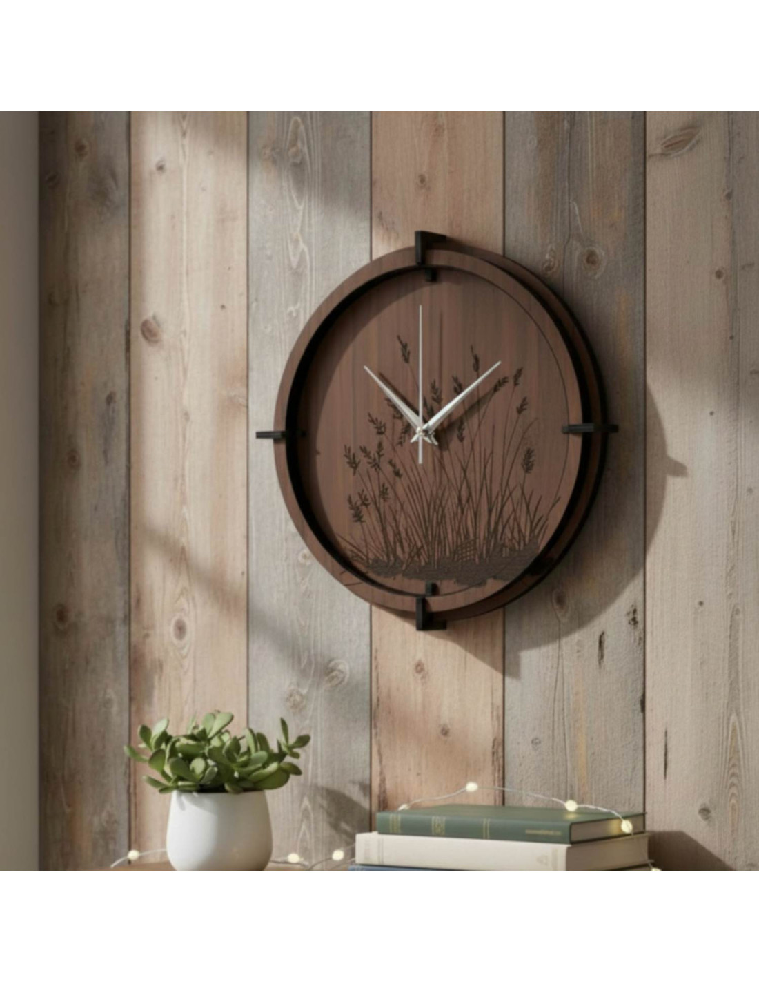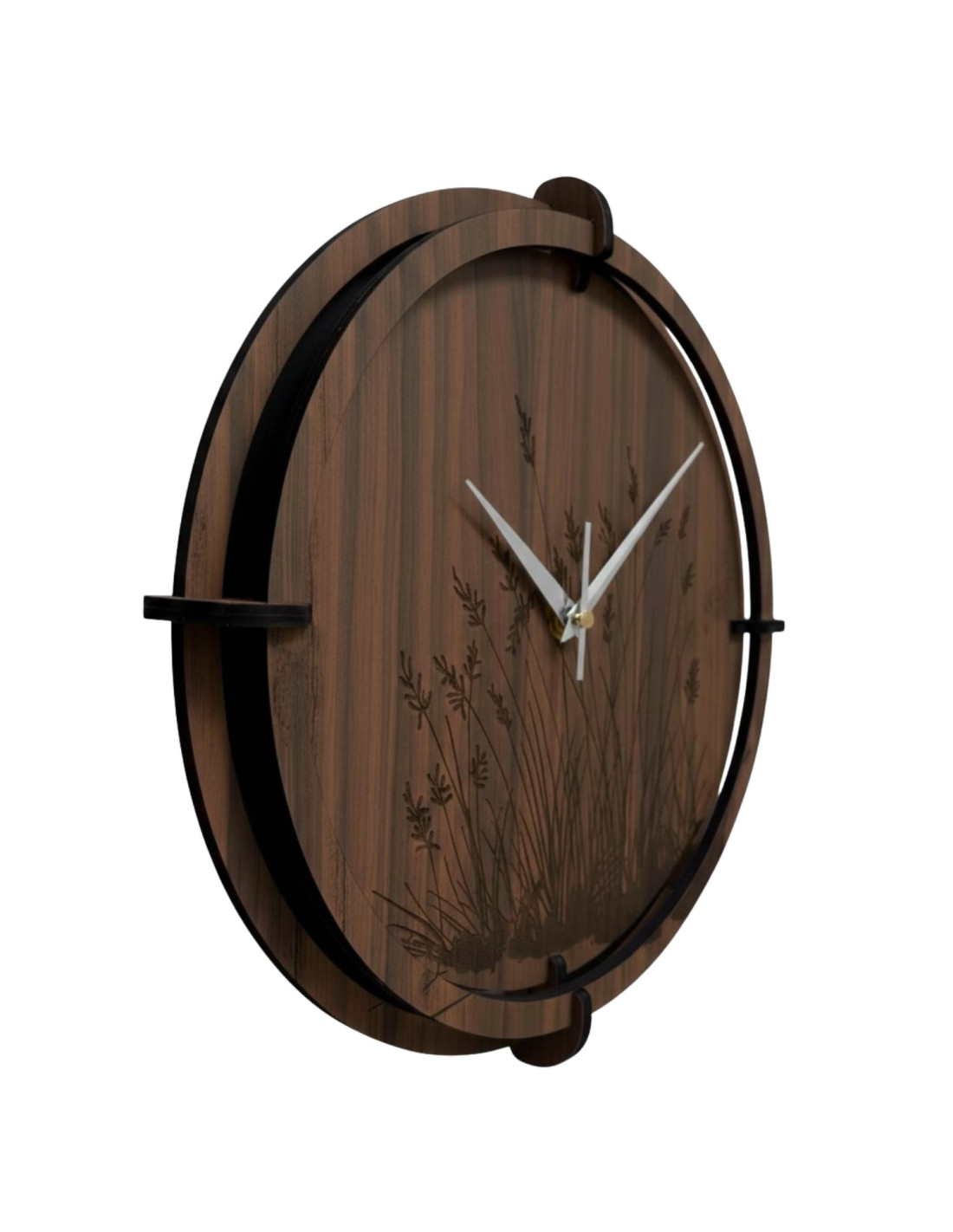 Moderní dřevěné nástěnné hodiny s jemně gravírovaným motivem luční trávy vnášejí do interiéru klid, harmonii a přírodní design .