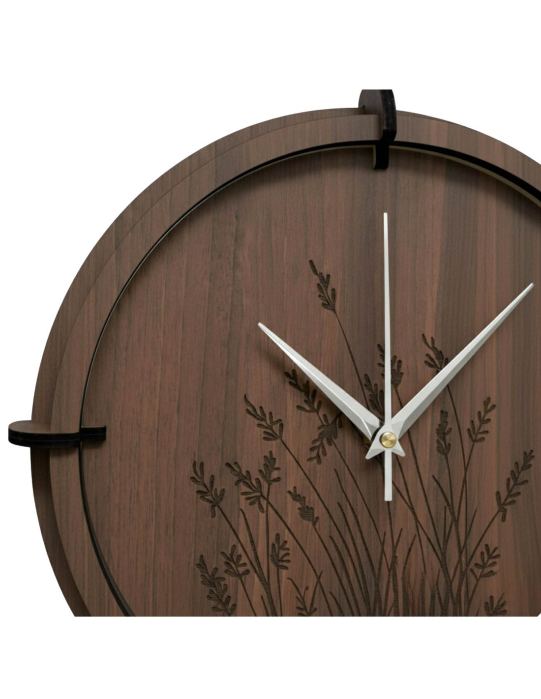 Dřevěné hodiny s gravírovaným rostlinným motivem spojují estetiku přírody s přesným měřením času a tichým mechanismem.