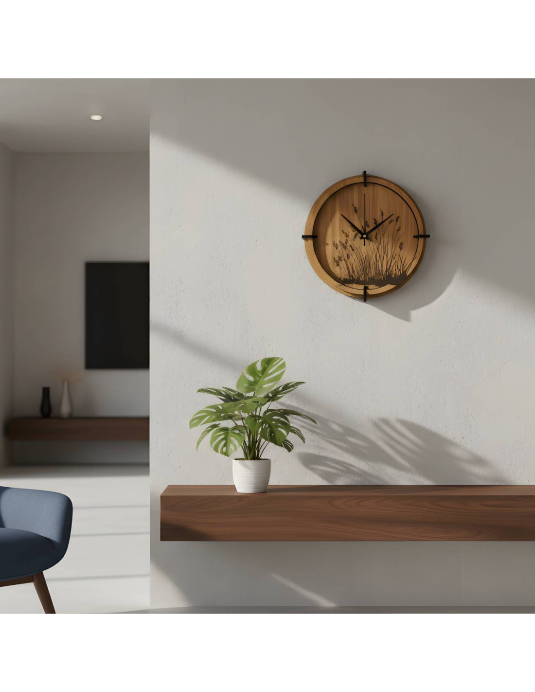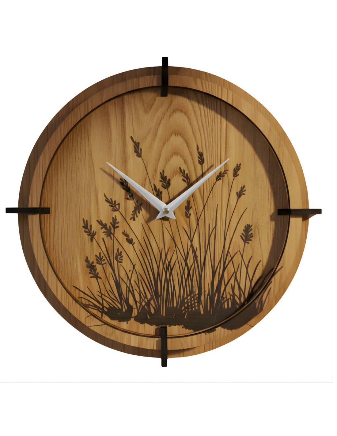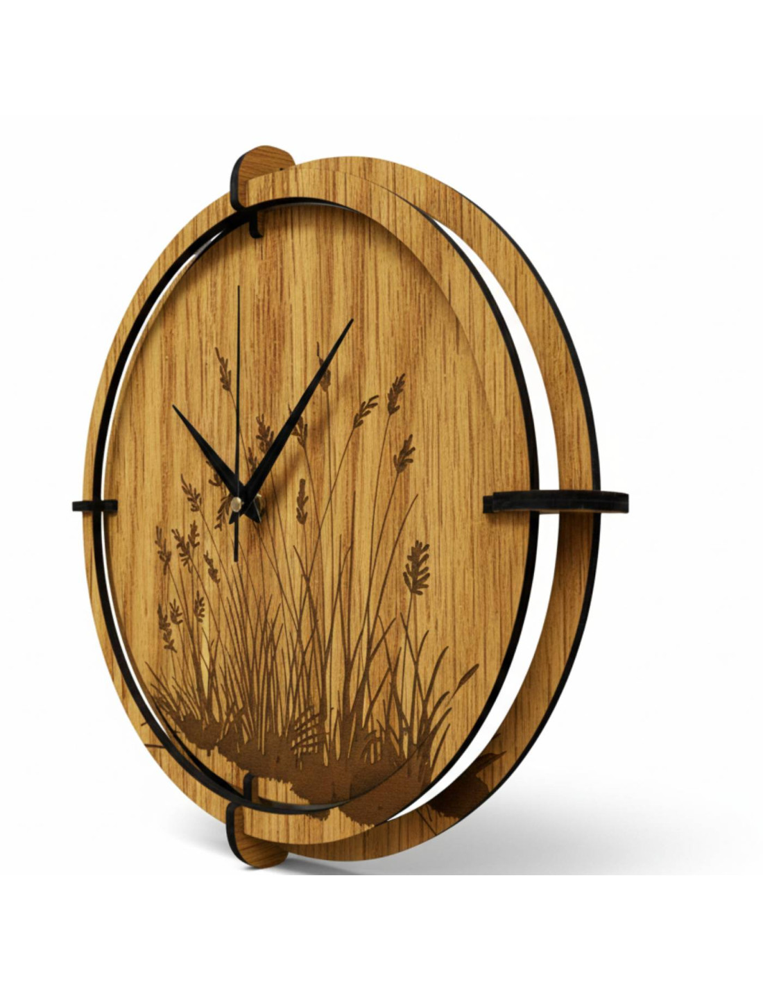 Dřevěné nástěnné hodiny s elegantním motivem luční trávy