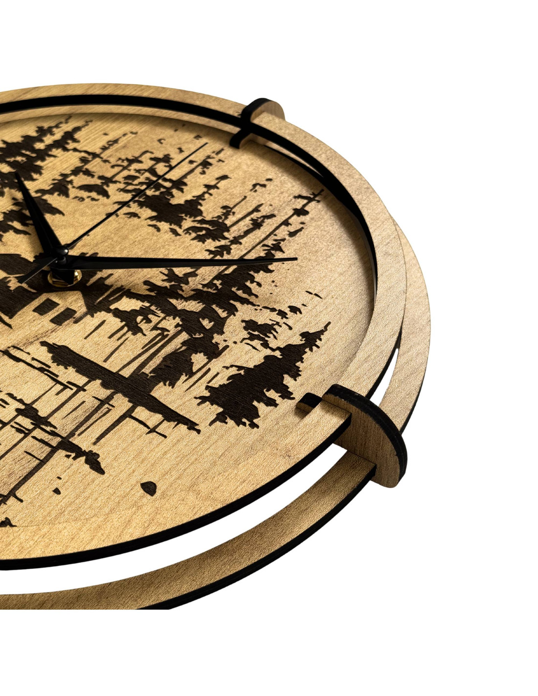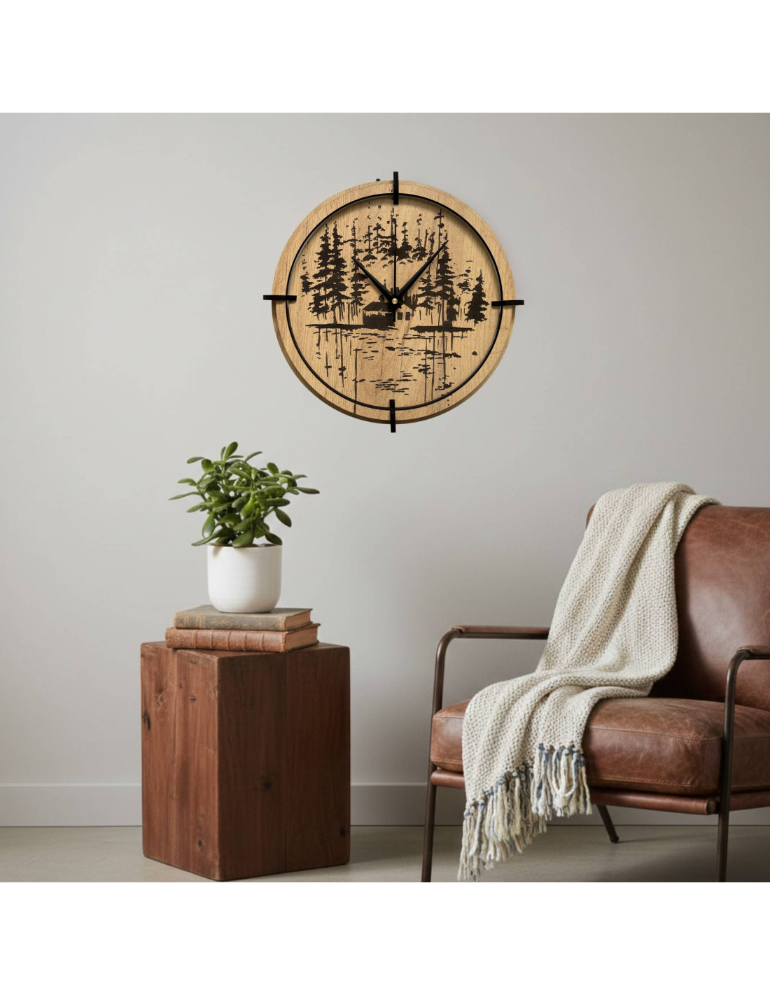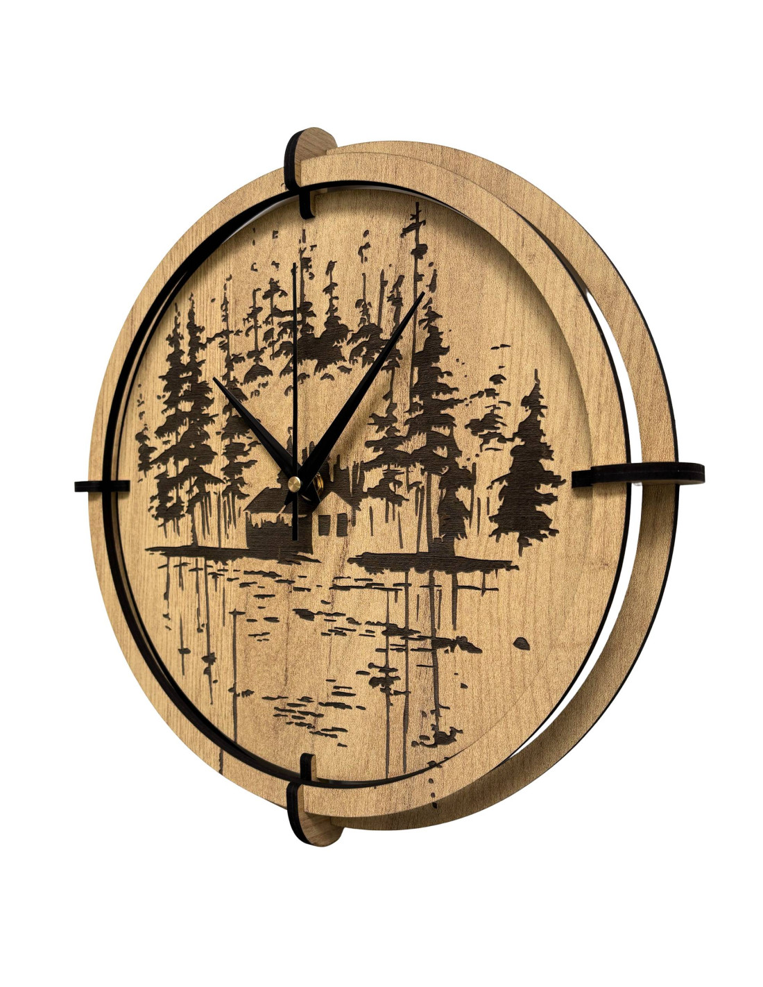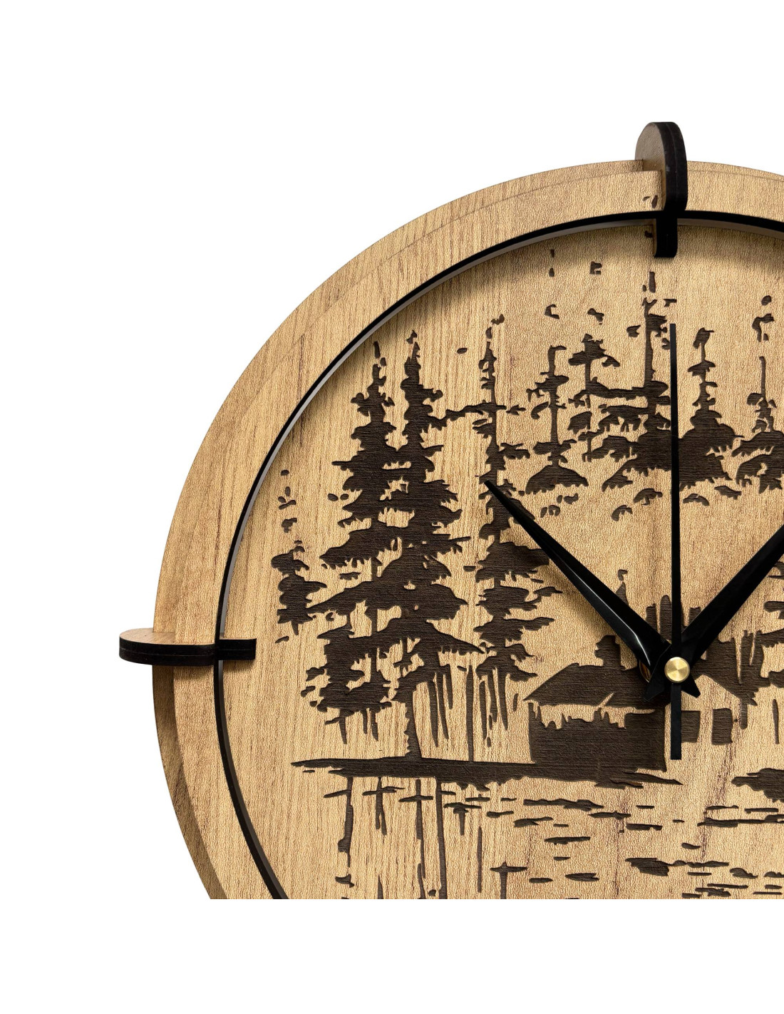 Moderní dřevěné nástěnné hodiny s precizně gravírovaným motivem lesní chatky u jezera vnášejí do interiéru klid přírody a jedinečnou atmosféru lesa .