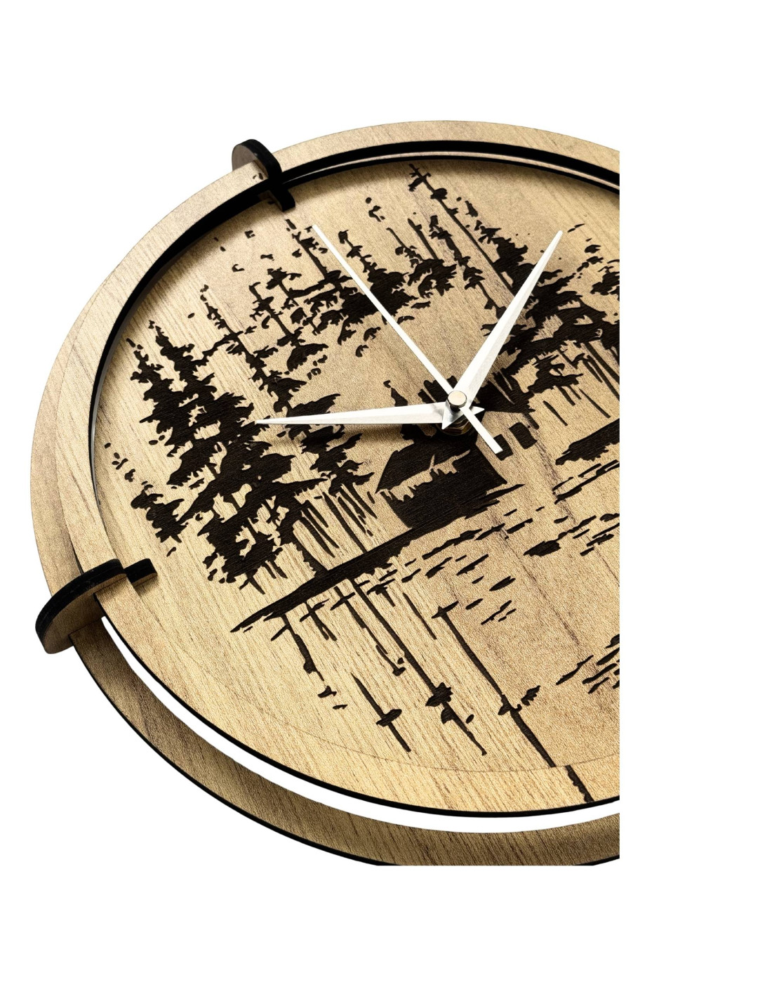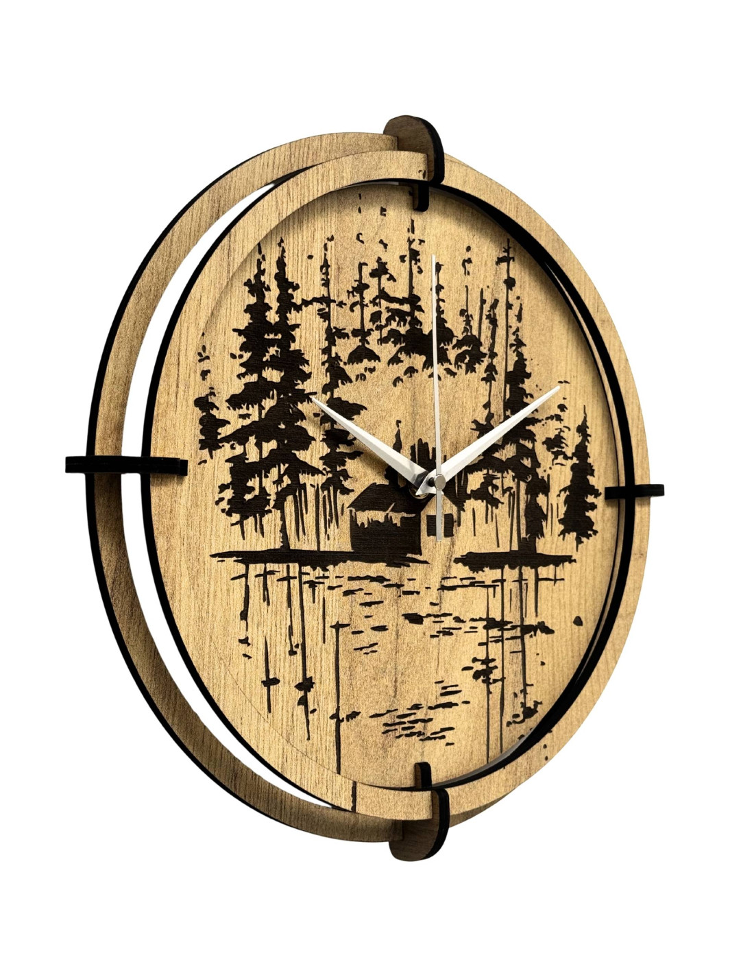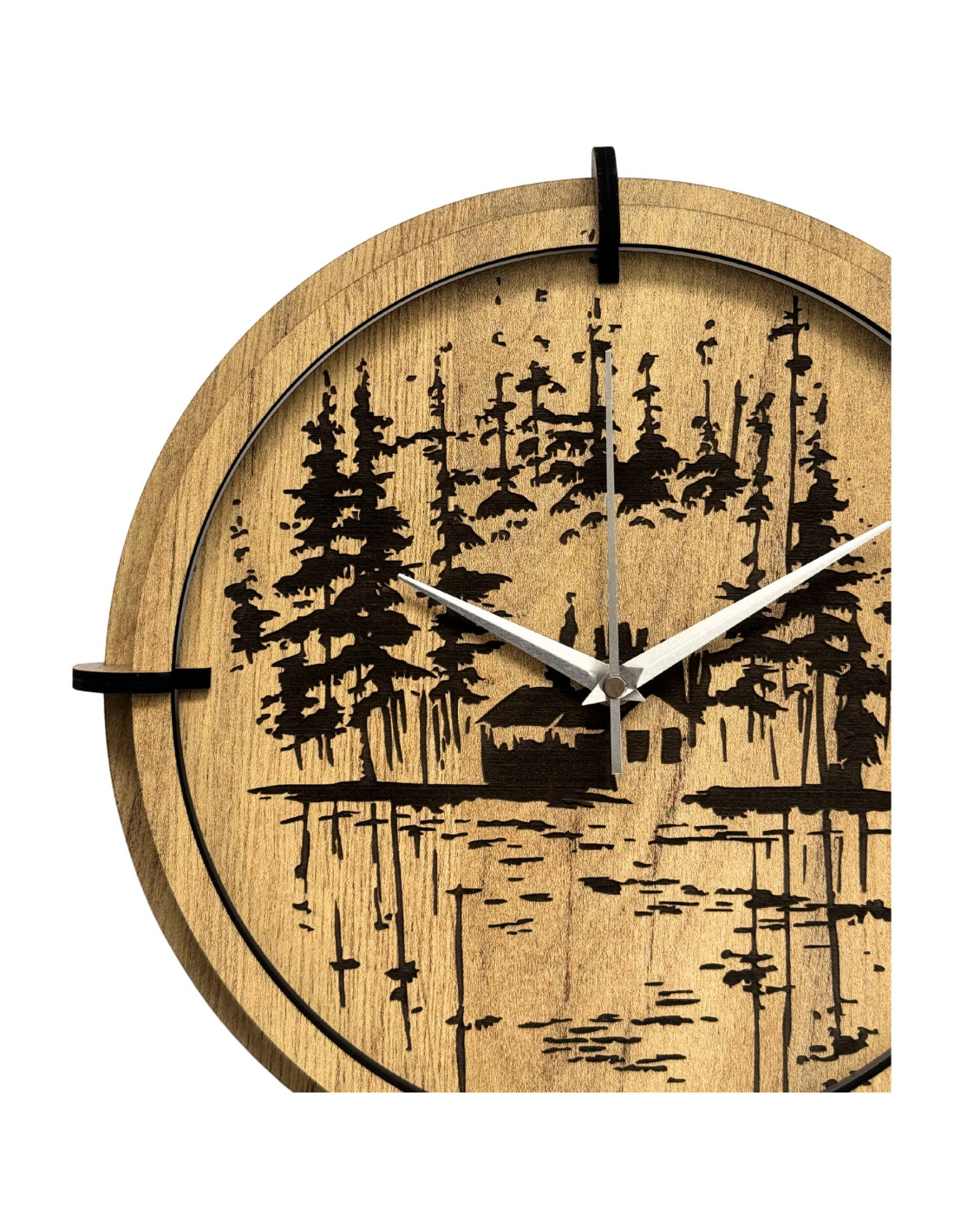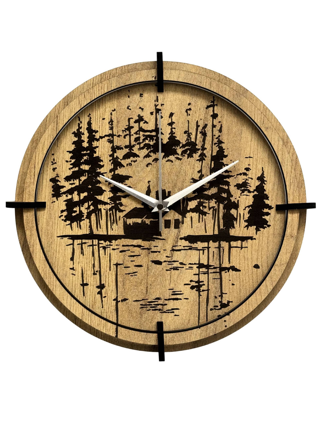 Moderní dřevěné nástěnné hodiny s precizně gravírovaným motivem lesní chatky u jezera vnášejí do interiéru klid přírody a jedinečnou atmosféru lesa .