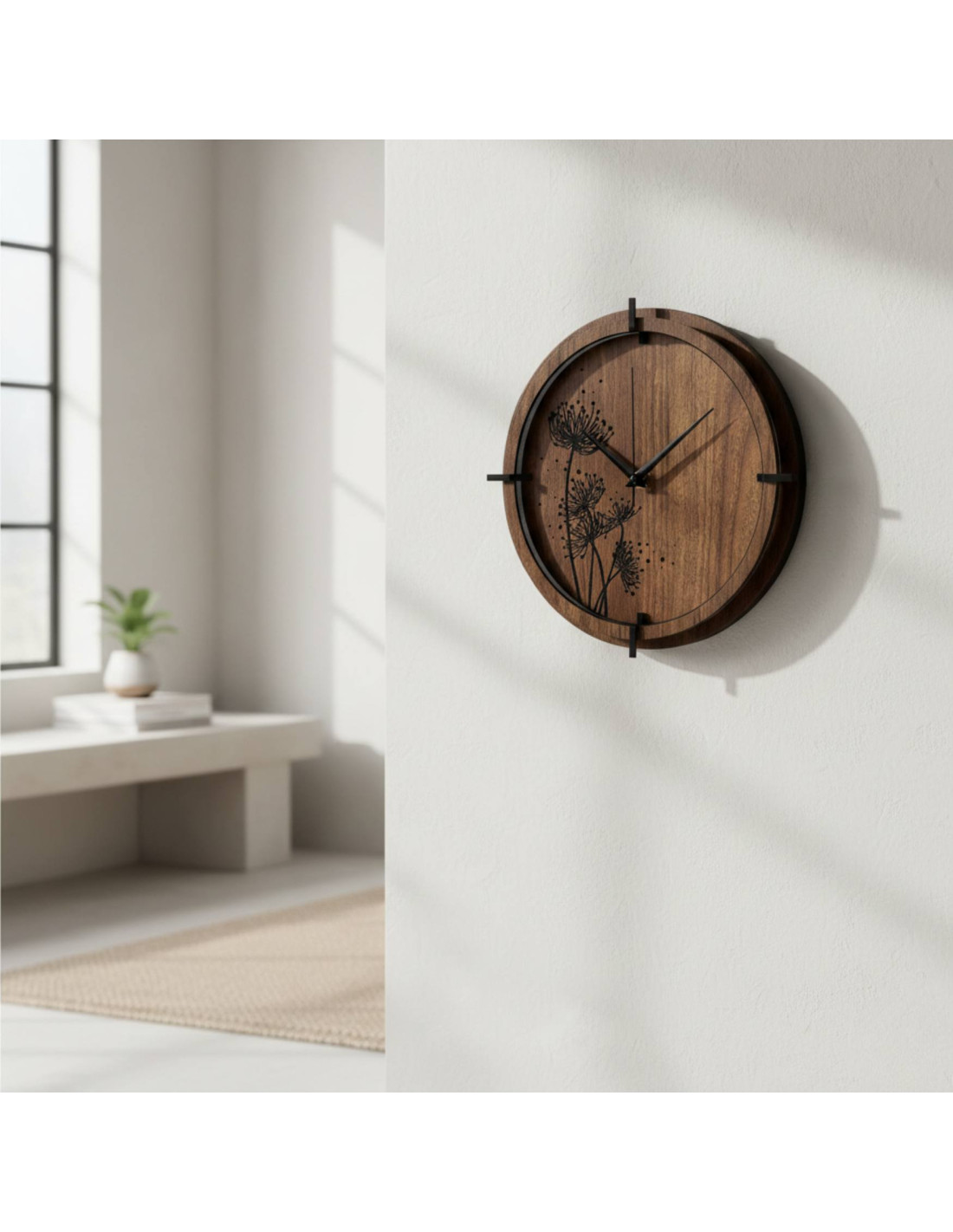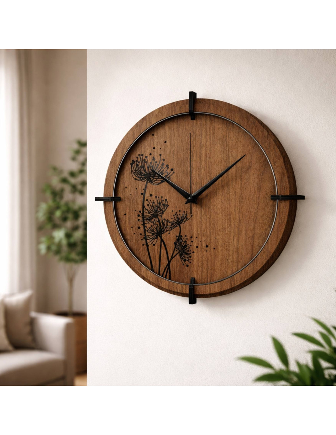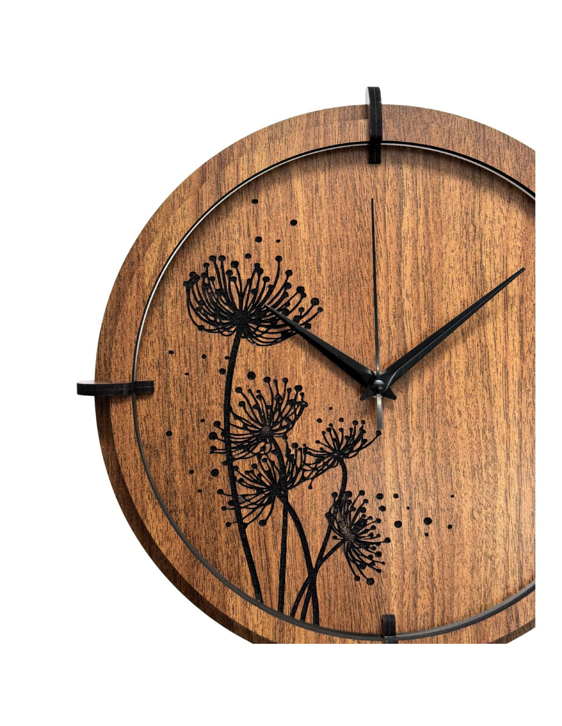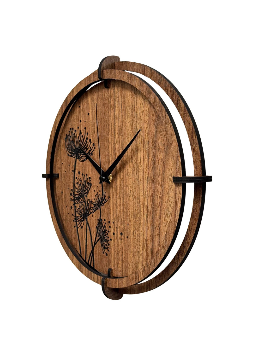 Gravírovaný květinový motiv s jemnými detaily působí moderně a harmonicky, zatímco černé, stříbrné ručičky a dřevěný kruh podtrhují jejich designový vzhled.