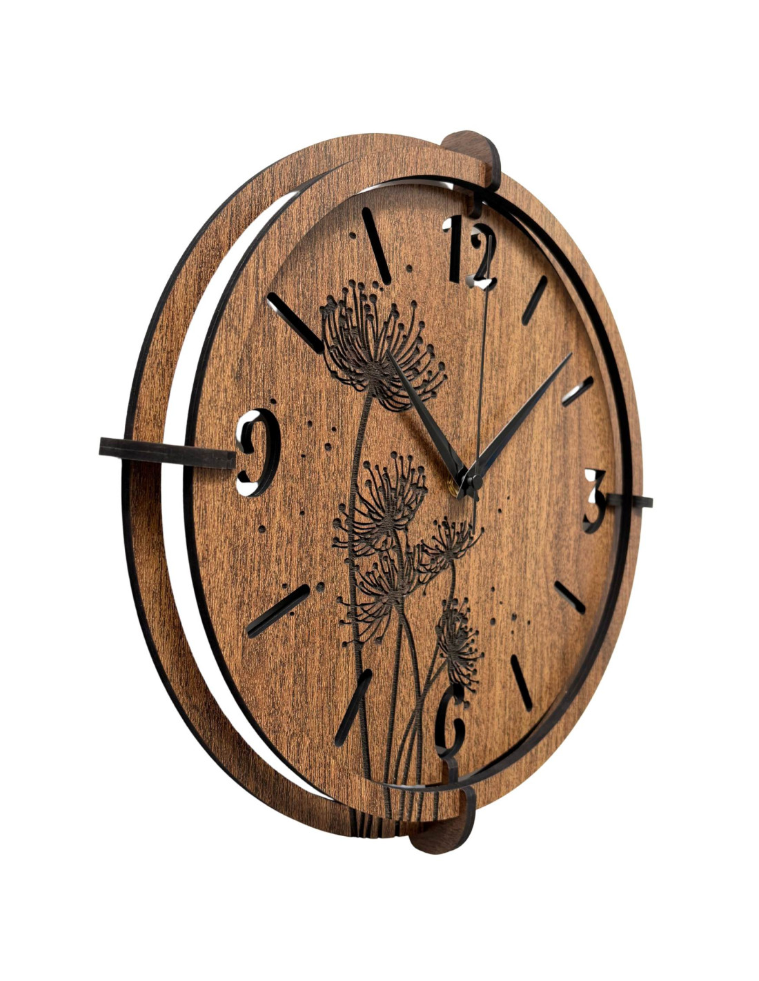 Vyrobeno z kvalitní HDF desky (wenge/ořech) s precizně vyřezávaným ciferníkem a stylovými ručičkami.