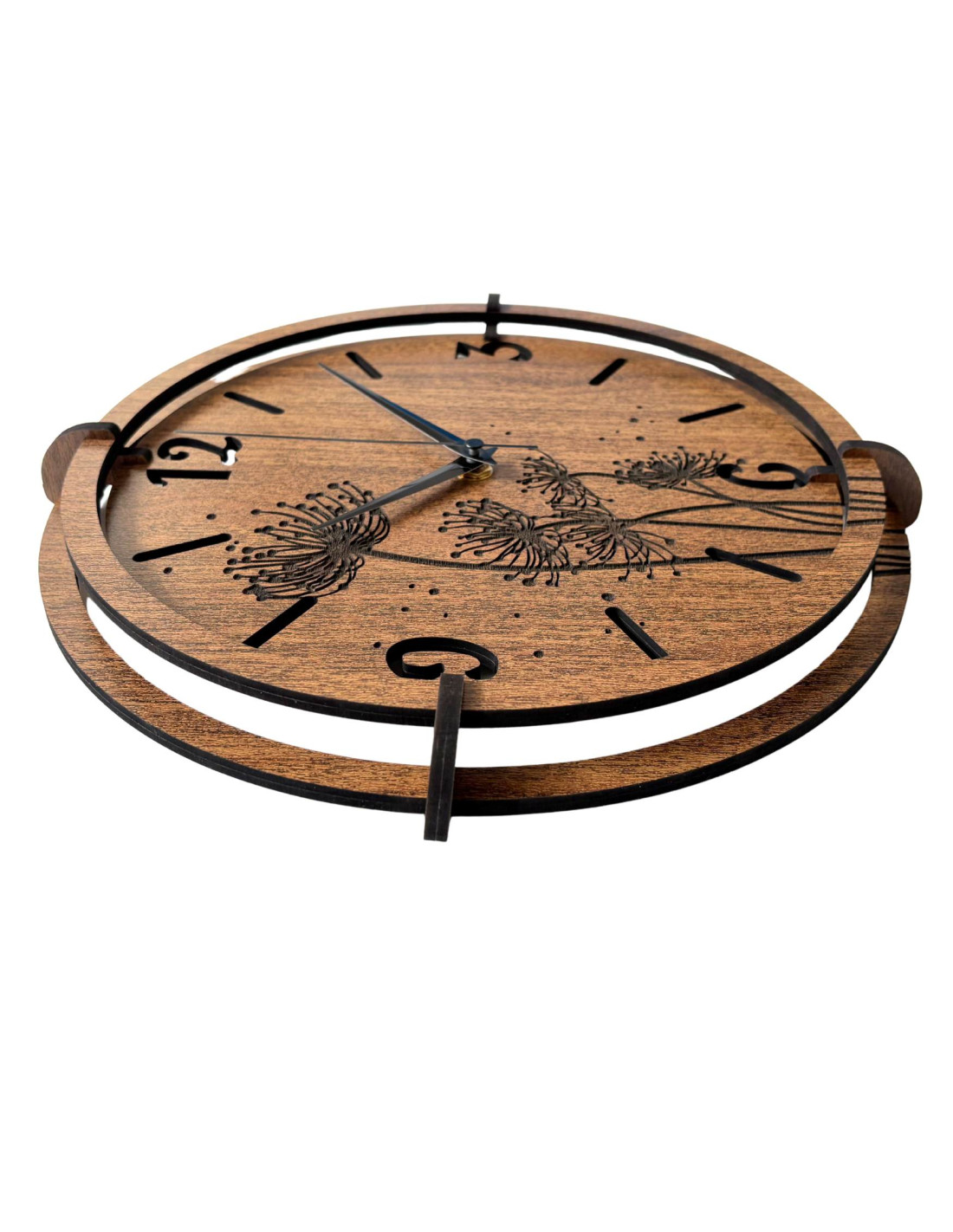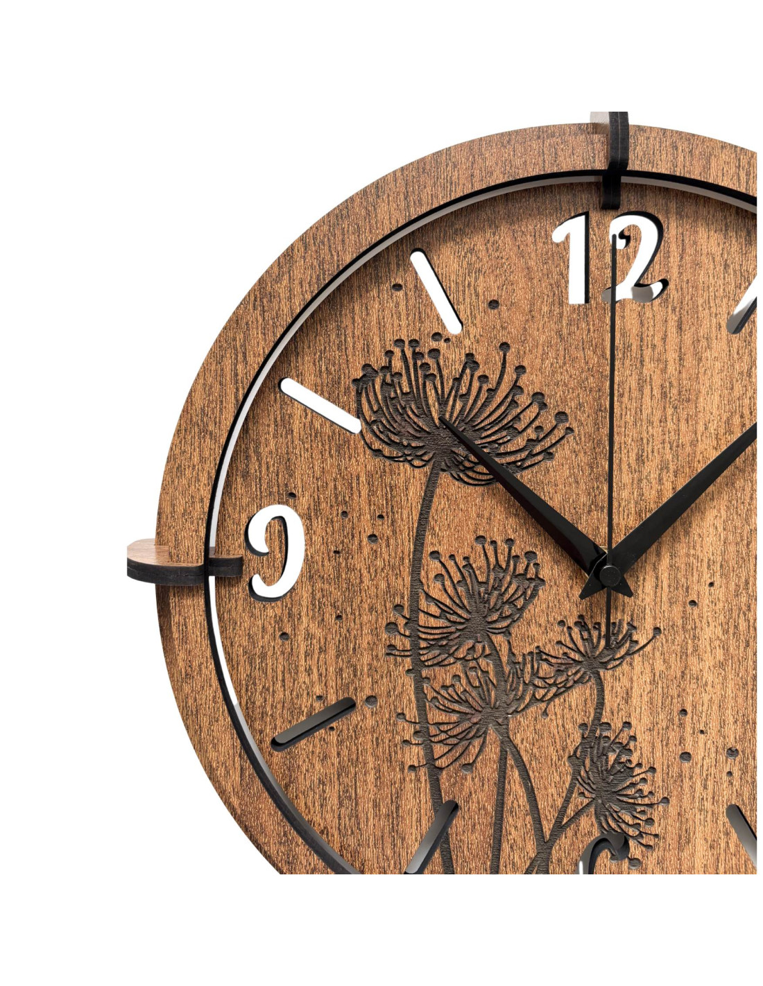 Detail gravírovaných pampelišek na dřevěných hodinách v dekoru ořech.