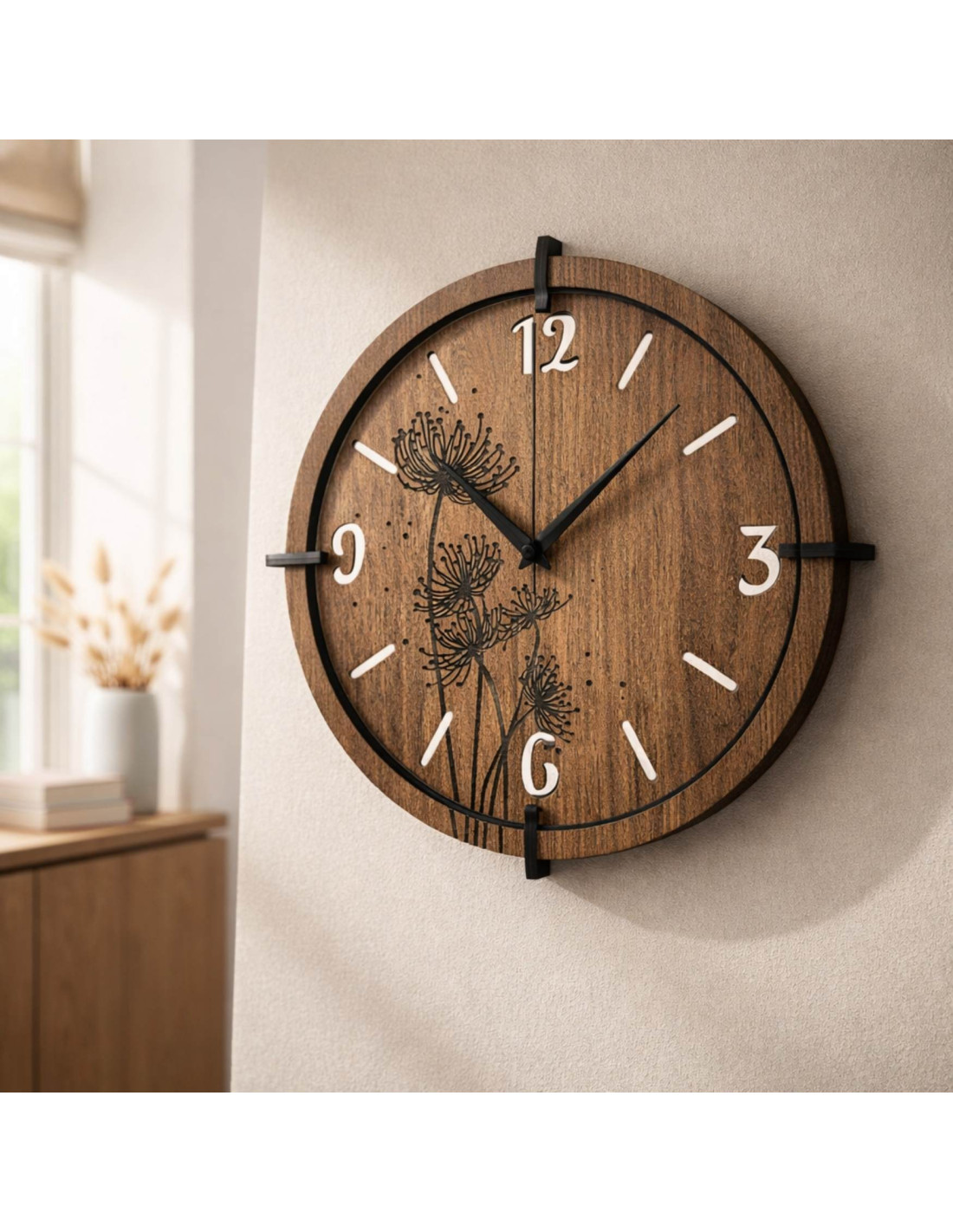 Moderní dřevěné nástěnné hodiny s motivem pampelišek a lučních trav vnesou do interiéru klid a harmonii .