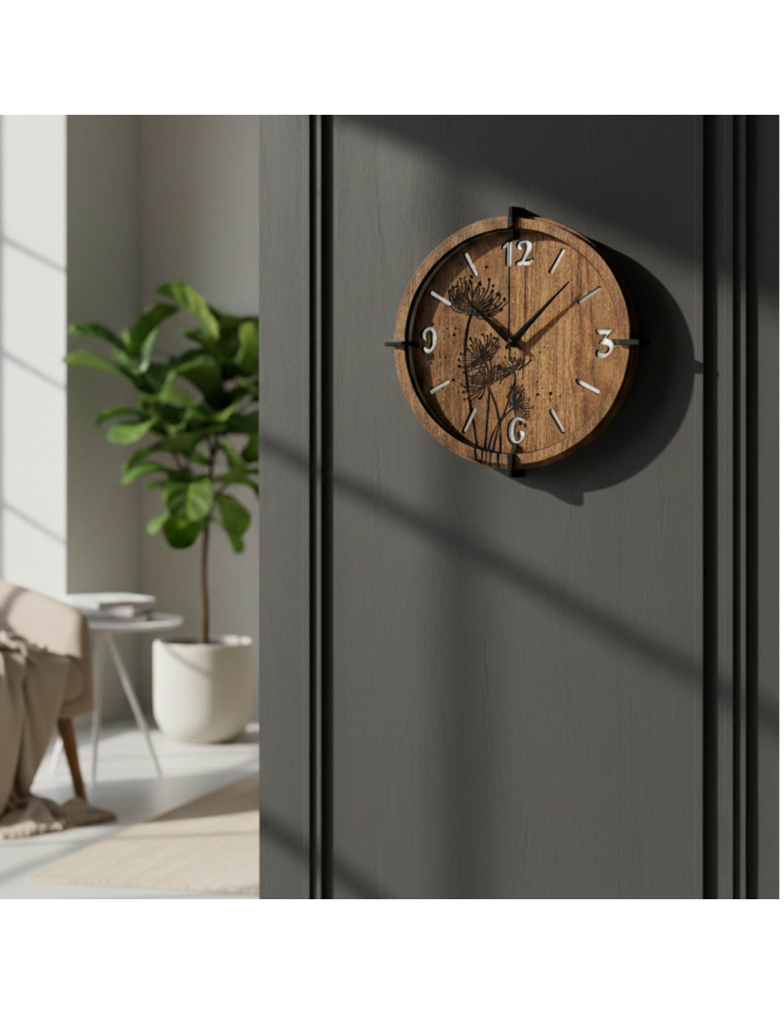 Jemné siluety rostlin a kontrastní ručičky vytvářejí uklidňující atmosféru vhodnou do obývacího pokoje, ložnice, kuchyně, pracovny či reprezentativní kanceláře.