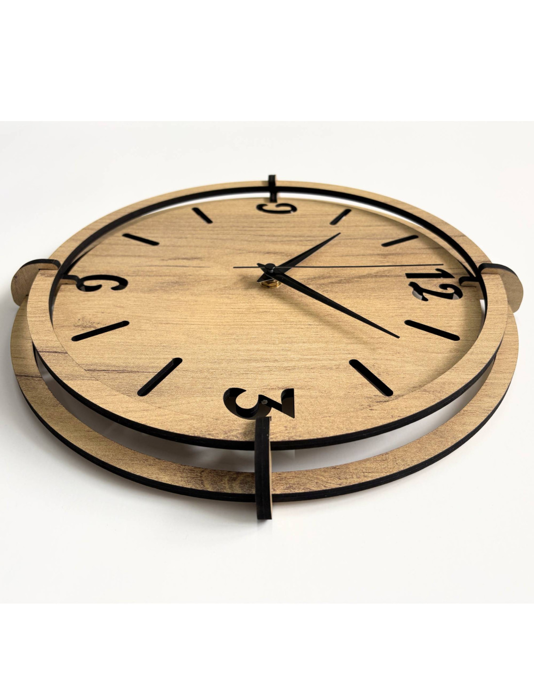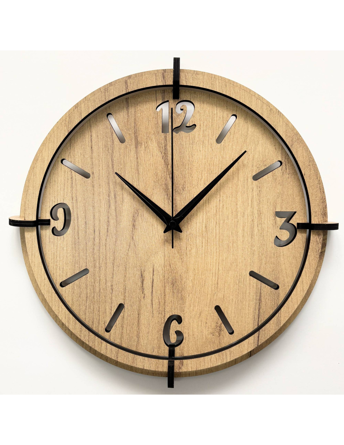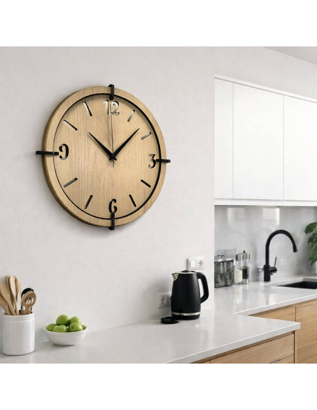 Moderní dřevěné nástěnné hodiny ve stylovém dubovém dekoru s výraznými černými prvky dodají interiéru elegantní a nadčasový charakter.
