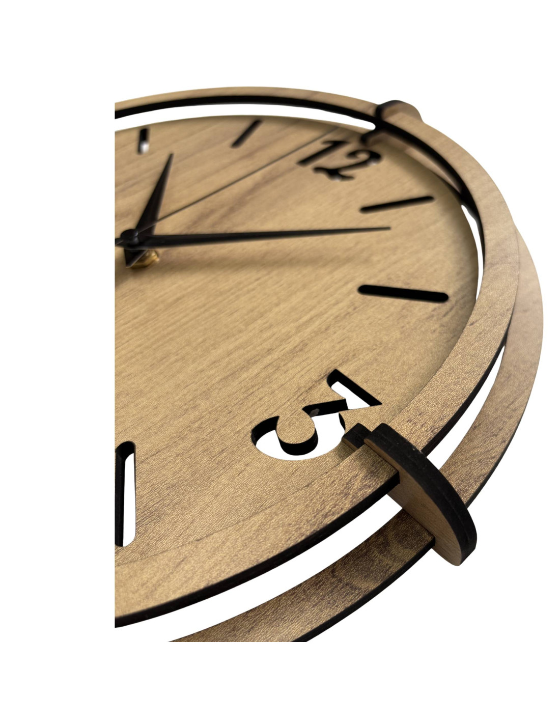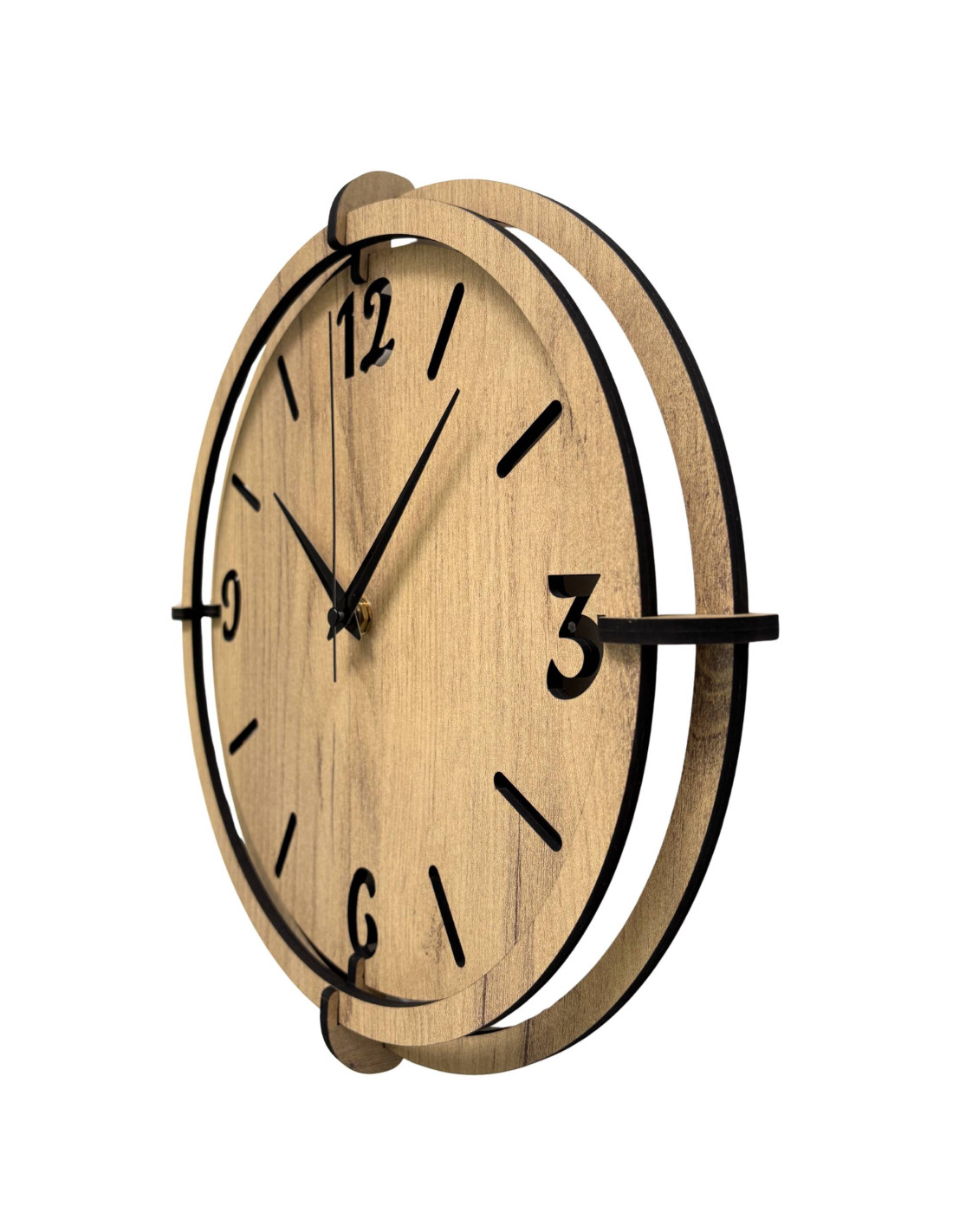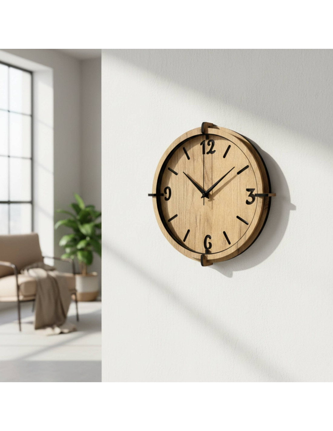 Moderní dřevěné nástěnné hodiny ve stylovém dubovém dekoru s výraznými černými prvky dodají interiéru elegantní a nadčasový charakter.