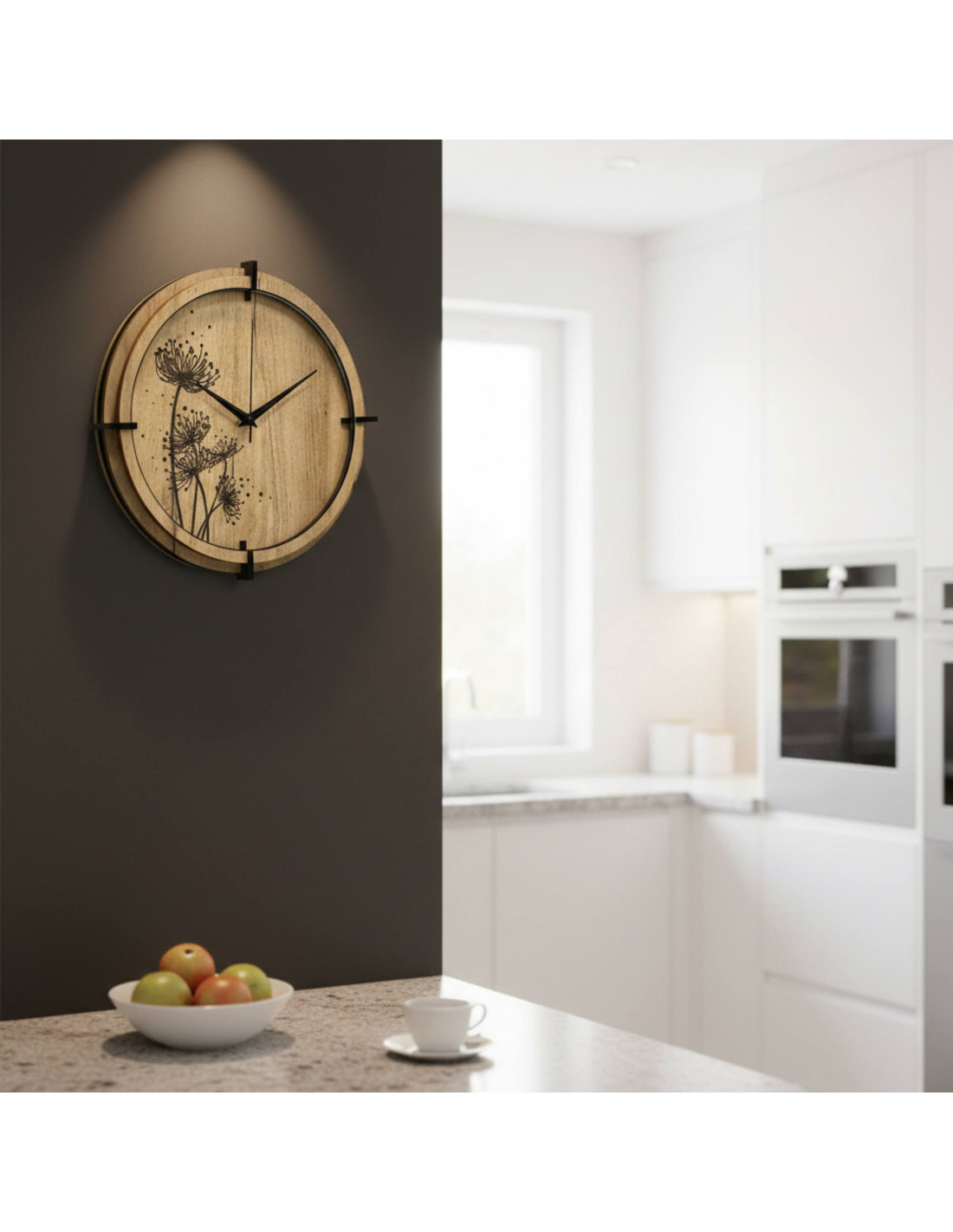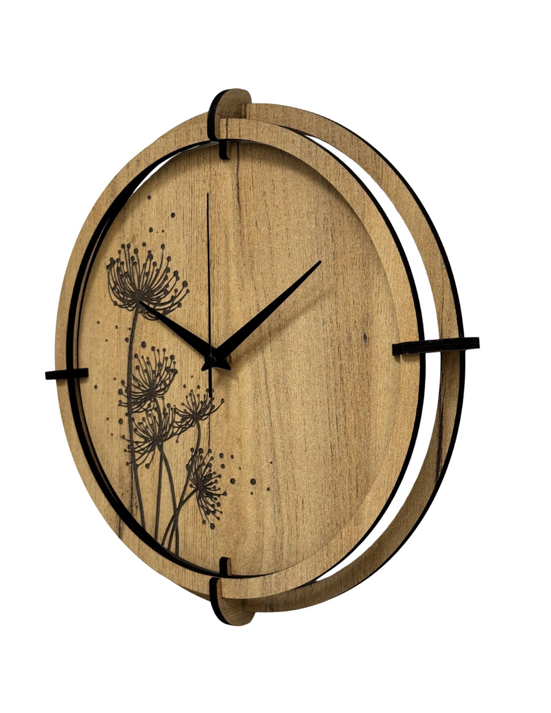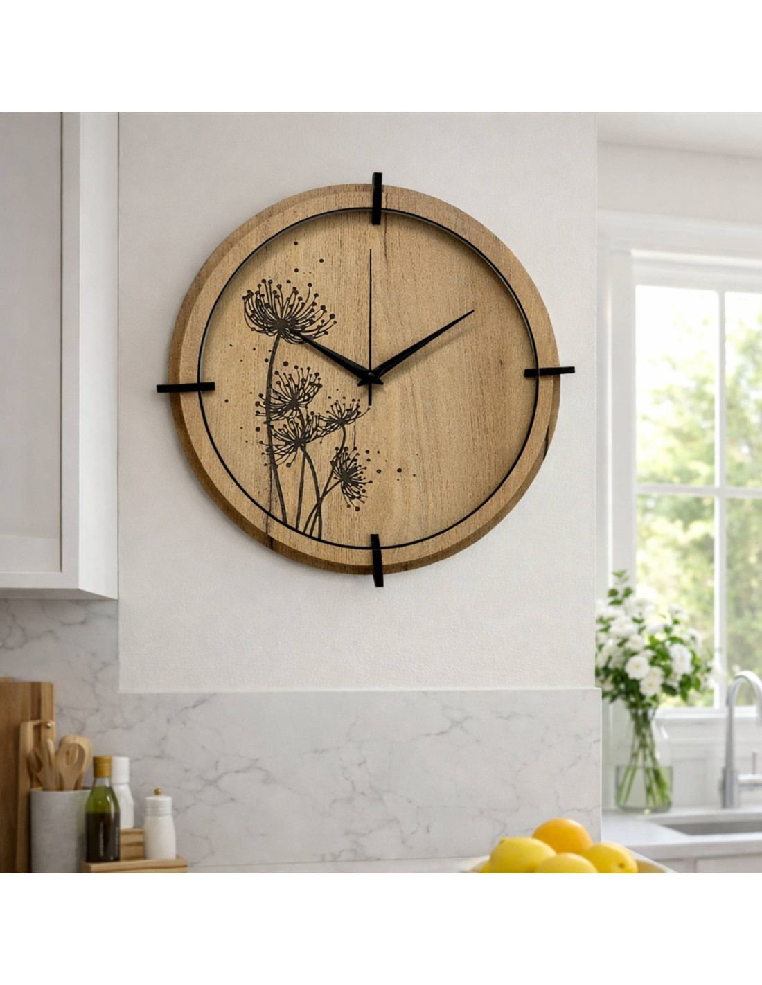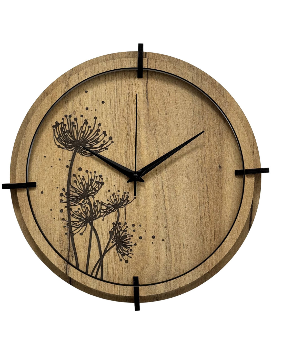 Dřevěné hodiny s gravírovaným rostlinným motivem spojují estetiku přírody s přesným měřením času a tichým chodem mechanismu.