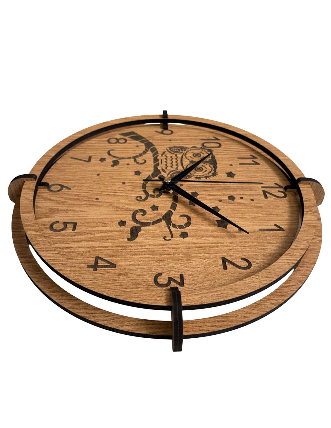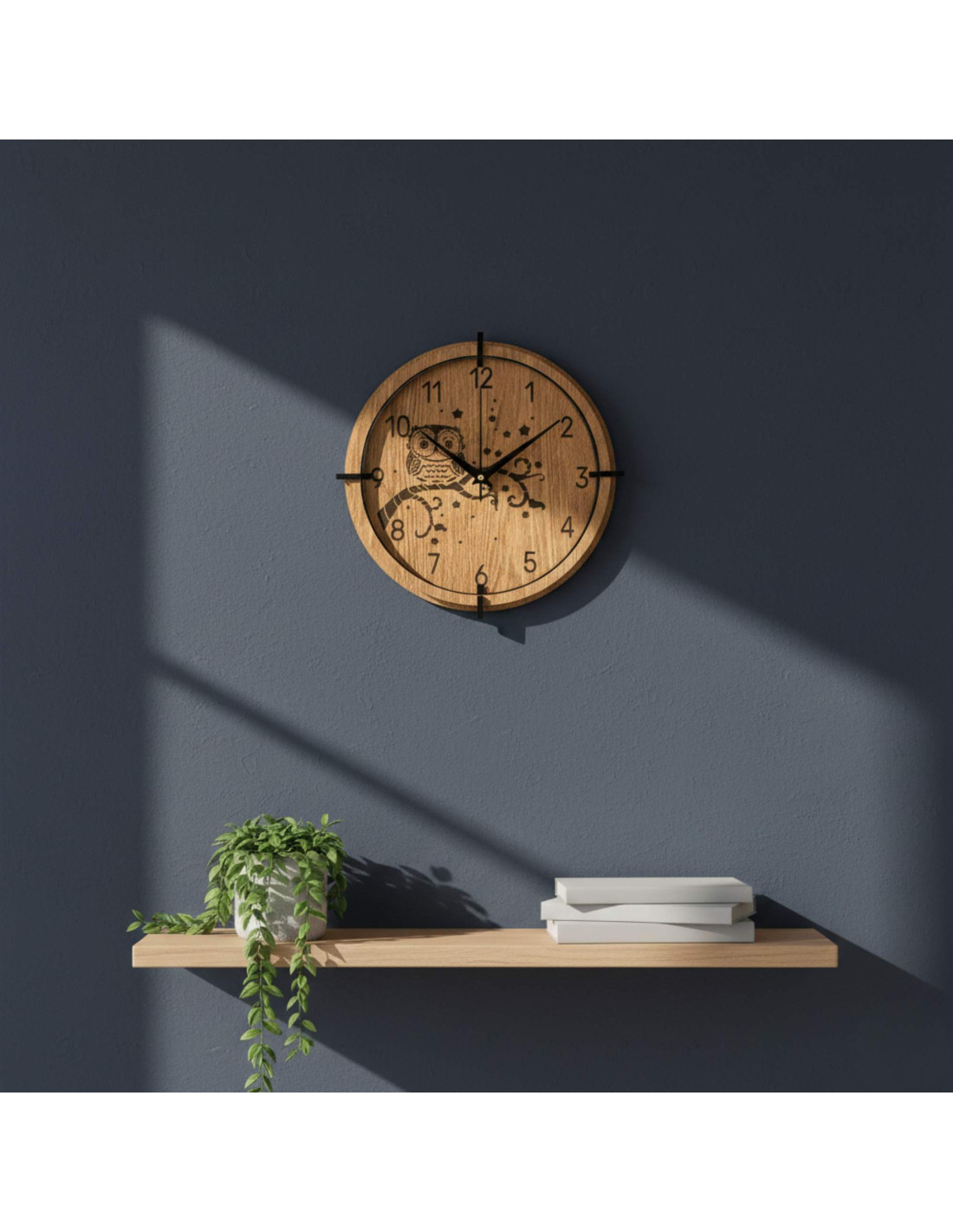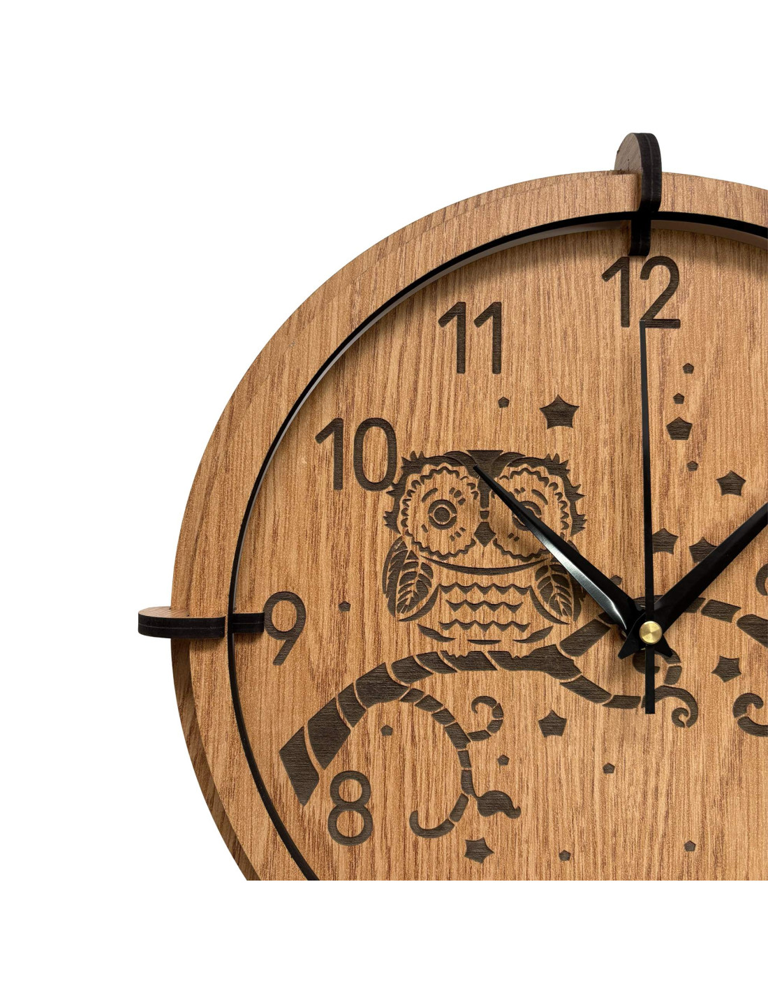 Moderní dřevěné nástěnné hodiny s detailně gravírovaným motivem sovy na větvi a noční oblohy vnesou do interiéru klid, teplo domova a jemný přírodní akcent .
