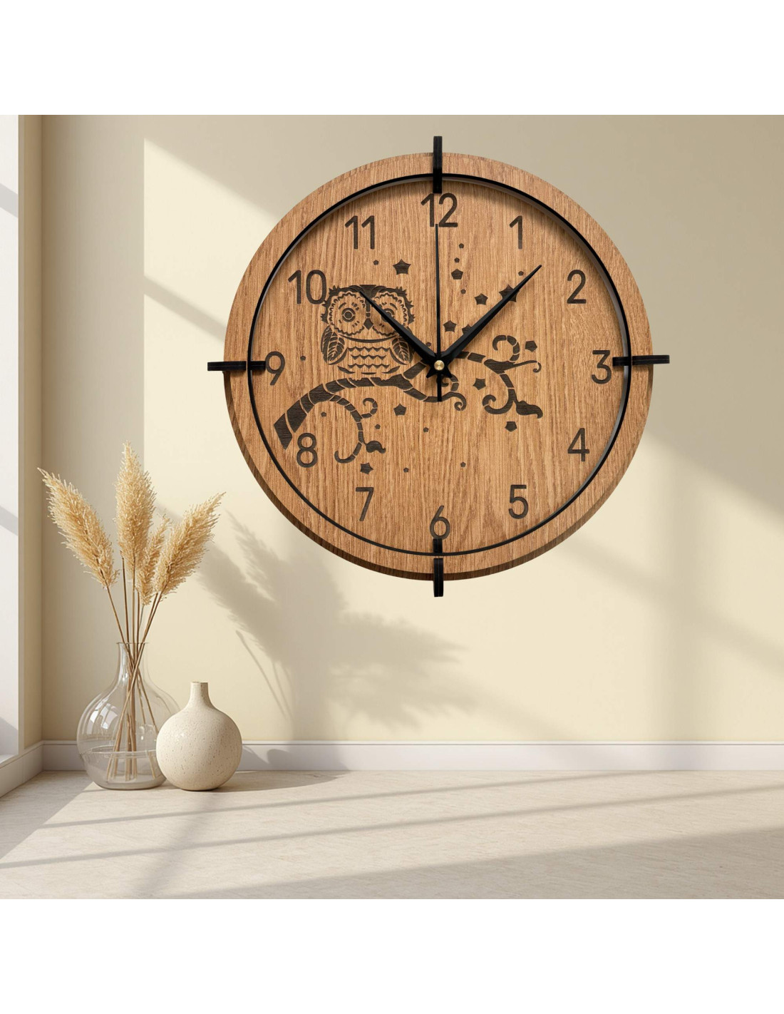 Dřevěné nástěnné hodiny se sovou – přírodní design s tichým chodem