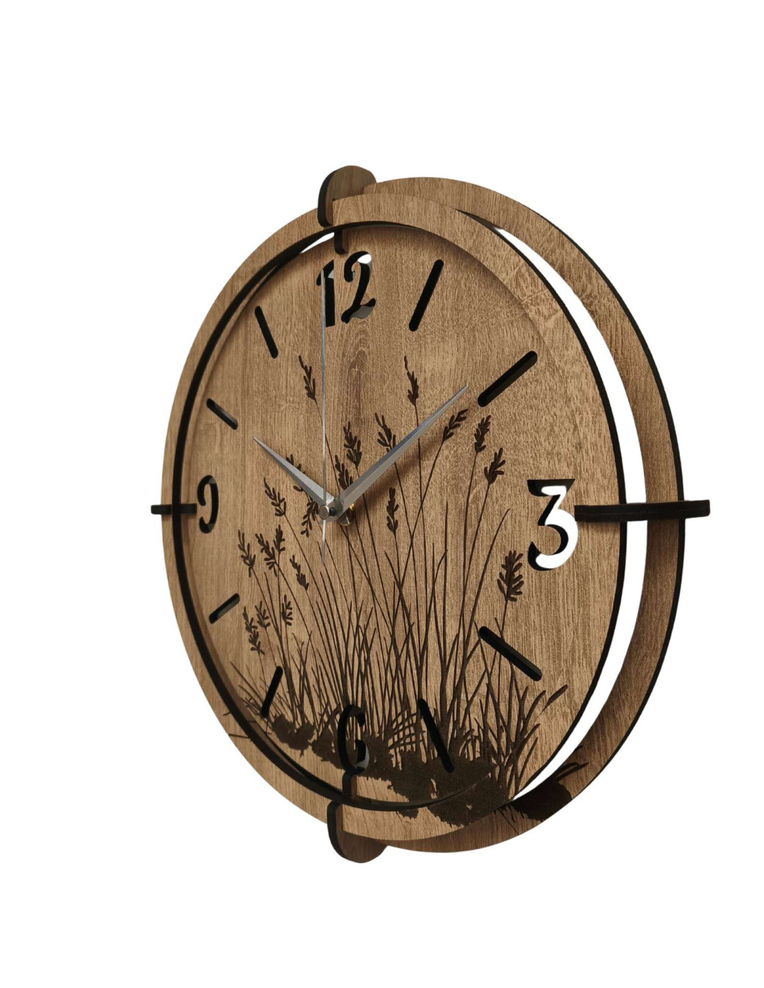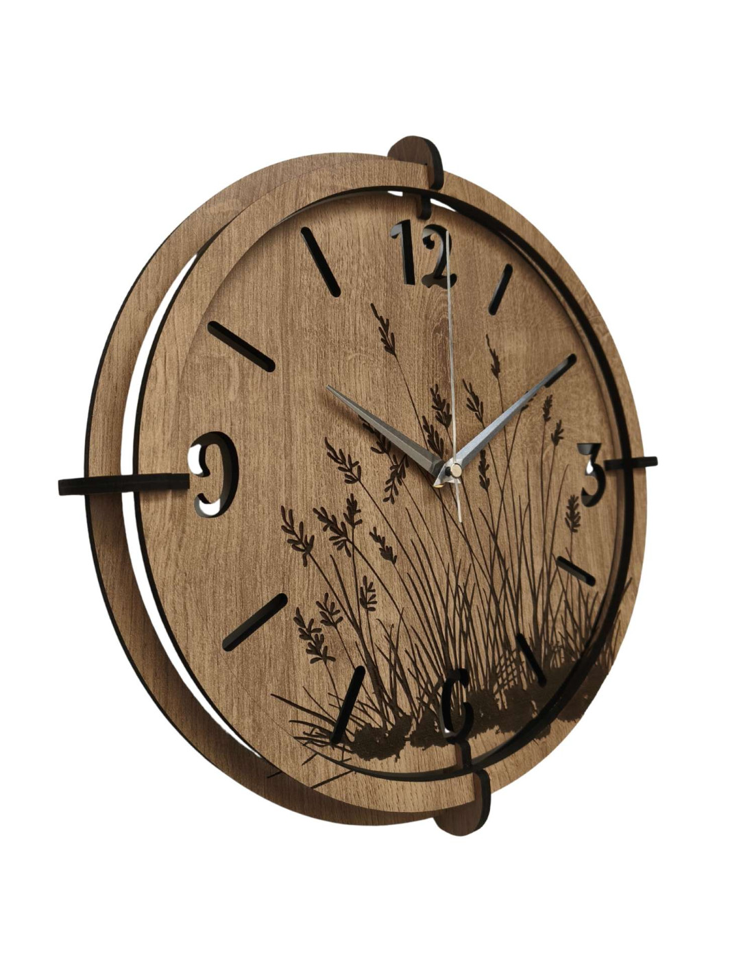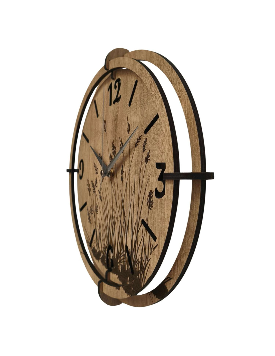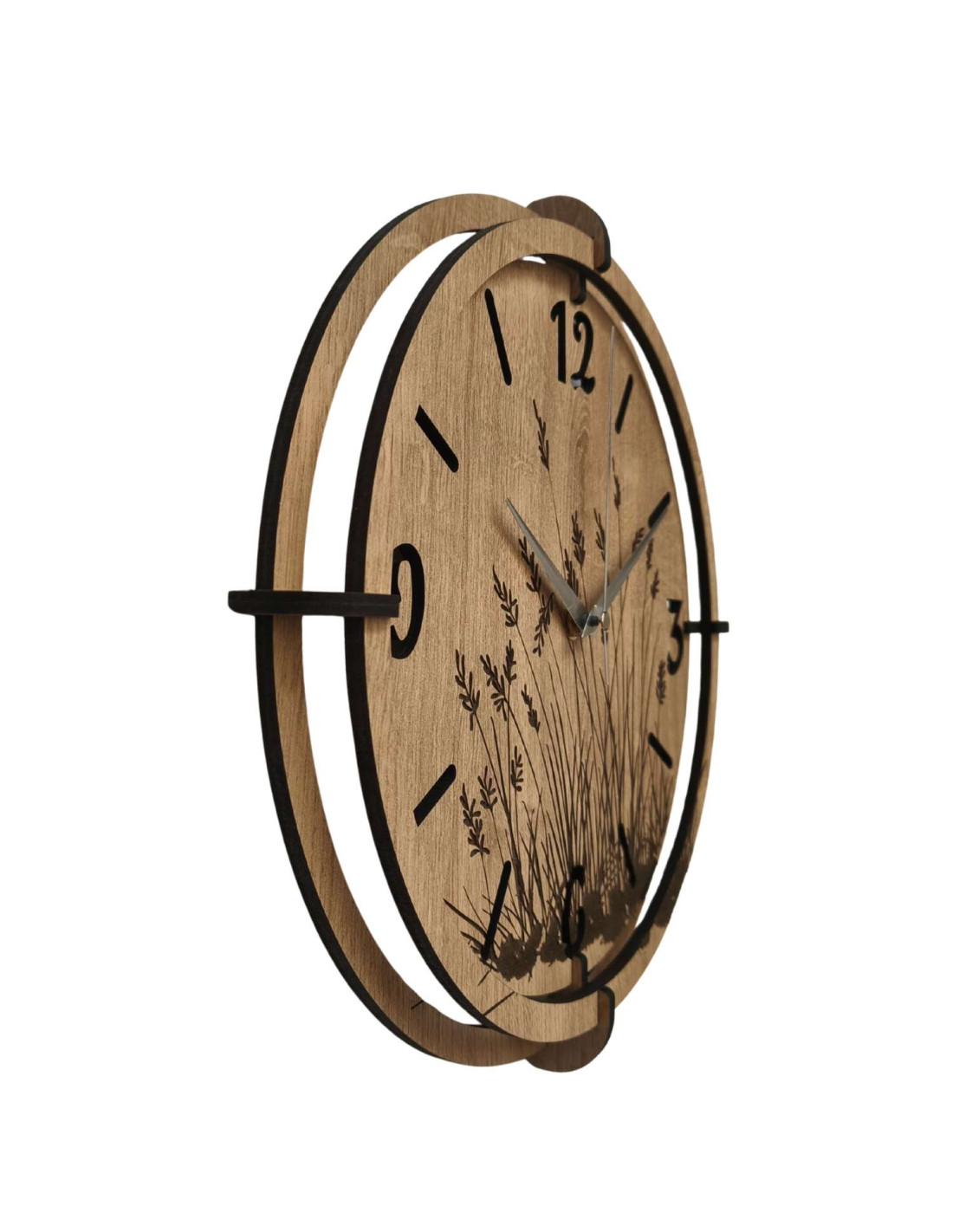 Moderní dřevěné nástěnné hodiny s jemným gravírovaným motivem lučních trav přinášejí do interiéru klid a harmonii .