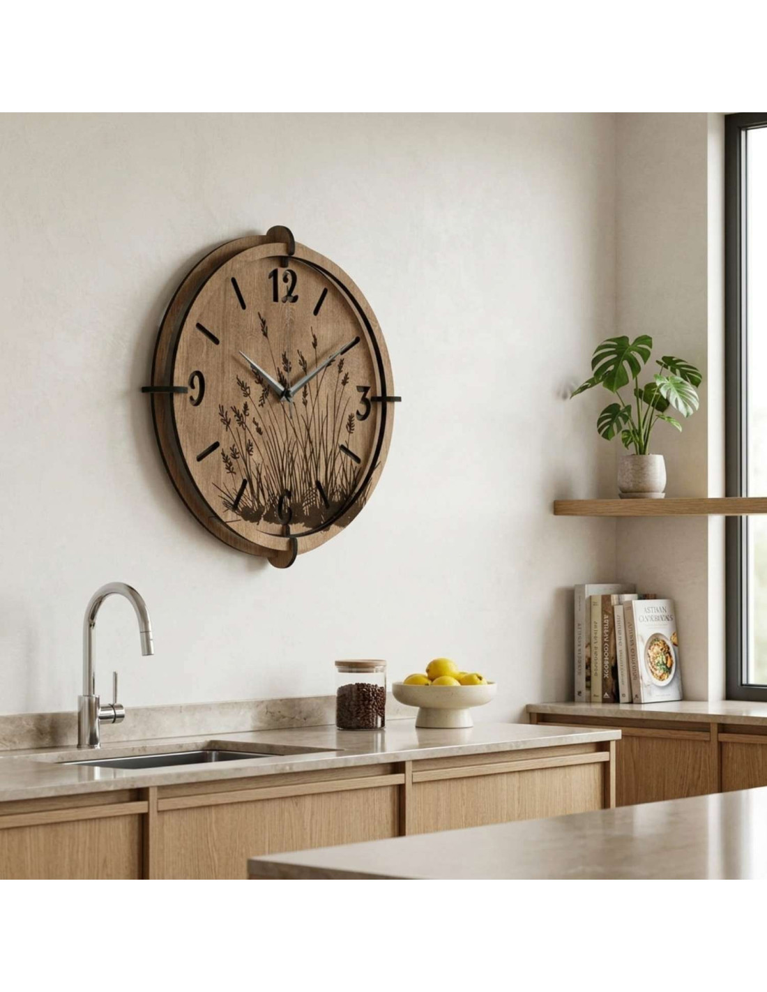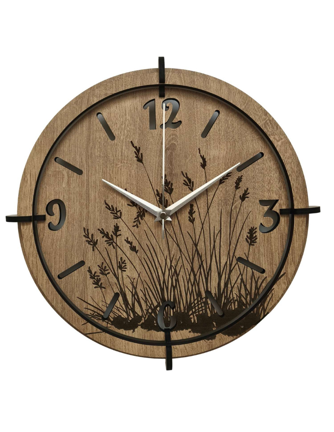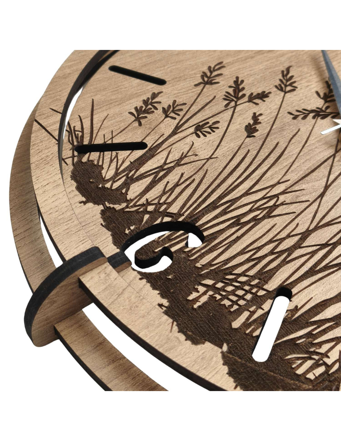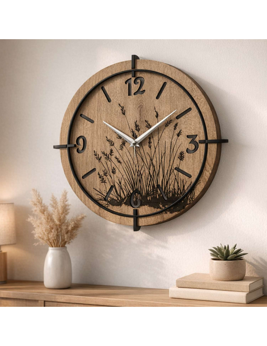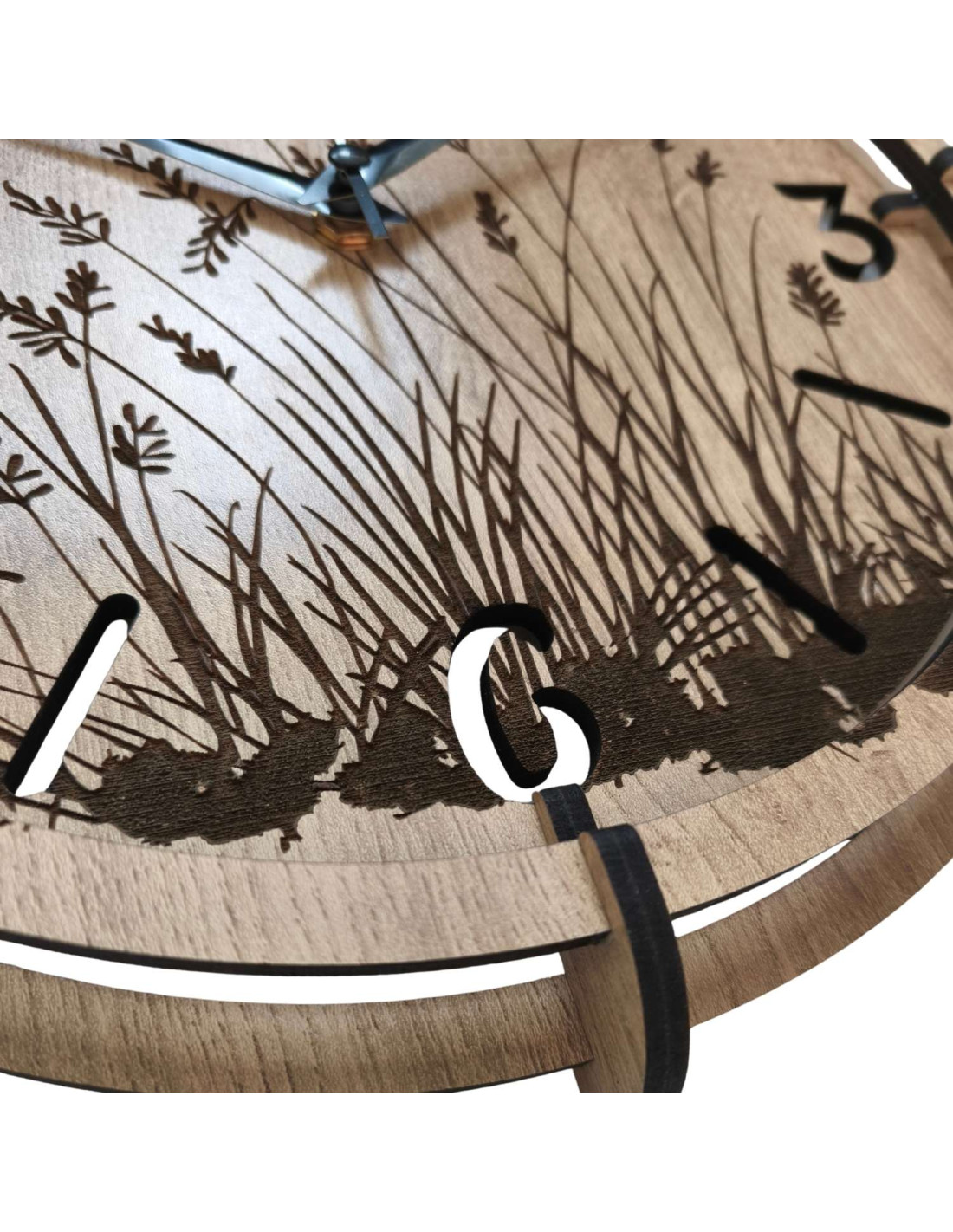 Moderní dřevěné nástěnné hodiny s jemným gravírovaným motivem lučních trav přinášejí do interiéru klid a harmonii .