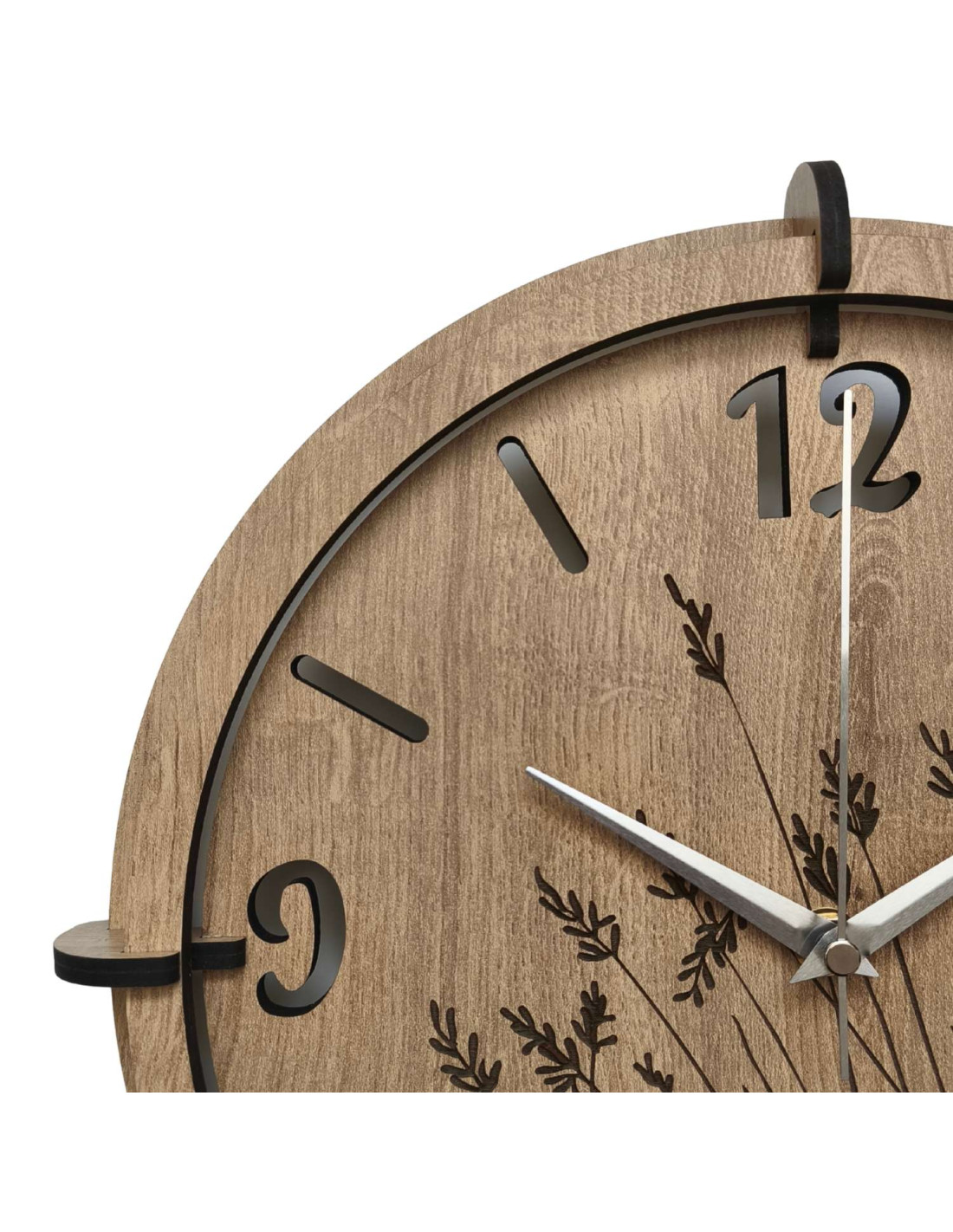 Hodiny jsou vyrobeny z kvalitní HDF desky s realistickou texturou dřeva a precizním laserovým gravírováním.