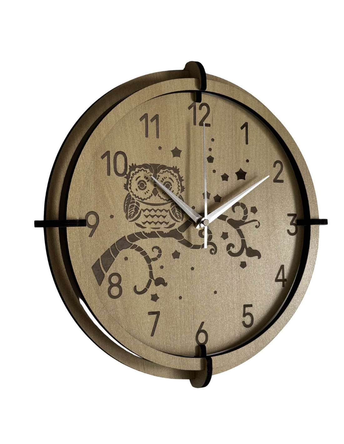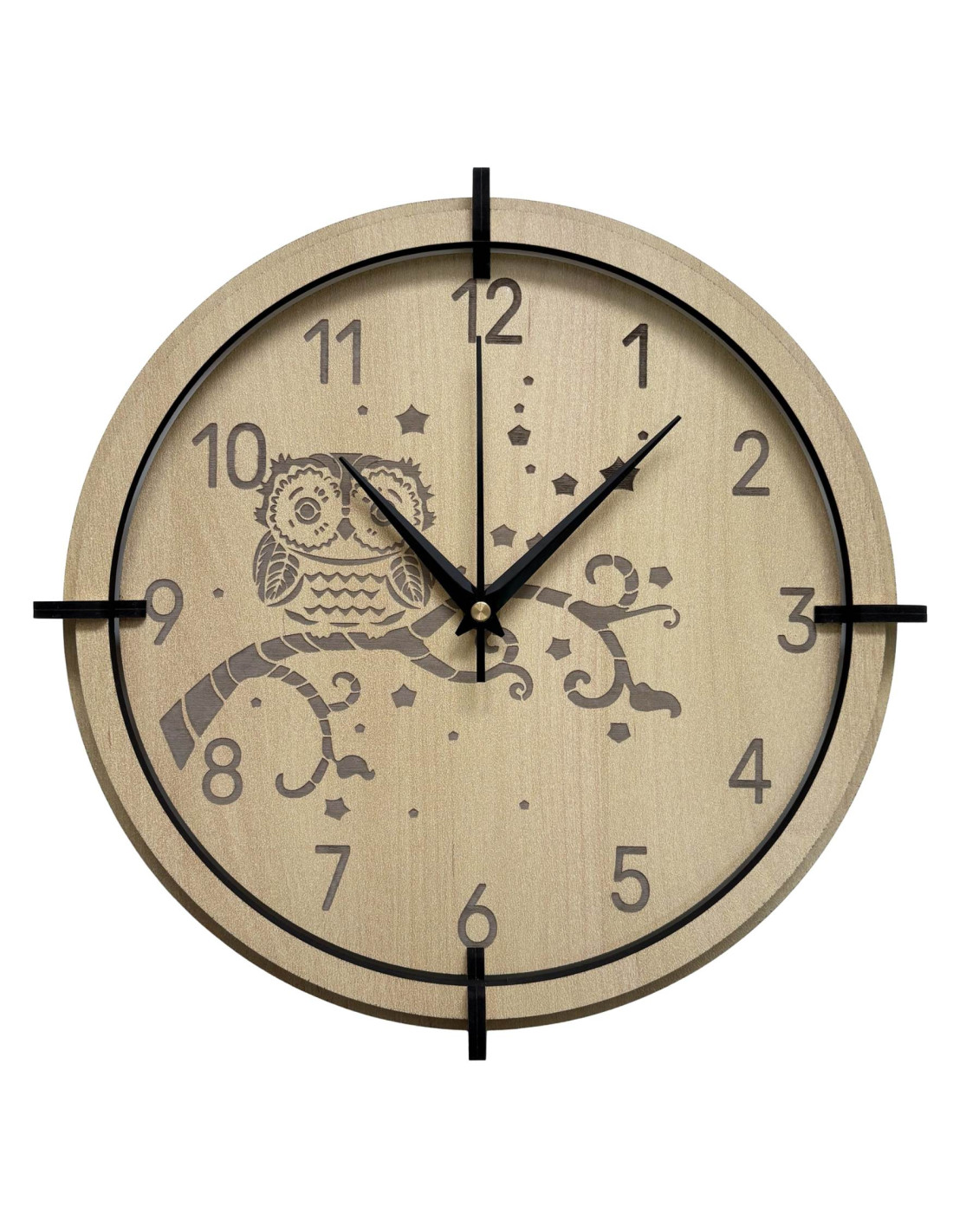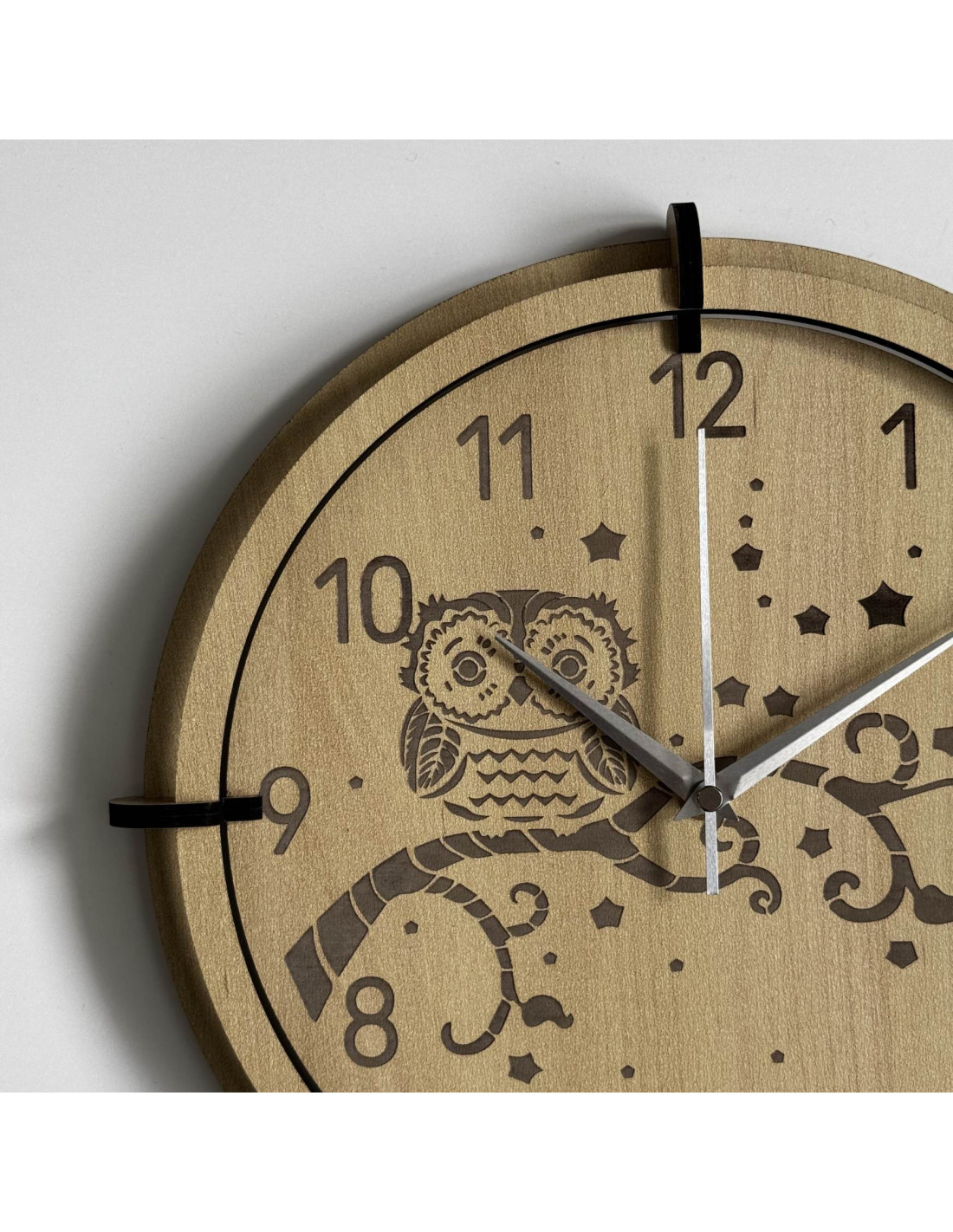 Moderní dřevěné nástěnné hodiny javor s jemným gravírovaným motivem sovy pro děti přinášejí do interiéru klid a harmonii .
