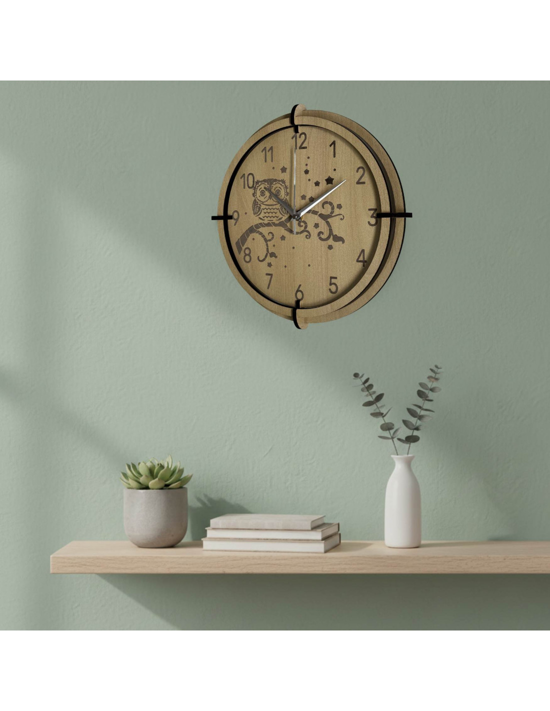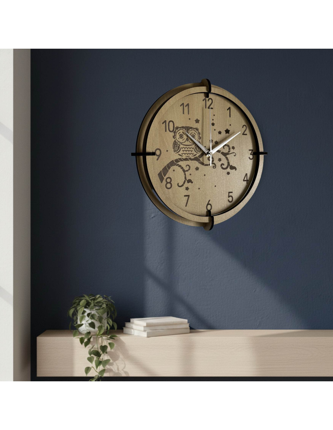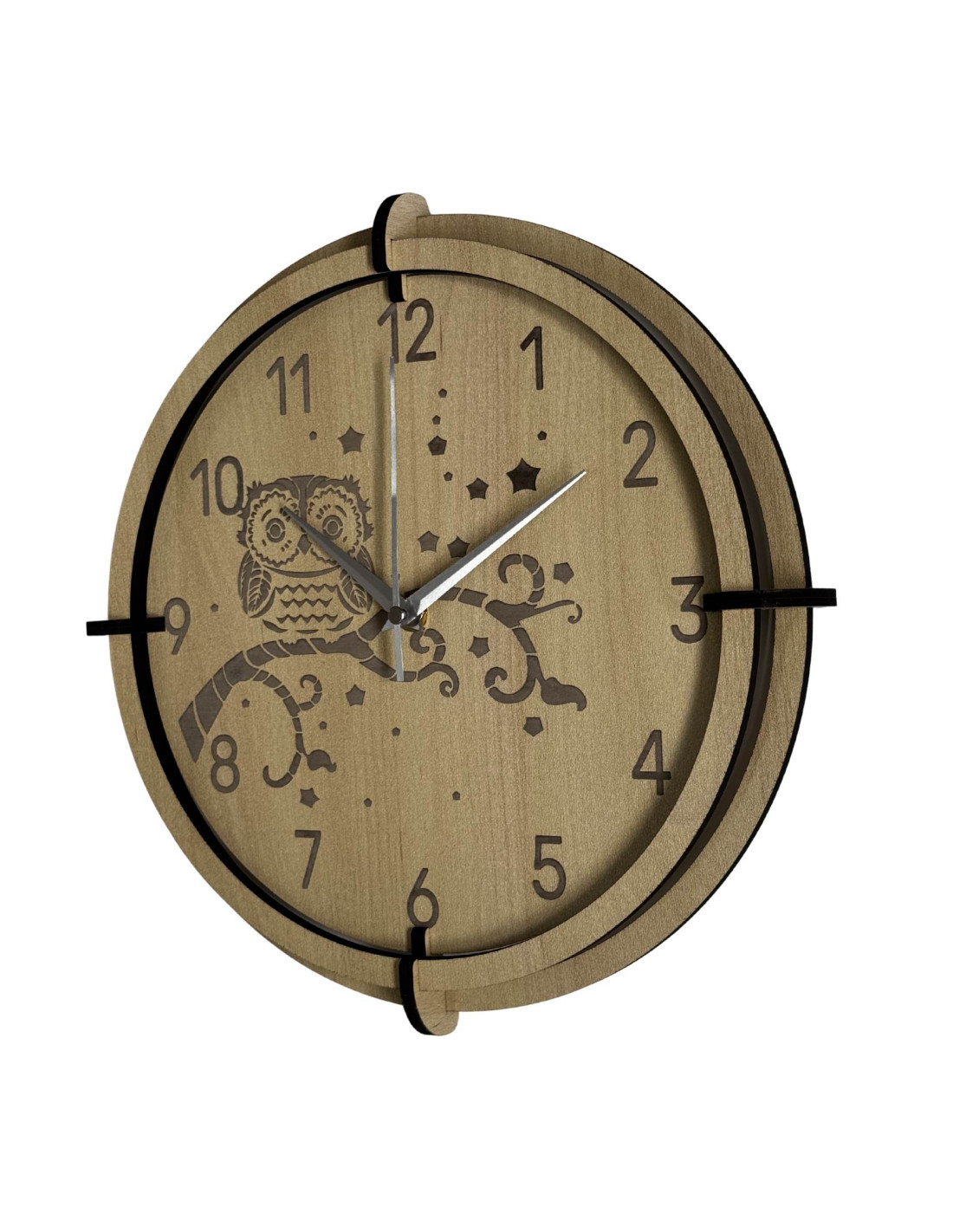 Moderní dřevěné nástěnné hodiny javor s jemným gravírovaným motivem sovy pro děti přinášejí do interiéru klid a harmonii .