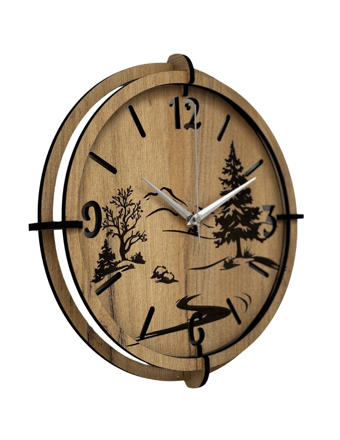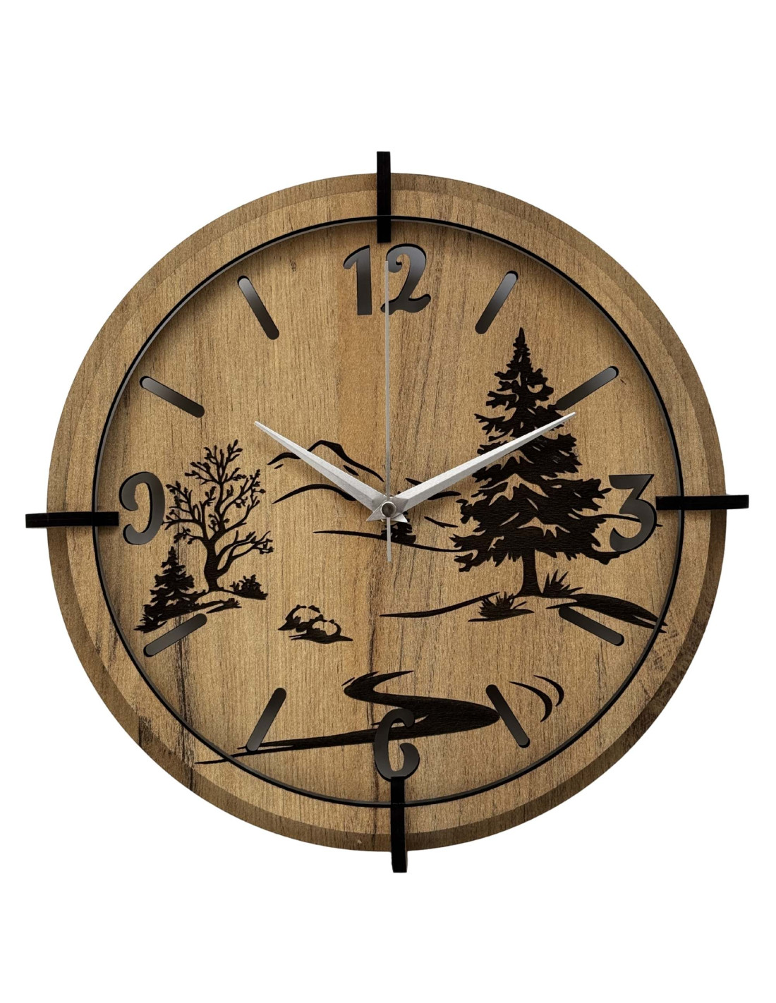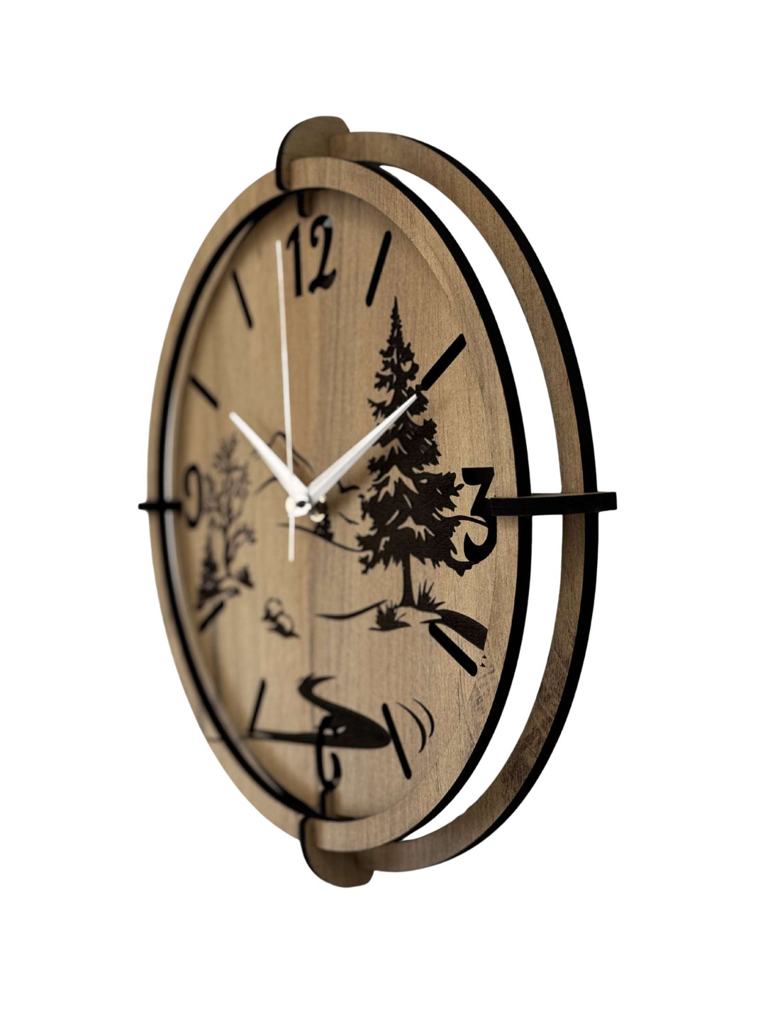 Dřevěné hodiny s precizním gravírováním krajiny spojují autentický vzhled přírody s moderním designem , kontrastními černými prvky a spolehlivým tichým mechanismem.