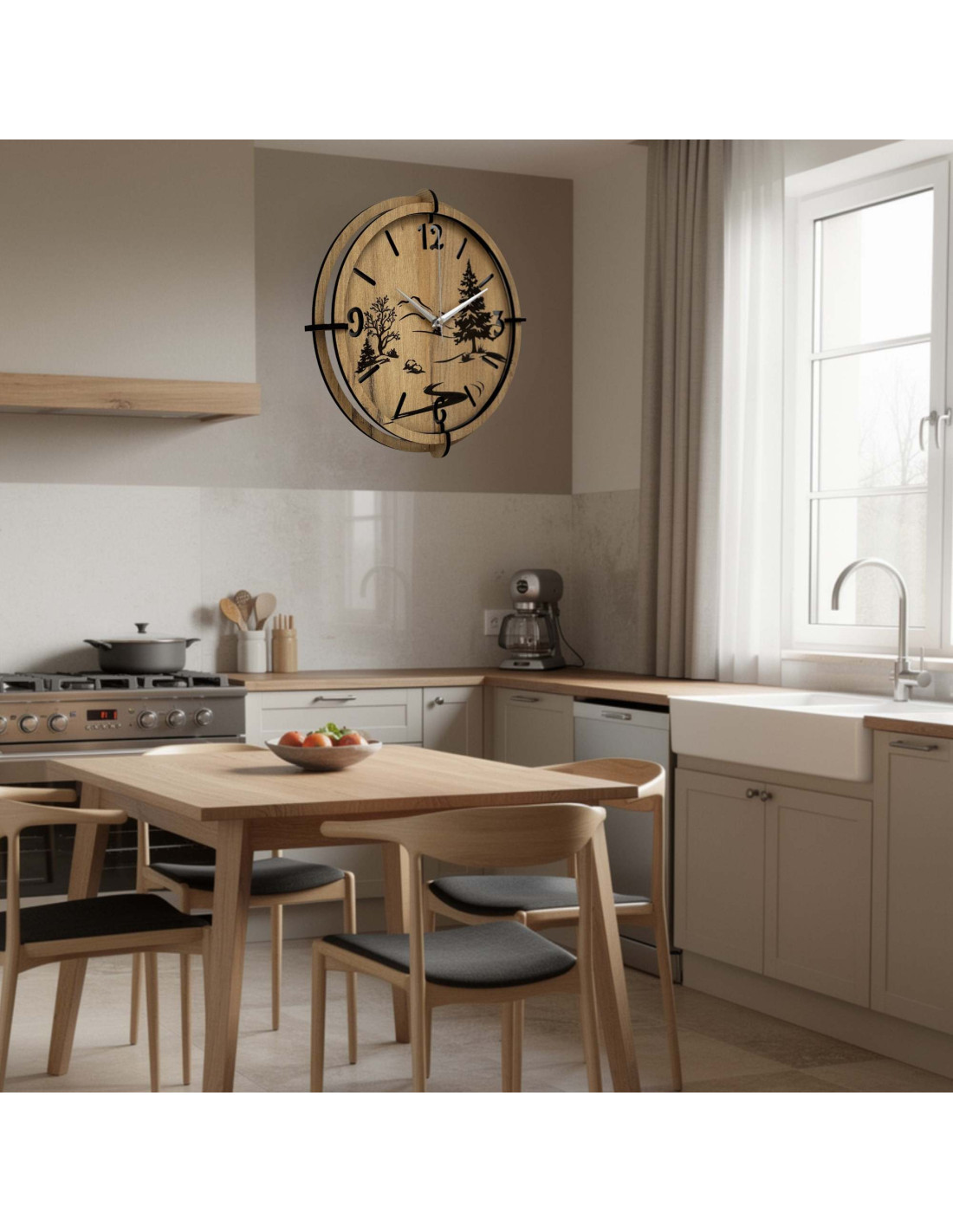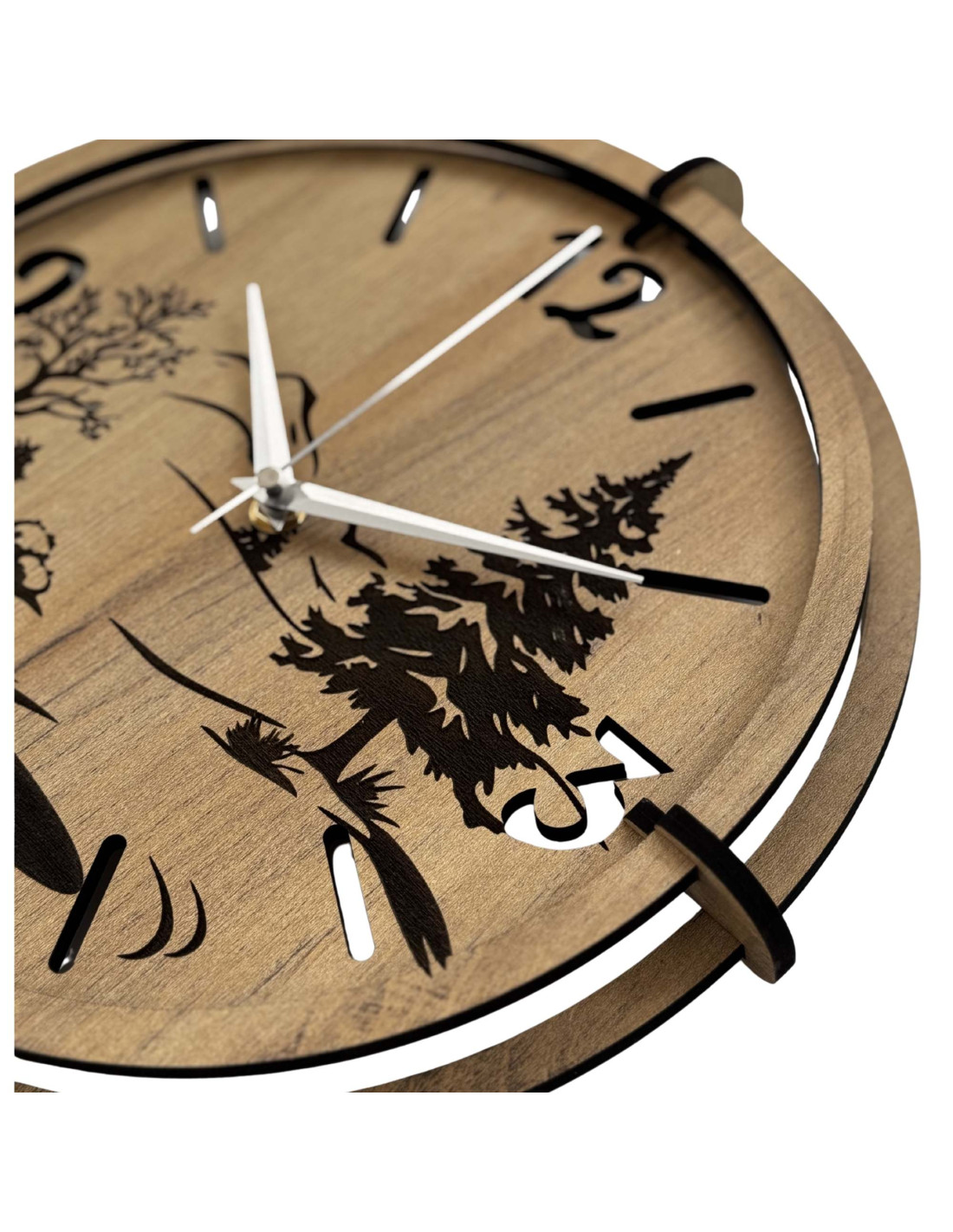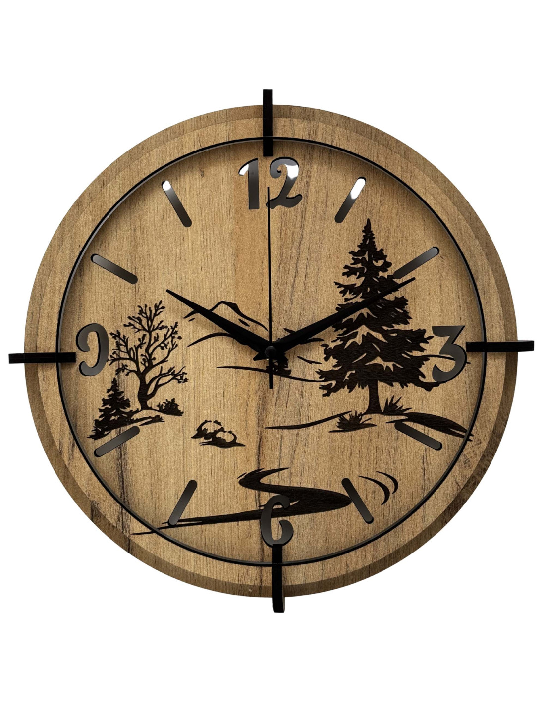Dřevěné hodiny s precizním gravírováním krajiny spojují autentický vzhled přírody s moderním designem , kontrastními černými prvky a spolehlivým tichým mechanismem.