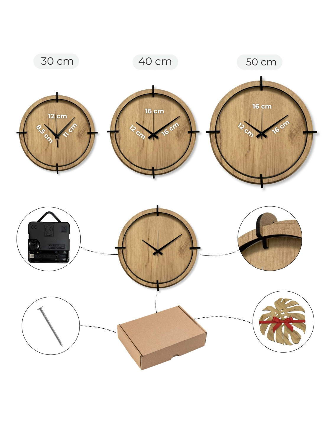 - Průměr hodin: na výběr 30 cm, 40 cm nebo 50 cm