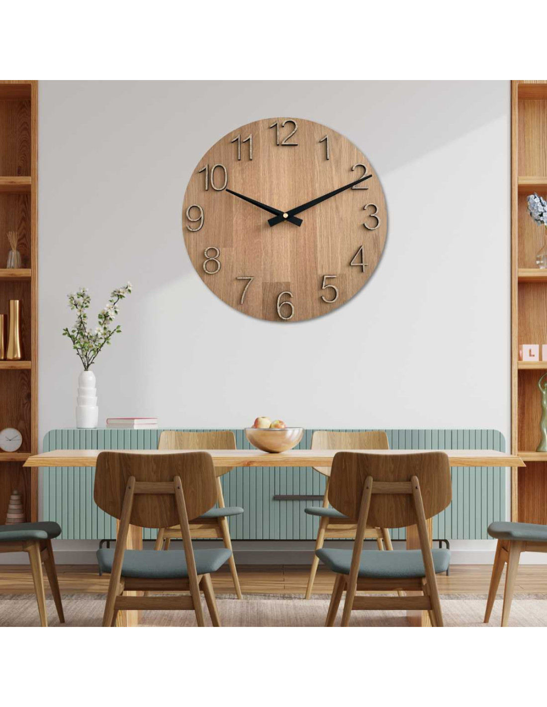 - Přírodní a elegantní design - Kombinace dubového dřeva a kovových ručiček vytváří moderní, ale zároveň nadčasový vzhled.