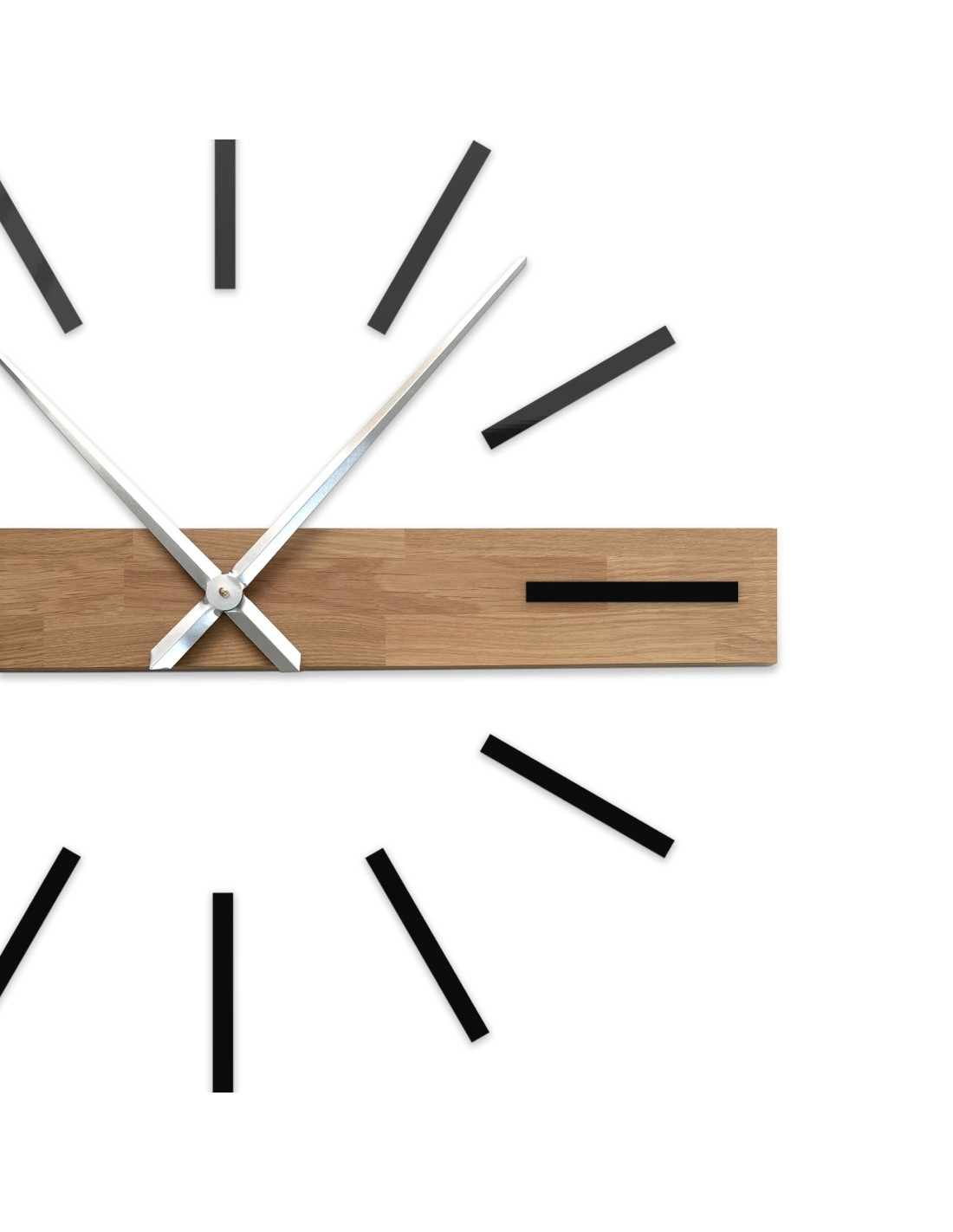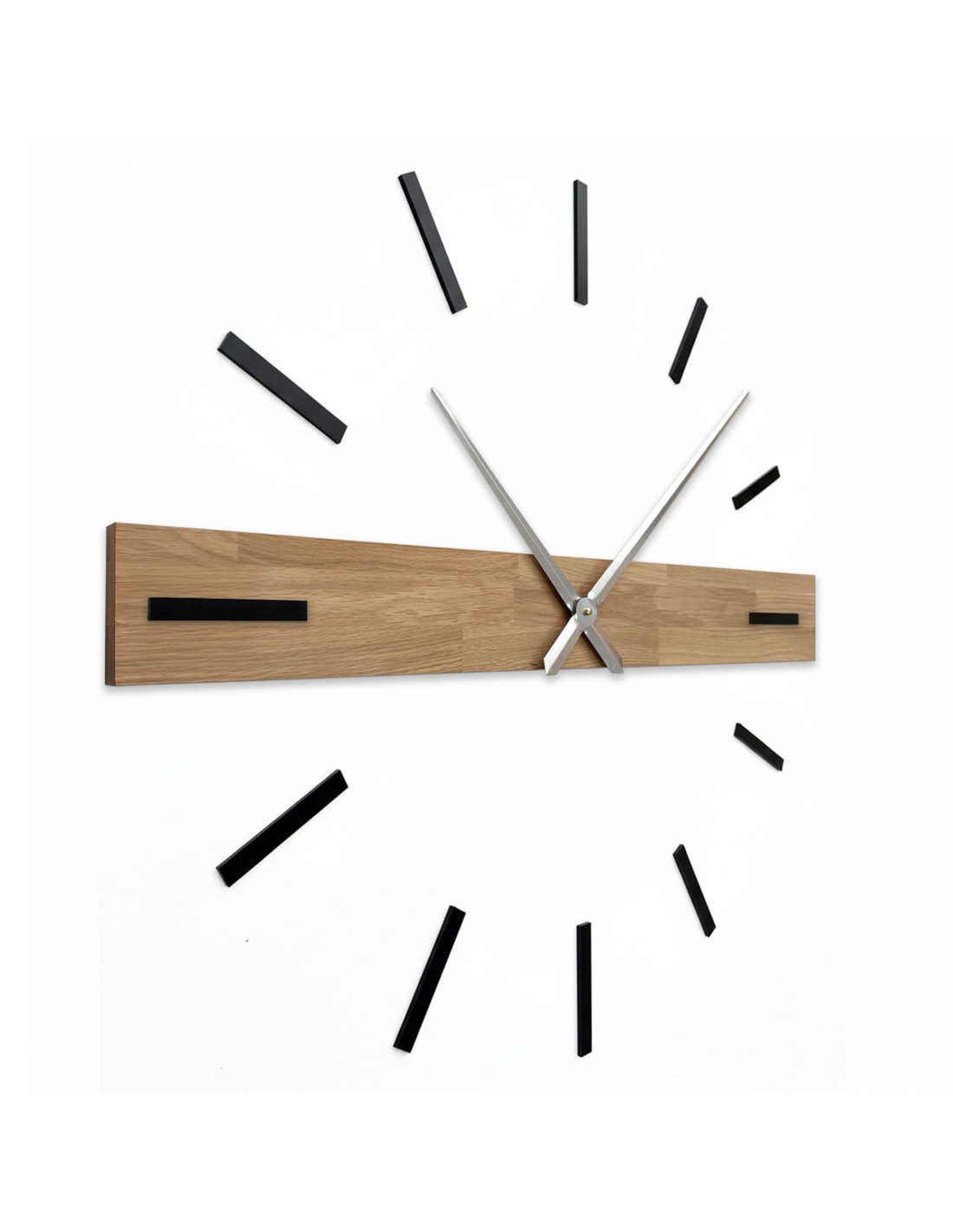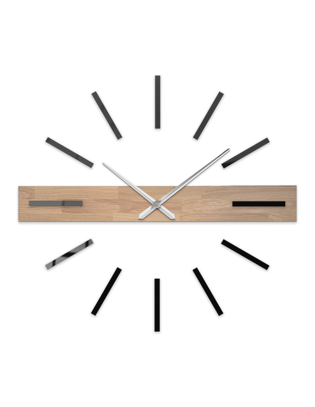 Dominantní horizontální prvek z masivu vytváří originální vizuální akcent, zatímco elegantní 3D indexy a kovové ručičky dodávají hodinám luxusní a současný charakter.