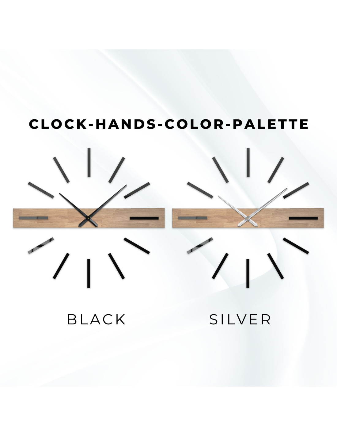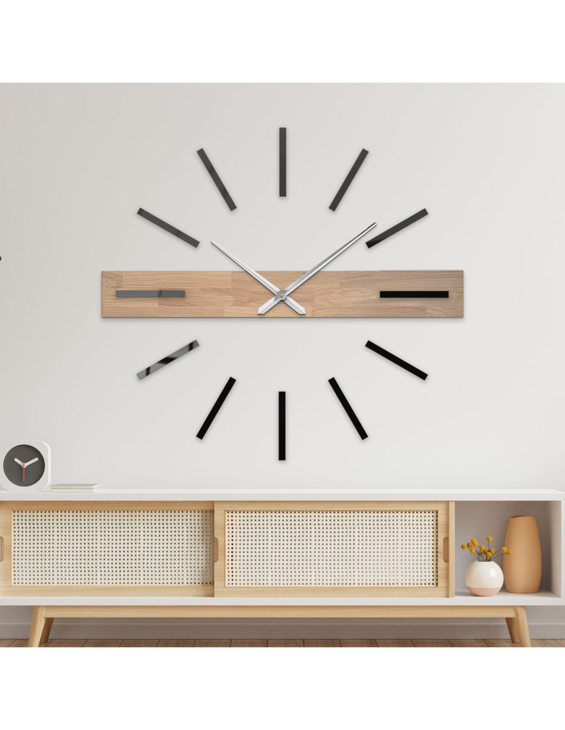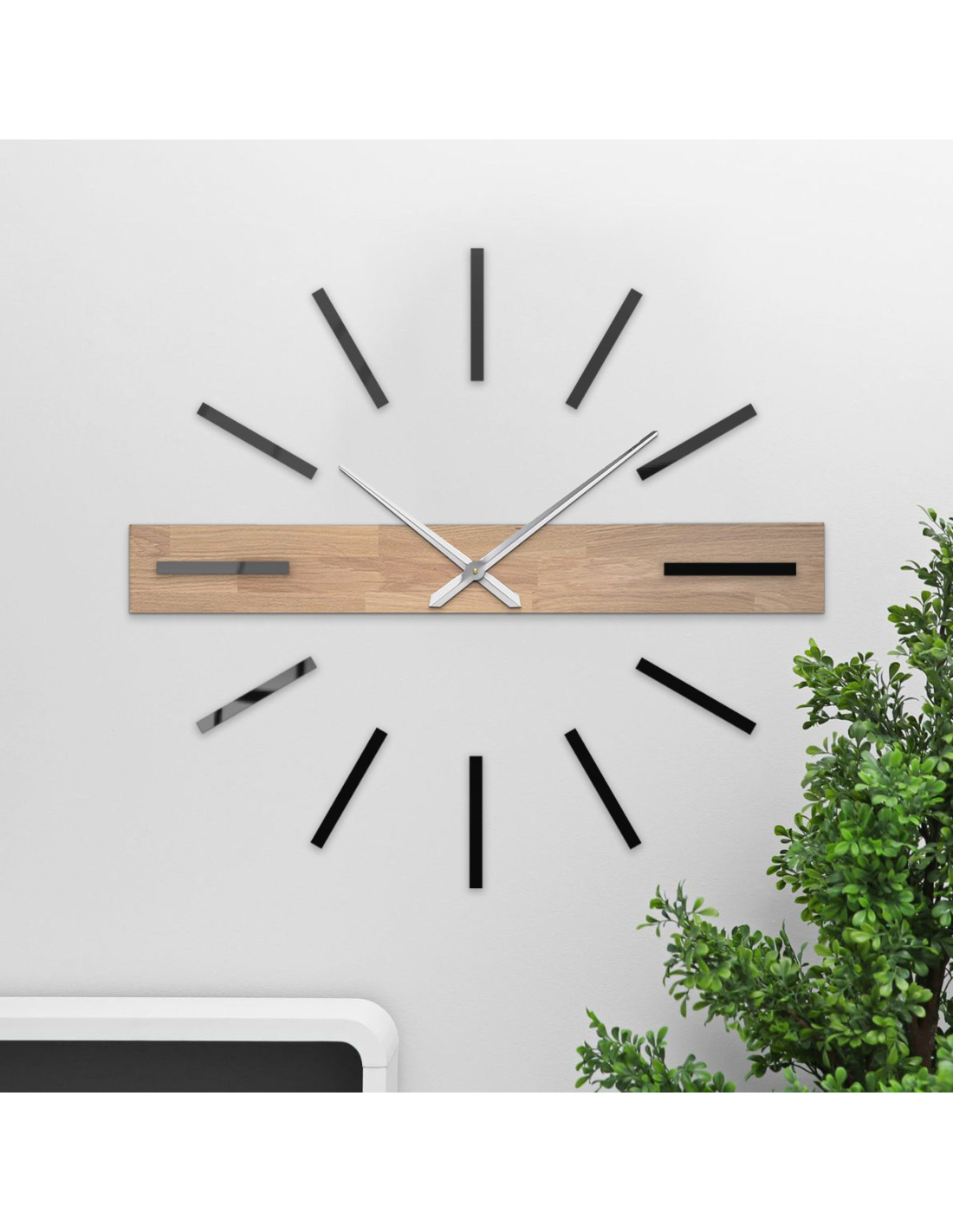 Dominantní horizontální prvek z masivu vytváří originální vizuální akcent, zatímco elegantní 3D indexy a kovové ručičky dodávají hodinám luxusní a současný charakter.