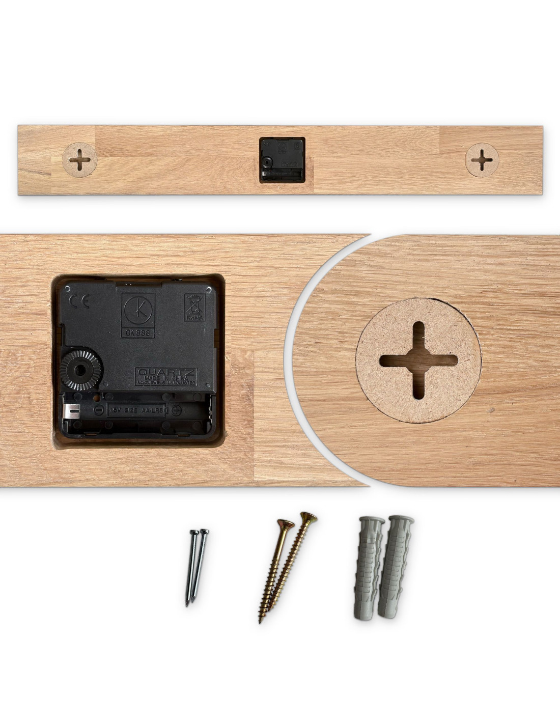 Přírodní a elegantní design – kombinace dubového dřeva, lesklých čísel z černého plexiskla a kovových ručiček vytváří moderní a nadčasový vzhled.