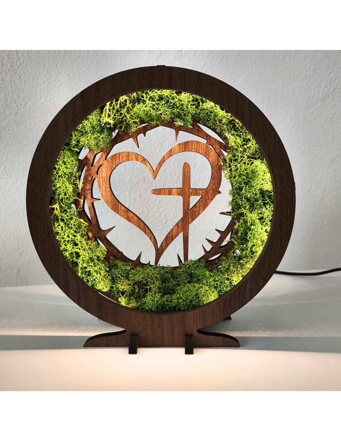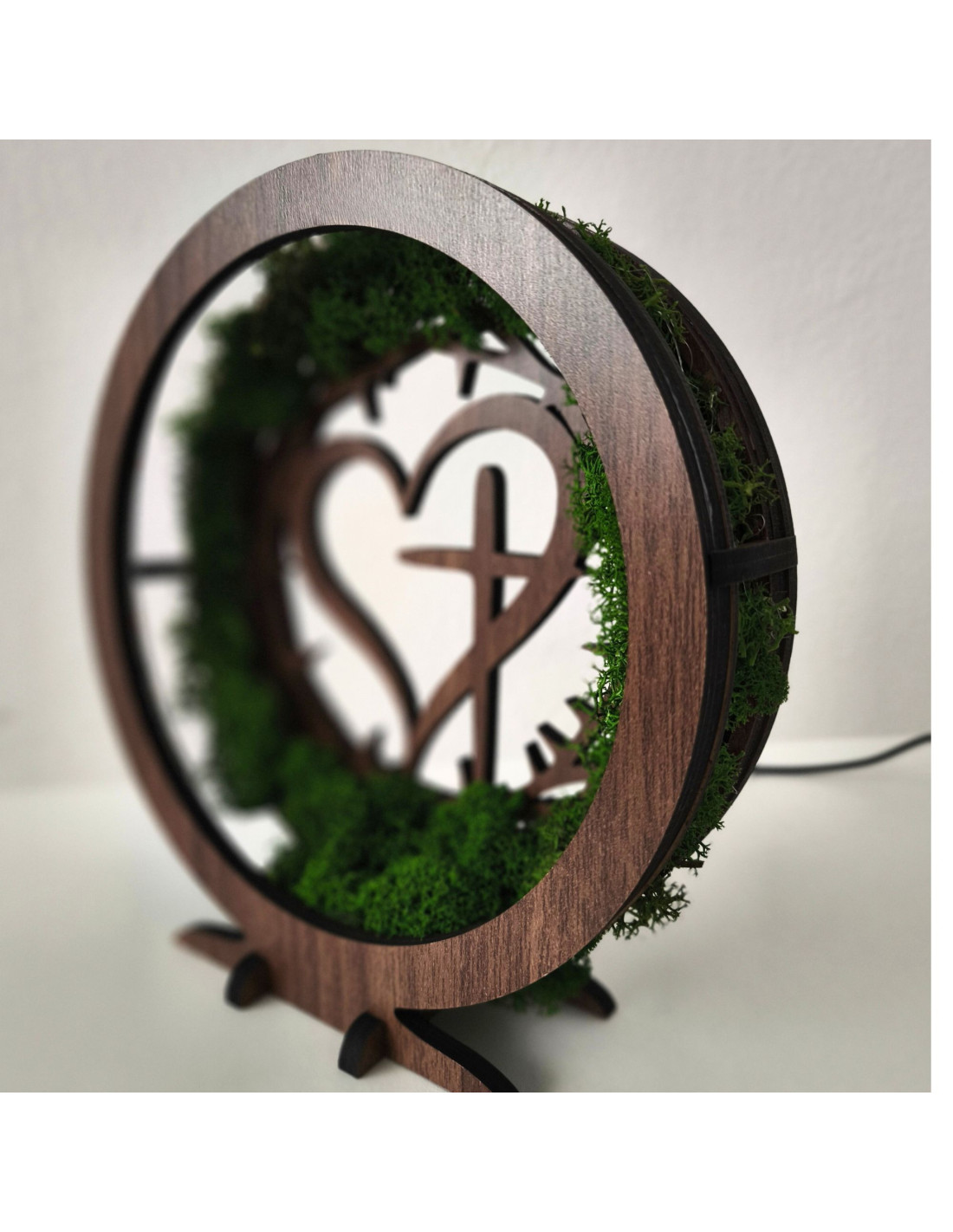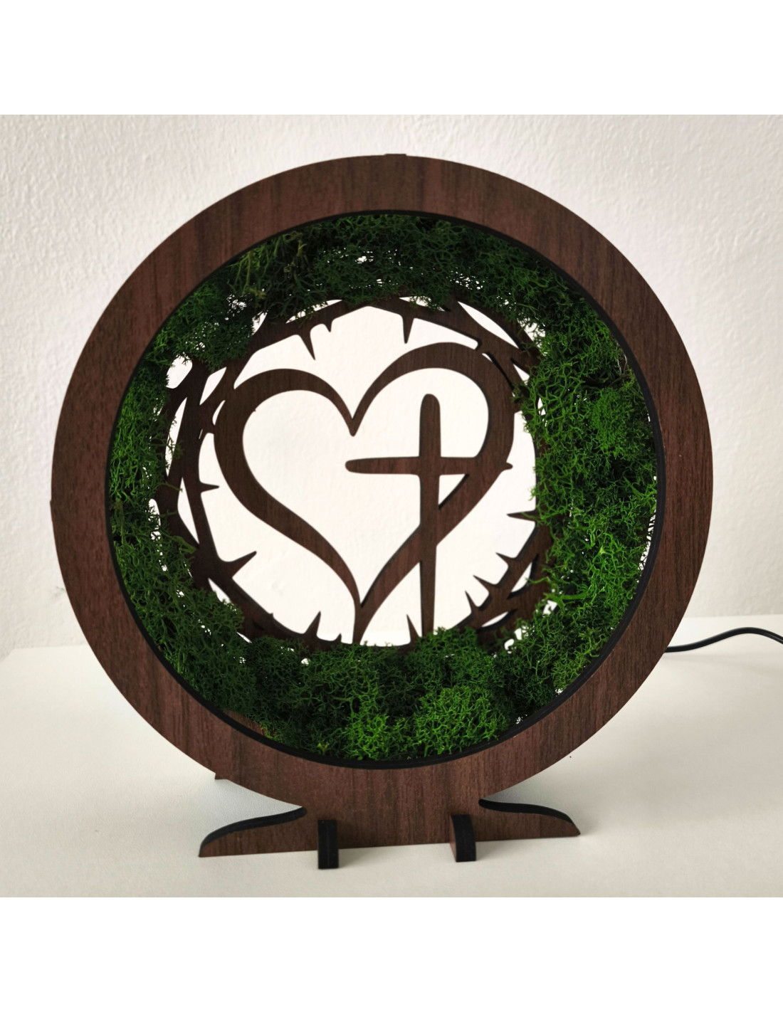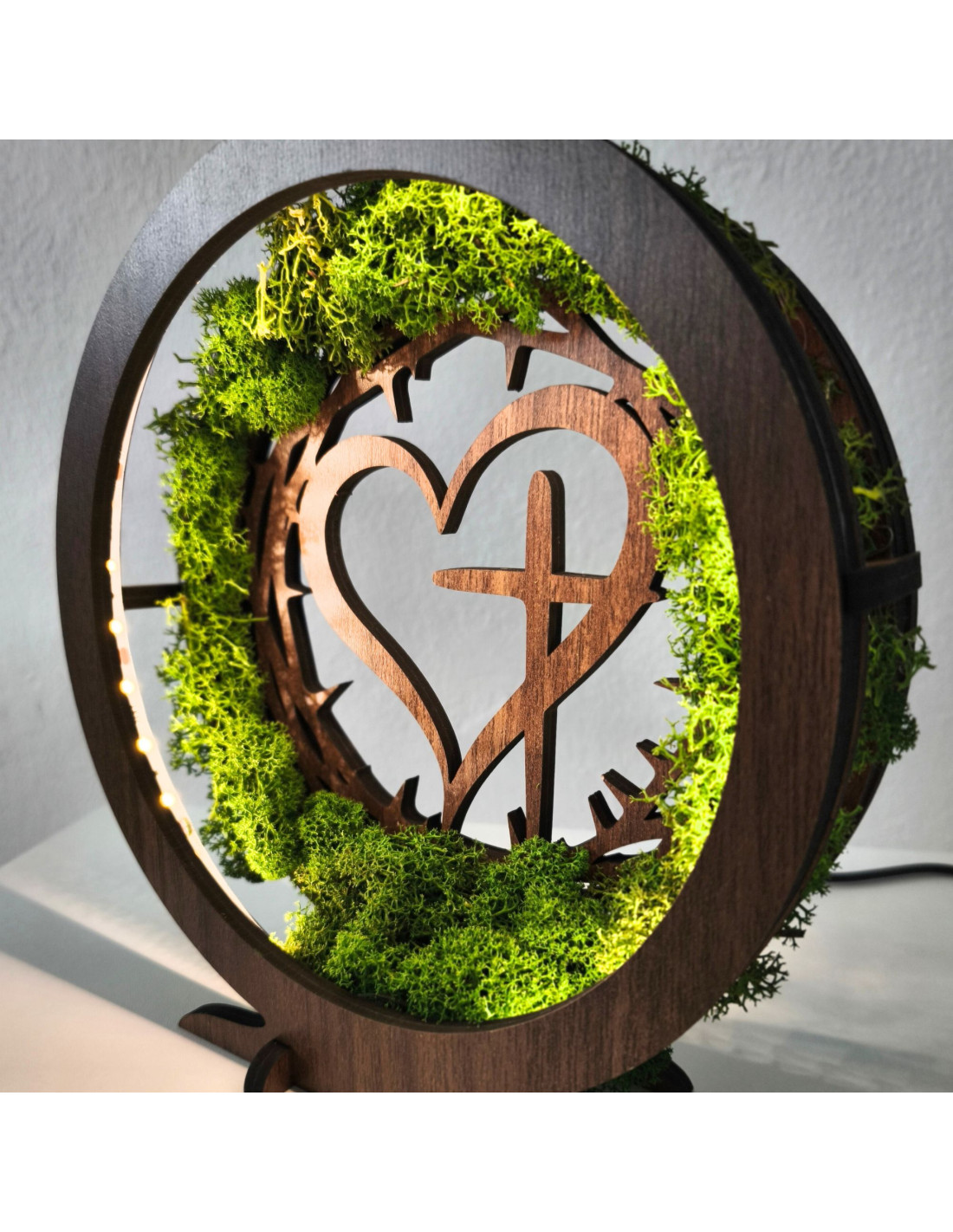 Dřevěná LED lampa s přírodním mechem a duchovním motivem Srdce s Křížem