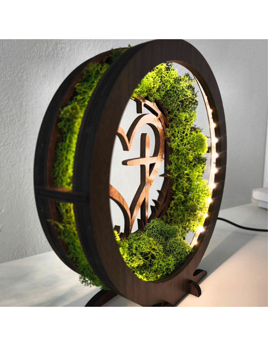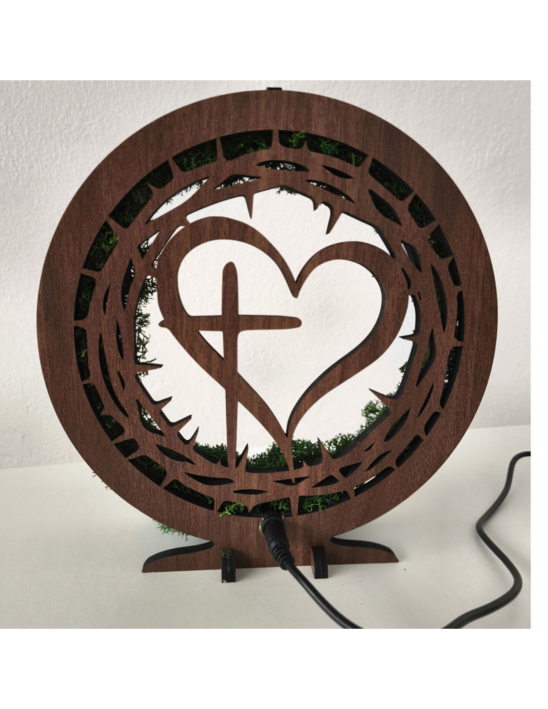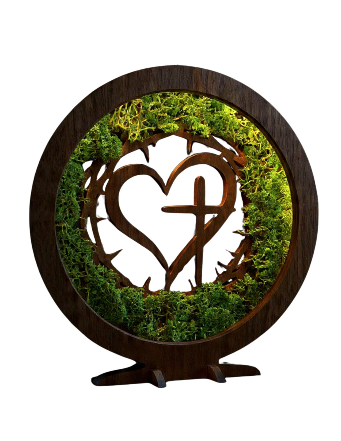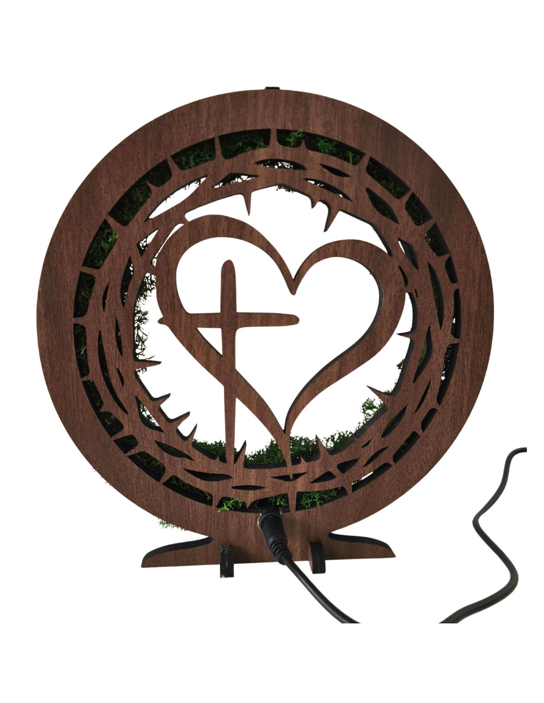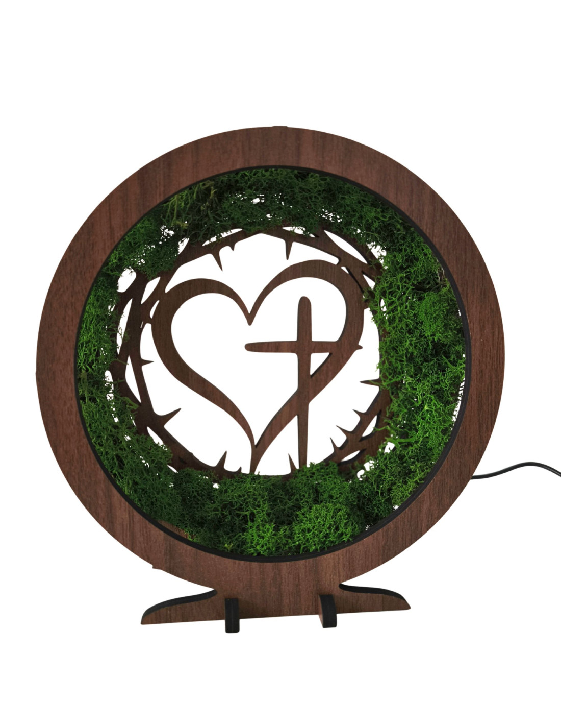 Dřevěná LED lampa s přírodním mechem a duchovním motivem Srdce s Křížem