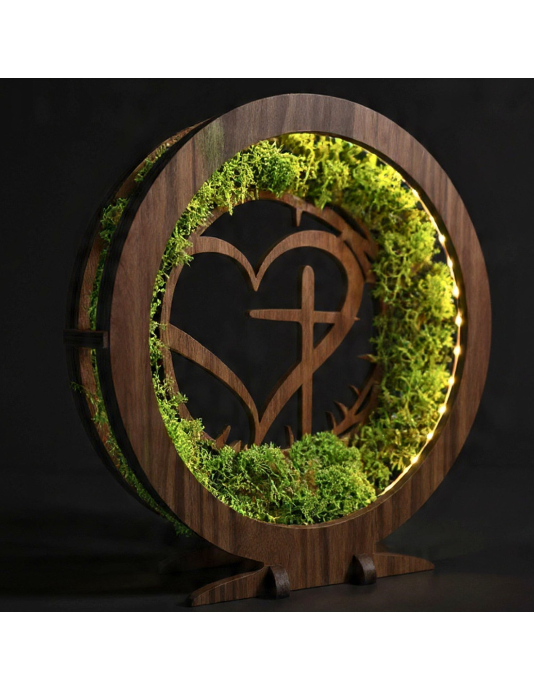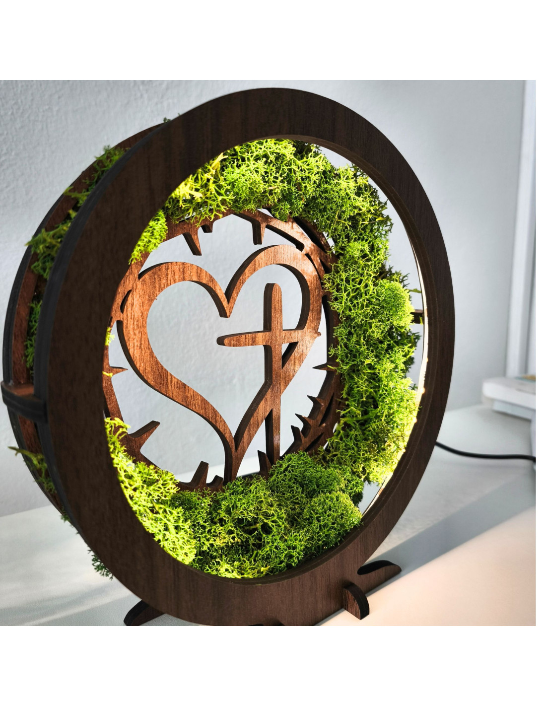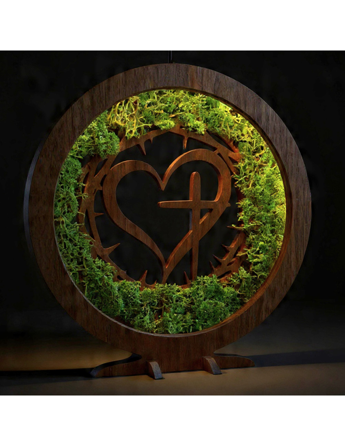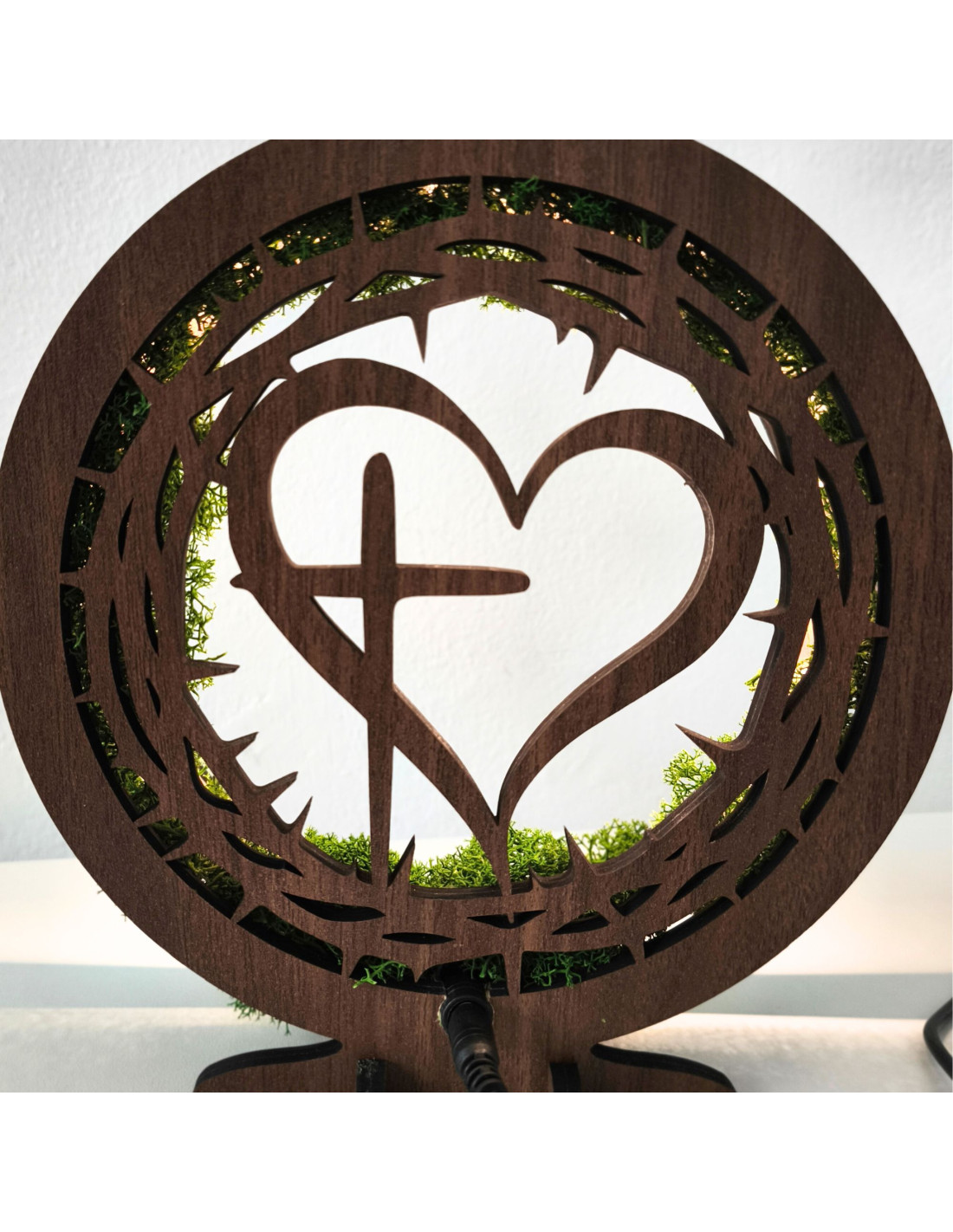 Dřevěná LED lampa s přírodním mechem a duchovním motivem Srdce s Křížem