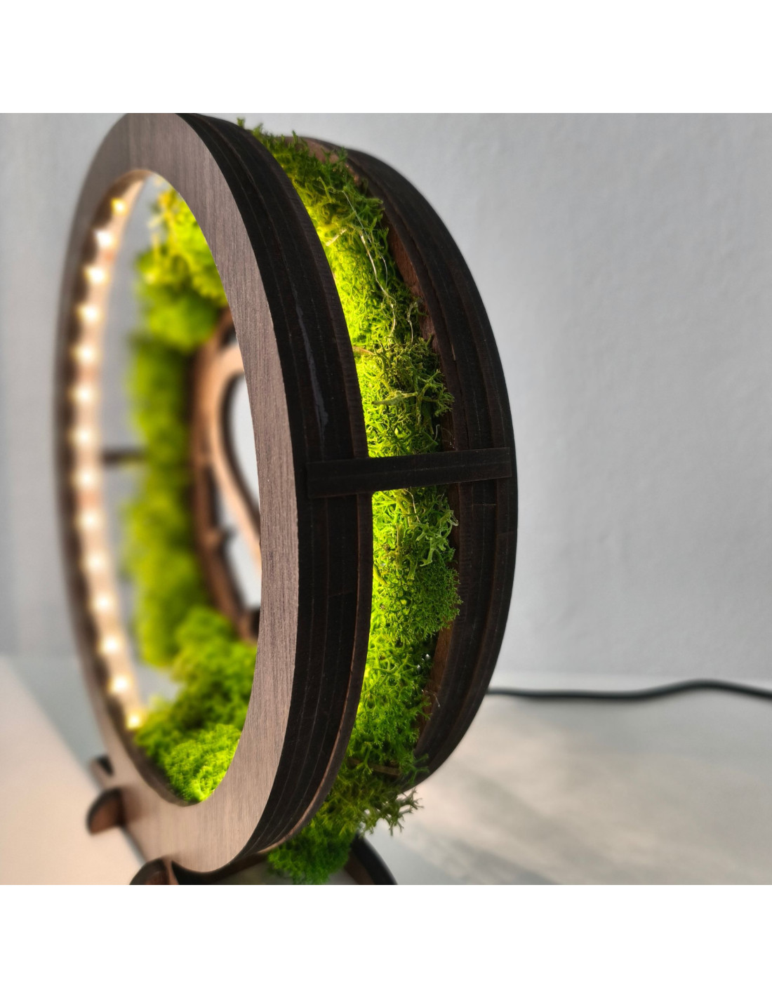 Stylová dekorace s duchovním motivem. LED lampa s mechem v elegantním dekoru ořech.