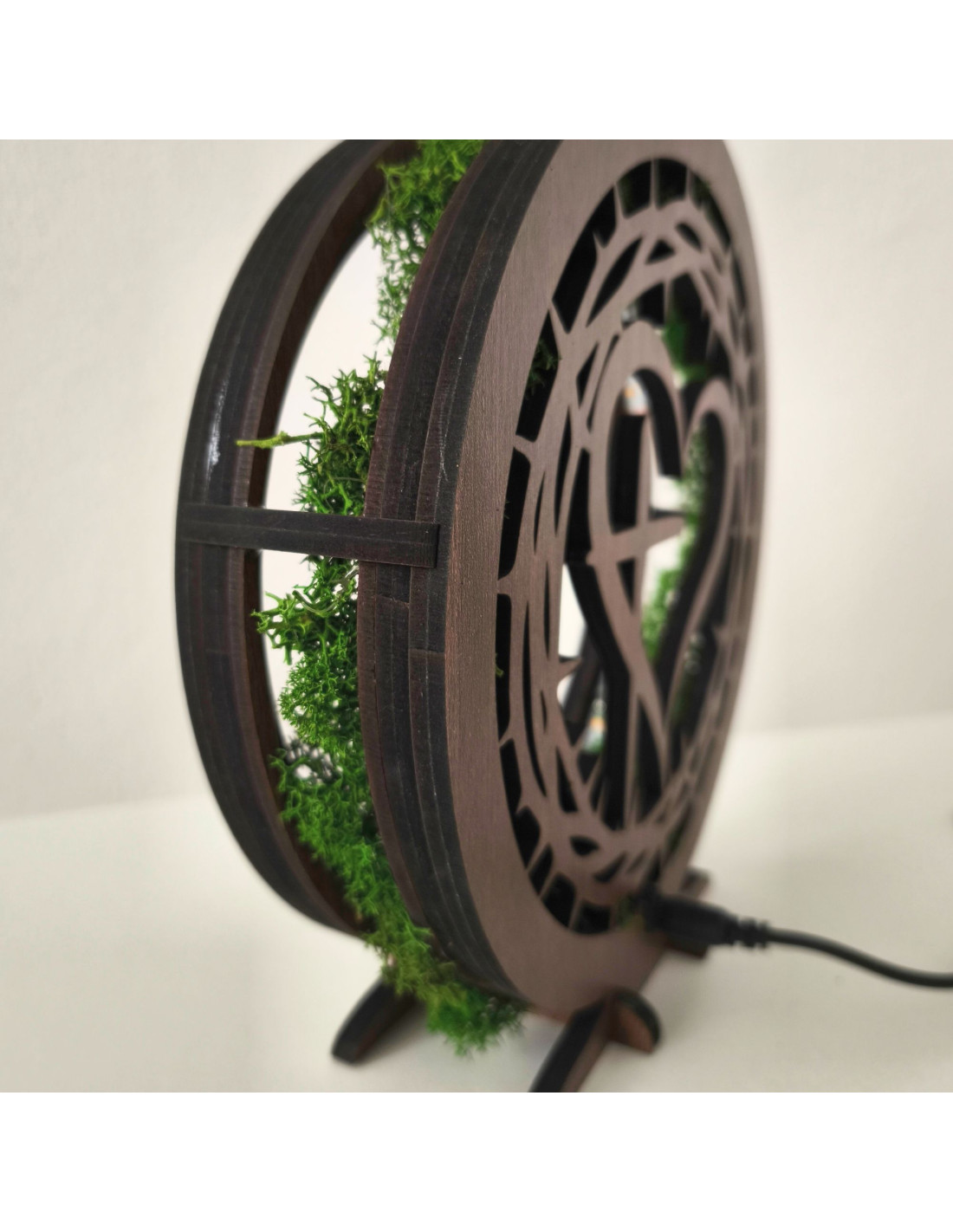 Dřevěná LED lampa se srdcem a křížem. Přírodní mech a hřejivé světlo pro váš domov.