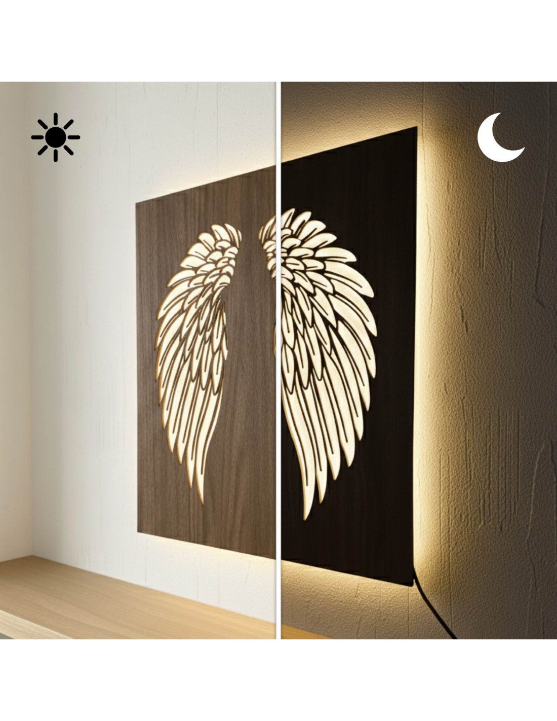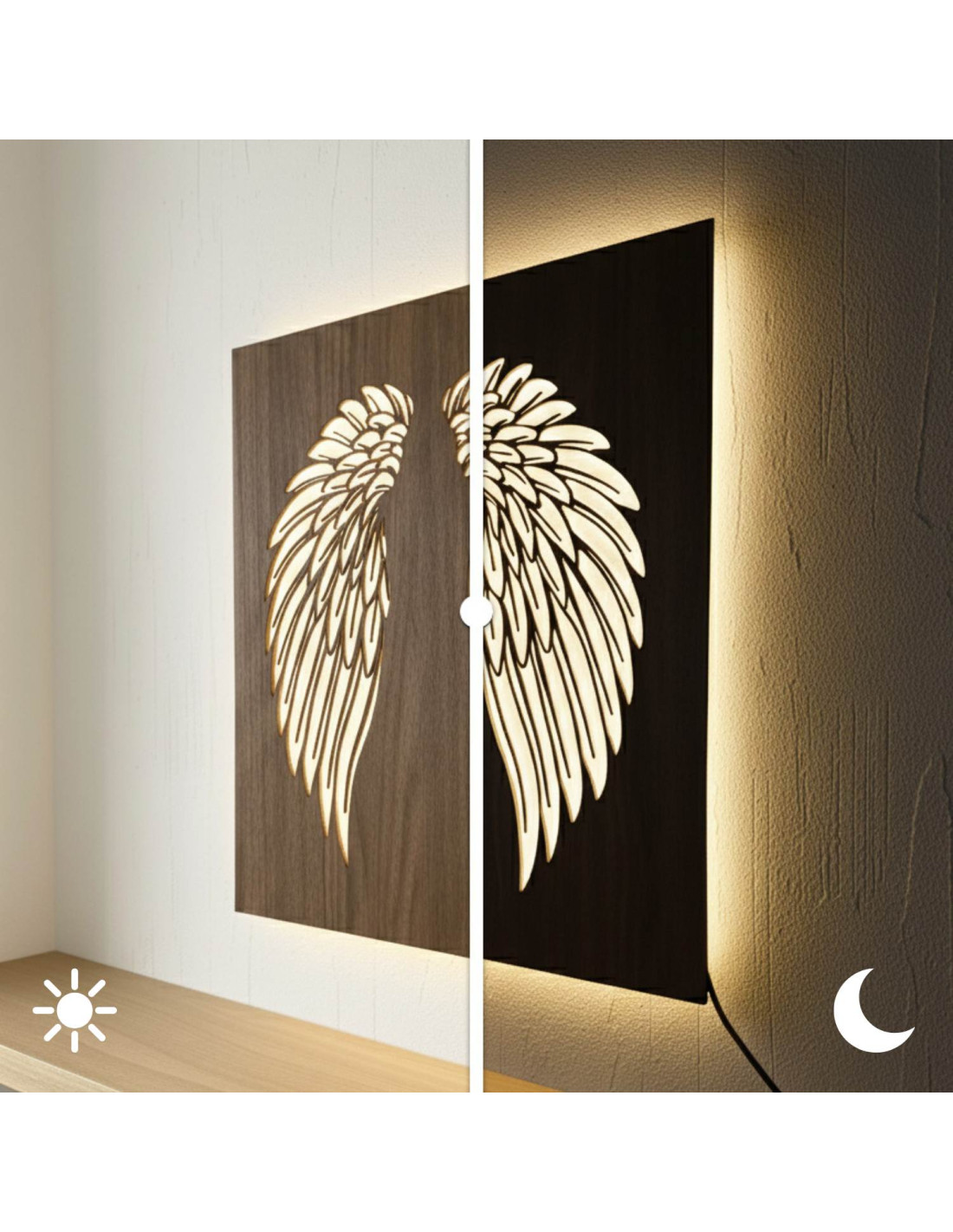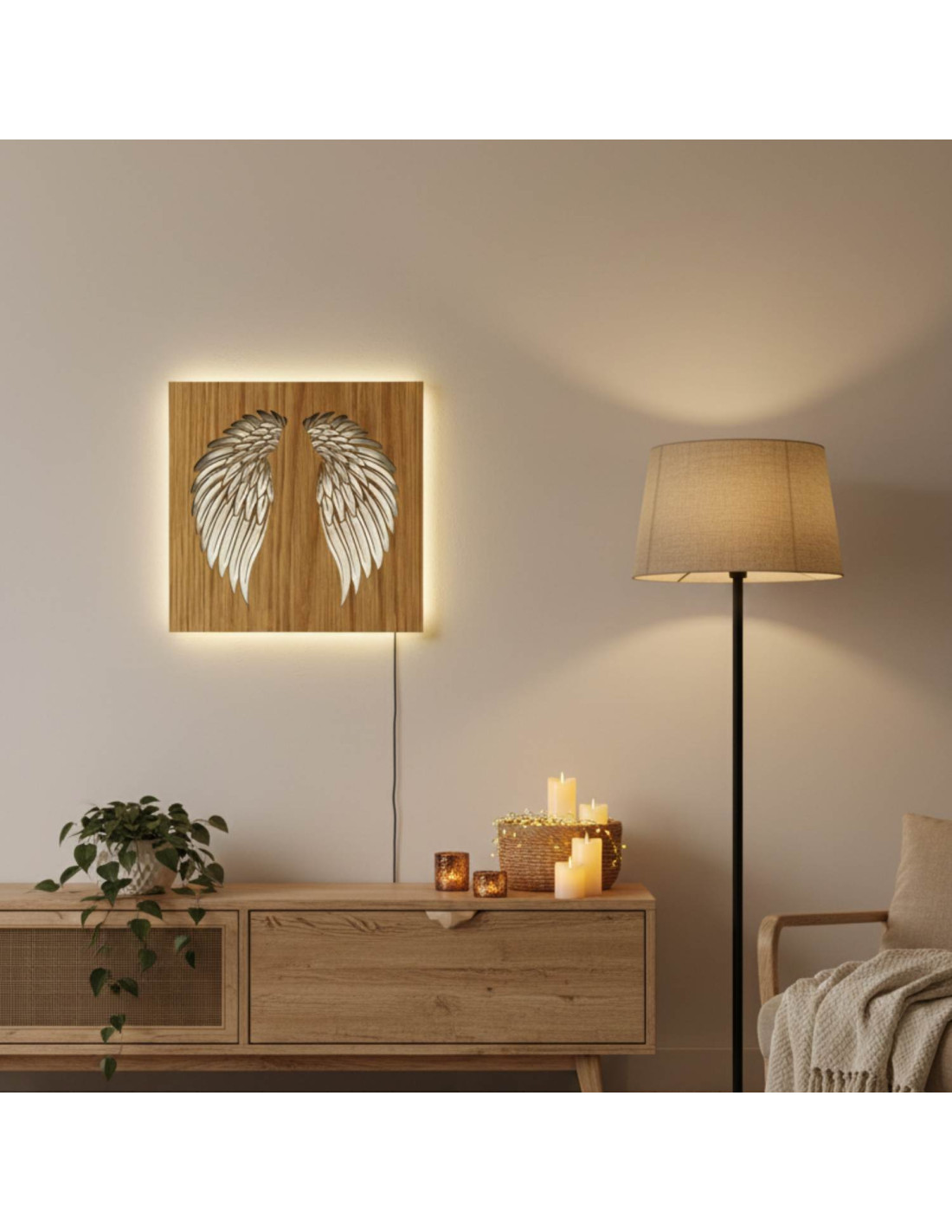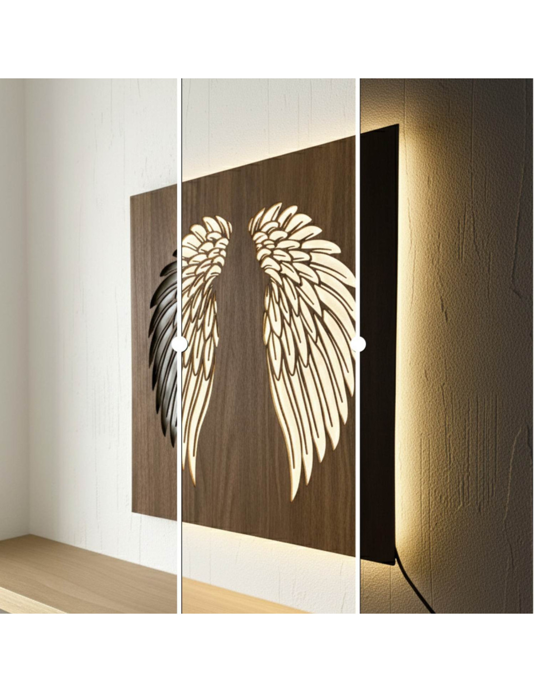 Originální podsvícený dřevěný obraz – andělská křídla spojuje přírodní krásu dřeva, moderní design a jemné LED osvětlení do jedinečného uměleckého díla. Tento elegantní kousek vnáší do prostoru pocit klidu, světla a harmonie , čímž zútulní každý interiér – od obývacího pokoje a ložnice až po reprezentační kancelářské prostory .