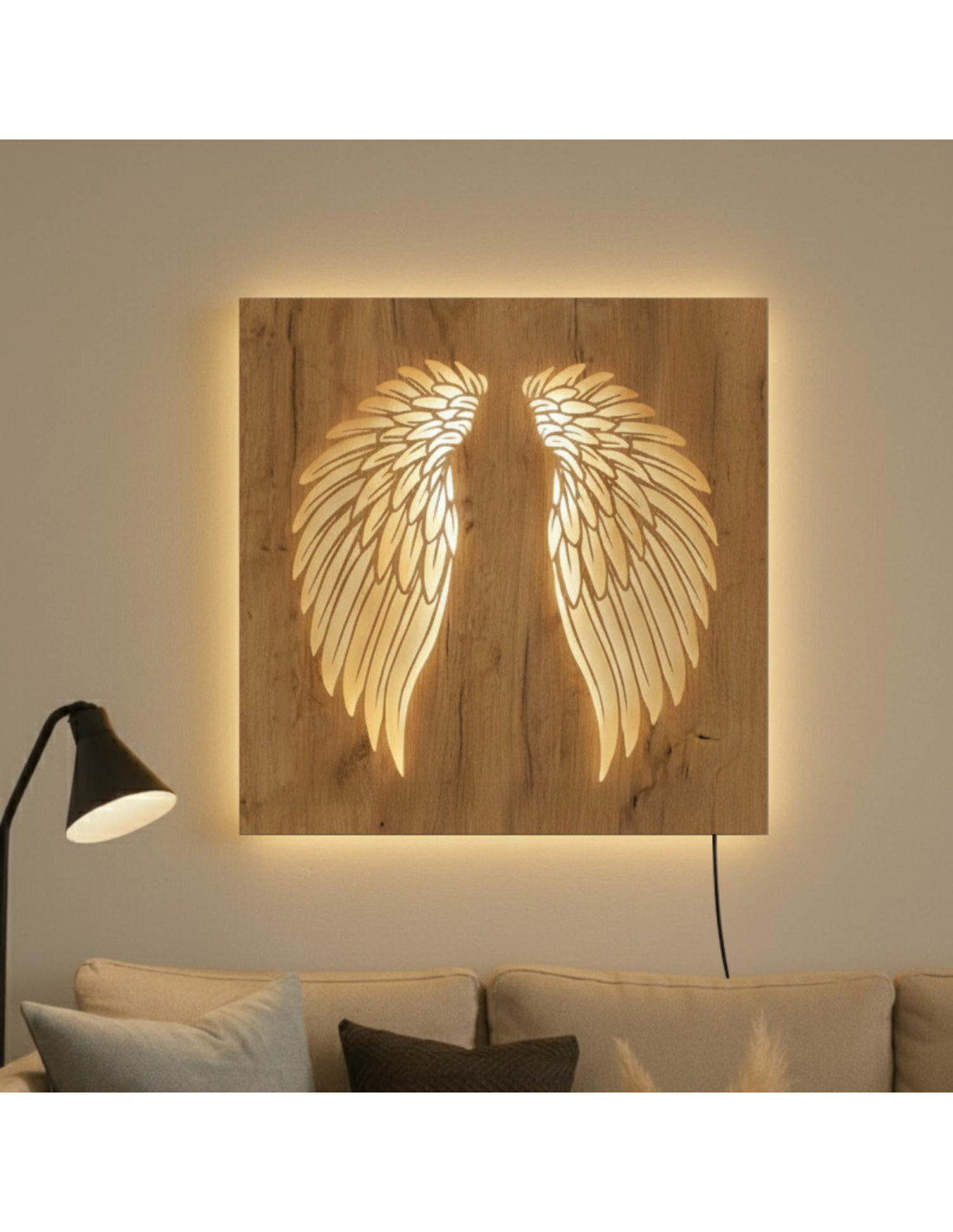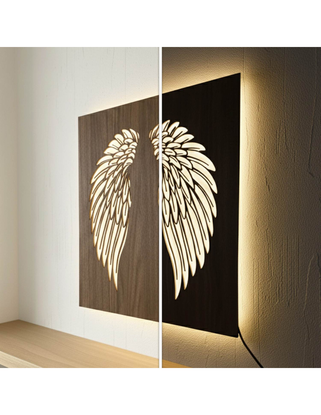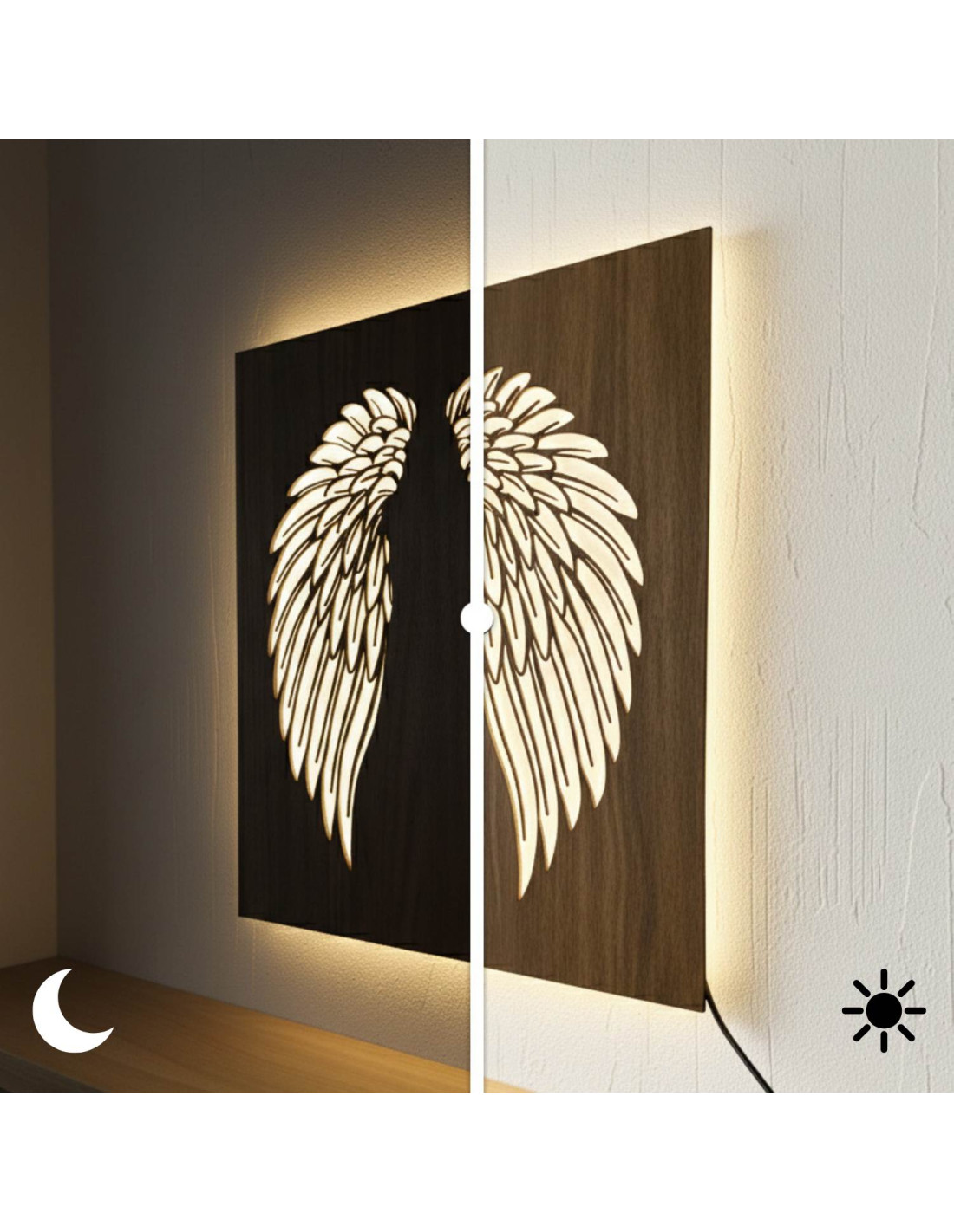 Originální podsvícený dřevěný obraz – andělská křídla spojuje přírodní krásu dřeva, moderní design a jemné LED osvětlení do jedinečného uměleckého díla. Tento elegantní kousek vnáší do prostoru pocit klidu, světla a harmonie , čímž zútulní každý interiér – od obývacího pokoje a ložnice až po reprezentační kancelářské prostory .