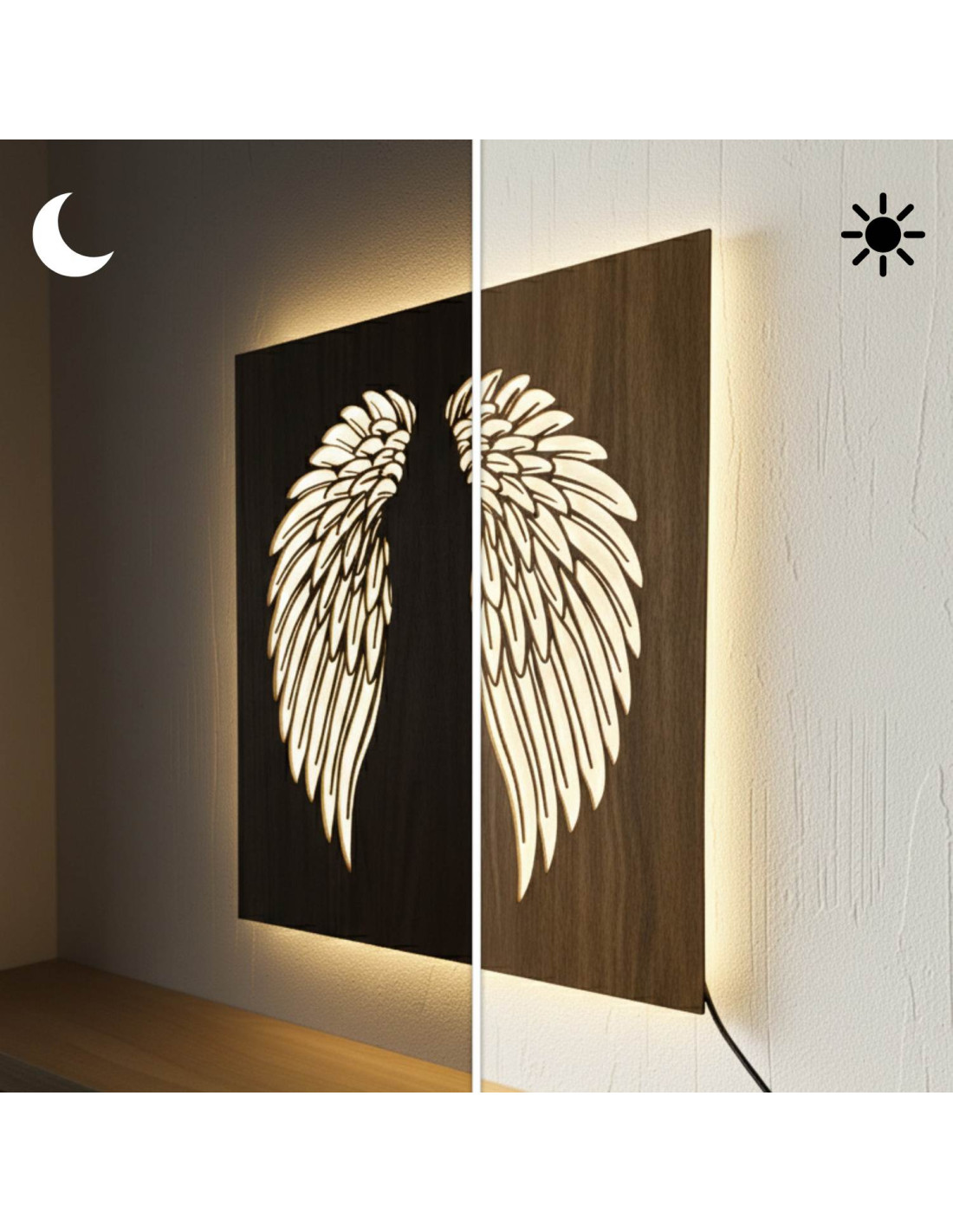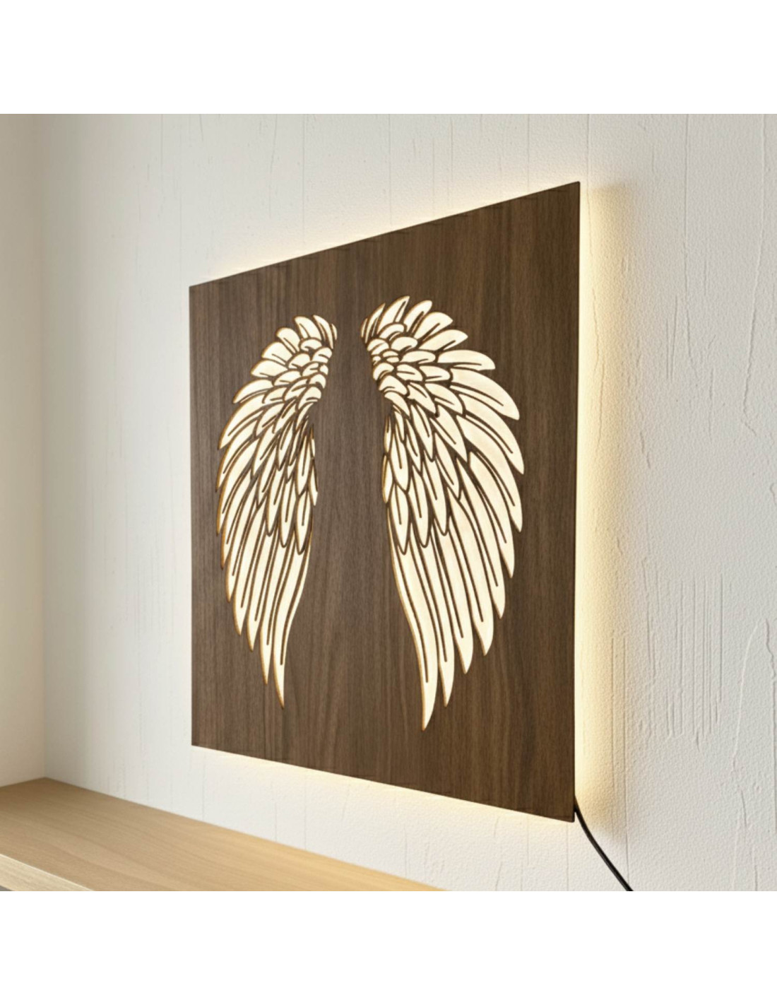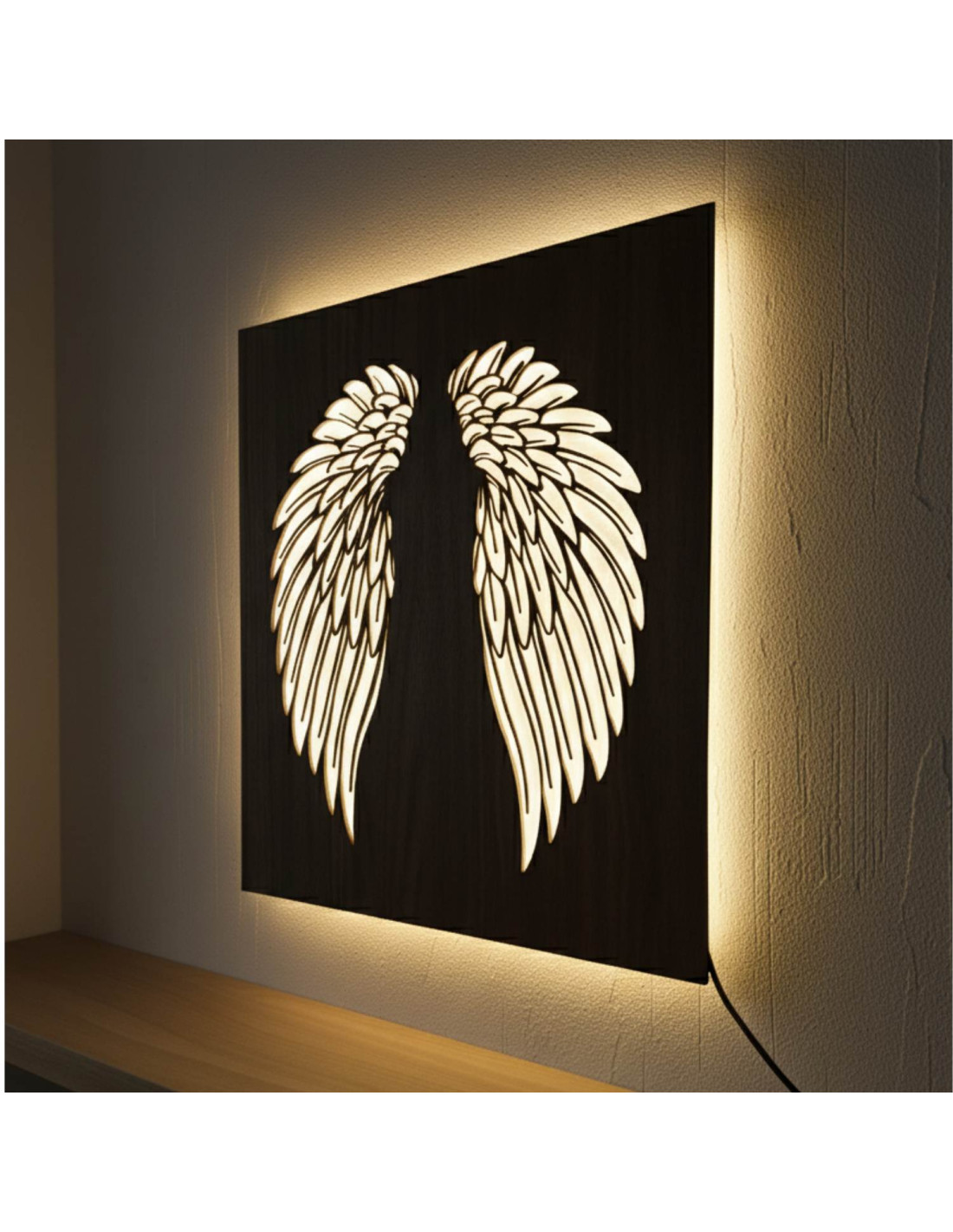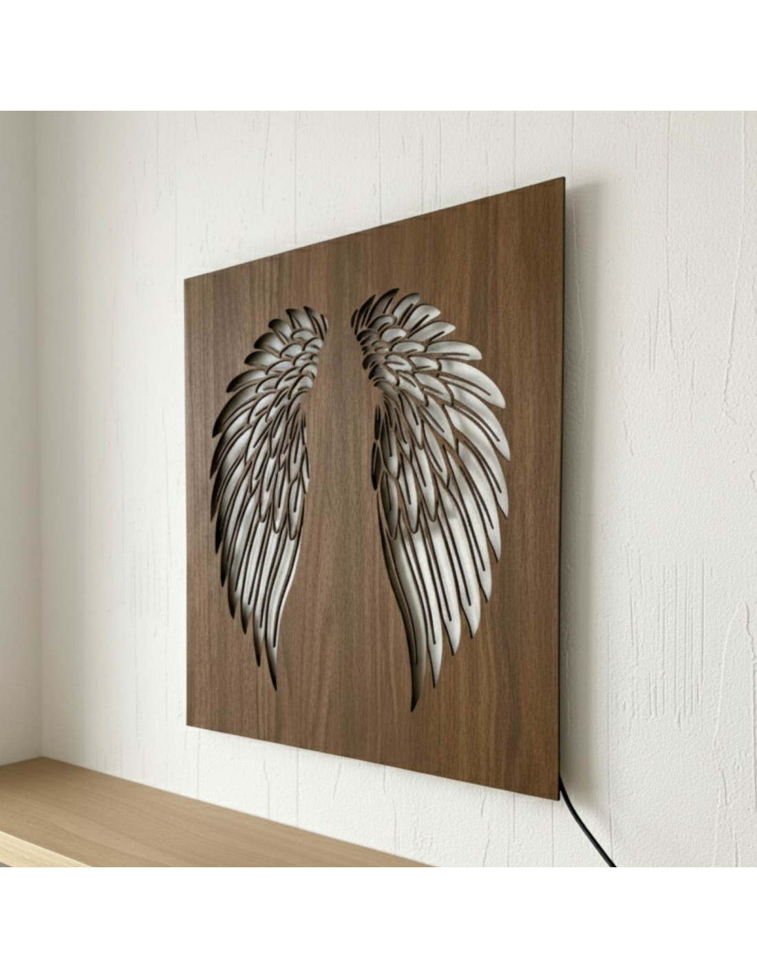 Originální podsvícený dřevěný obraz – andělská křídla spojuje přírodní krásu dřeva, moderní design a jemné LED osvětlení do jedinečného uměleckého díla. Tento elegantní kousek vnáší do prostoru pocit klidu, světla a harmonie , čímž zútulní každý interiér – od obývacího pokoje a ložnice až po reprezentační kancelářské prostory .