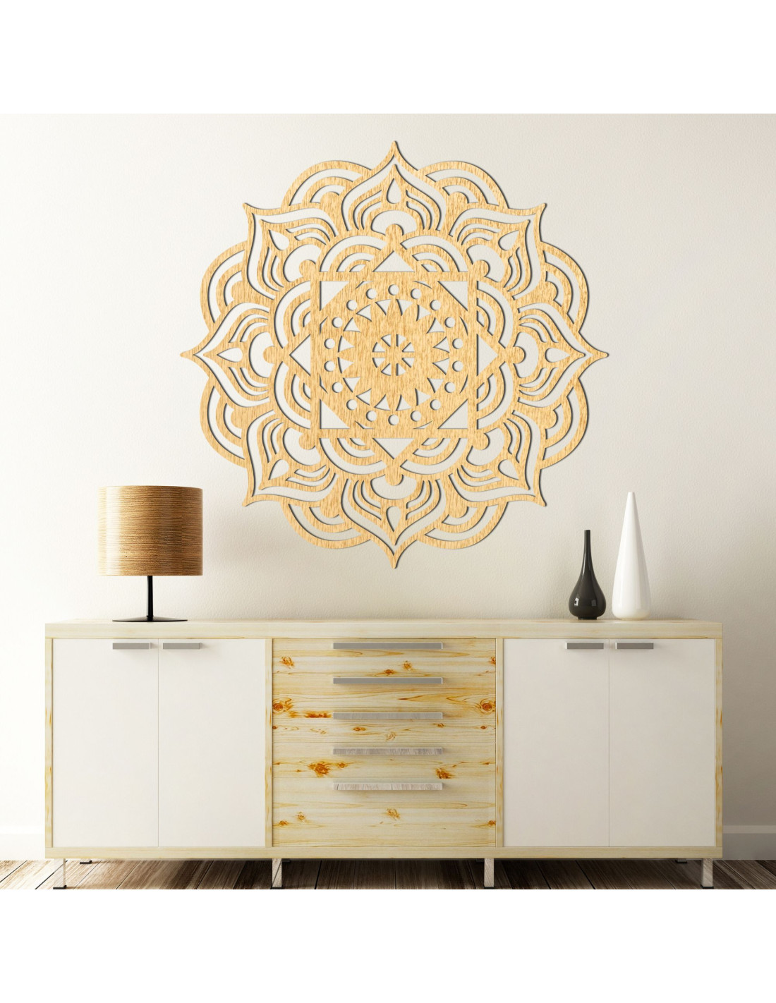 Dřevěná dekorace na stěnu mandal Jejich design, vyjadřující rovnováhu a pozitivní energii, spojuje přirozenou krásu dřeva s precizním řemeslným zpracováním.