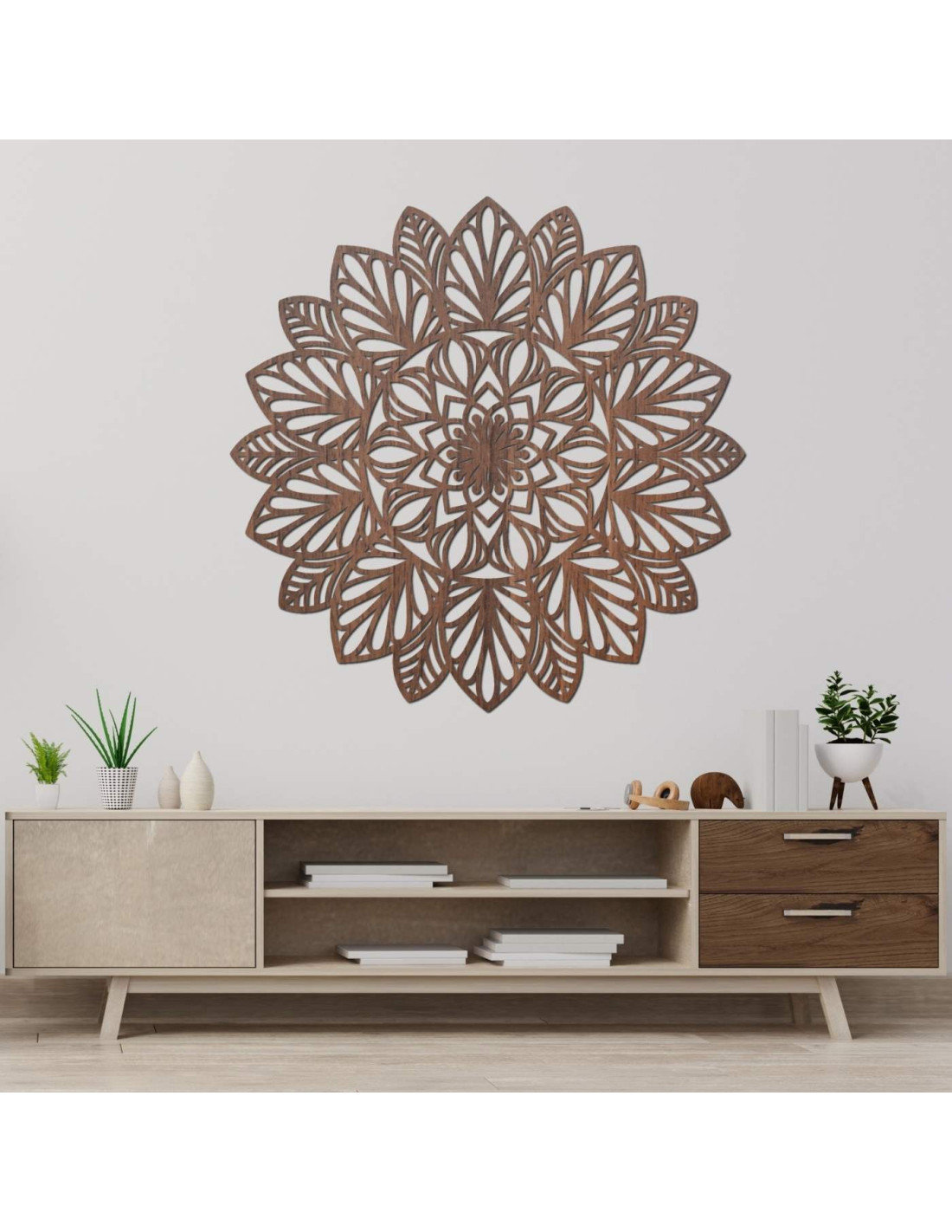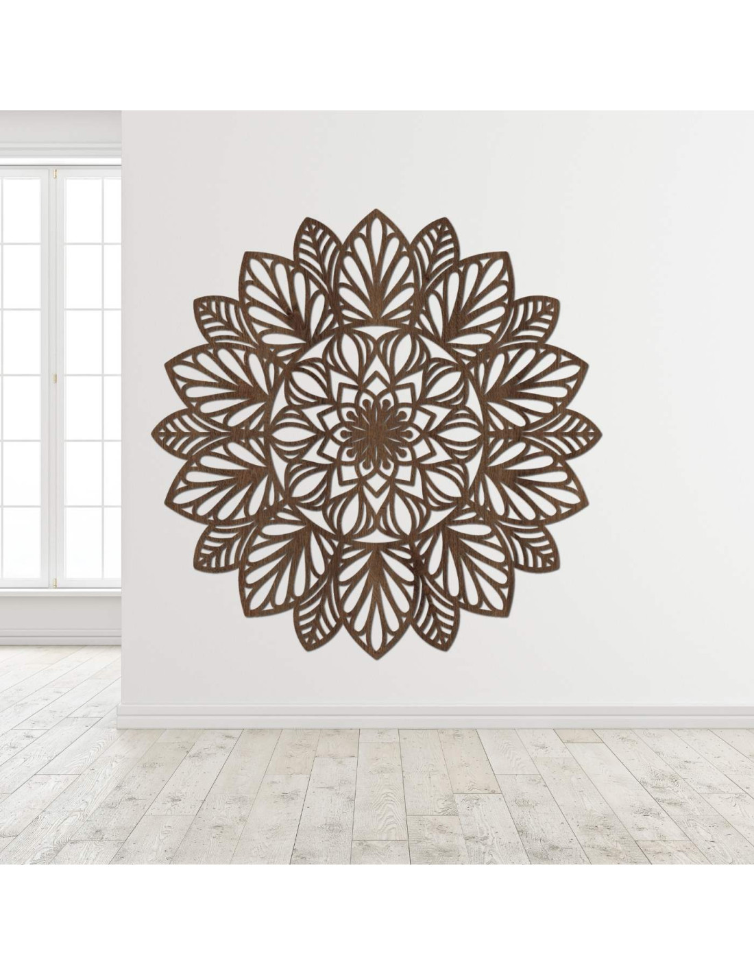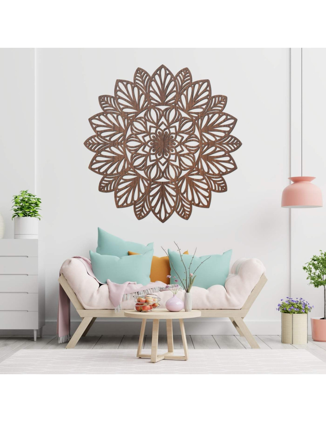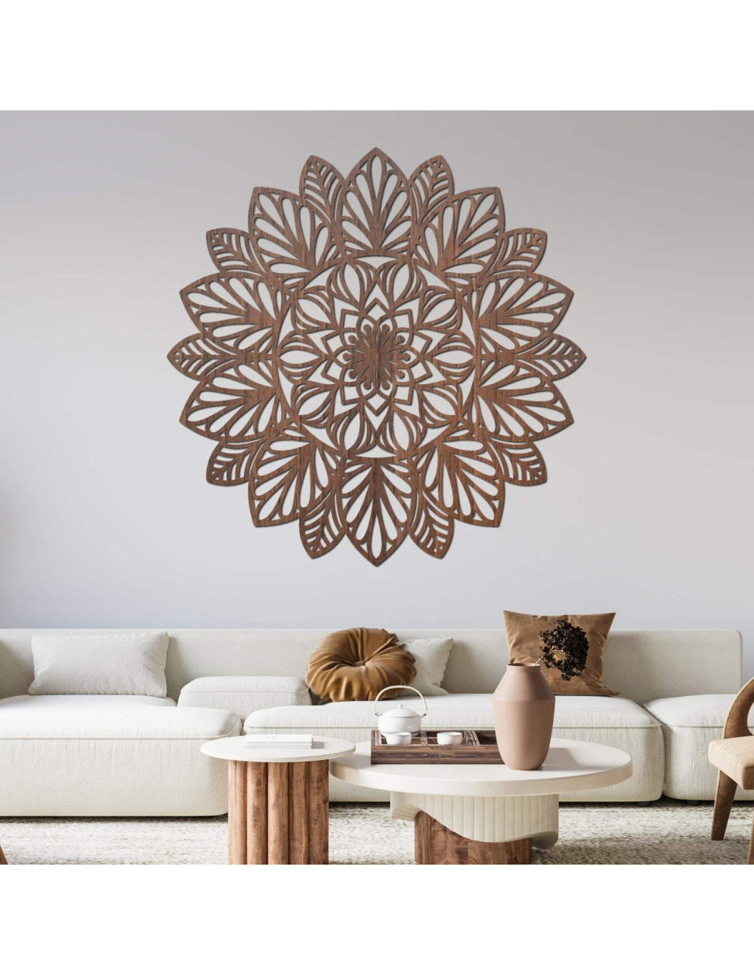 Jemně vyřezávaná mandala na zeď jako dominantní prvek moderního interiéru.