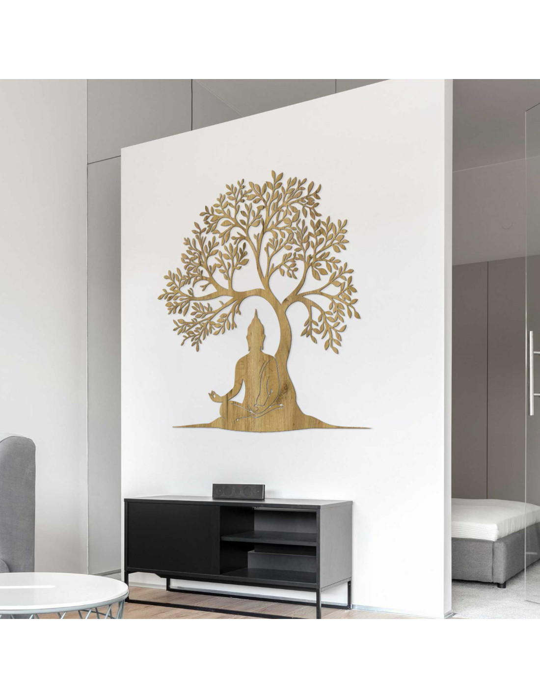 Design spojuje poselství moudrosti a přírodní harmonie do jedné výtvarné kompozice . Buddha v lotosové poloze pod stromem symbolizuje dosažení osvícení . Dekorace je navržena tak, aby vytvářela emocionální atmosféru bez použití slov. Každý prvek má svůj účel a odkaz, který působí déle než běžný pohled .