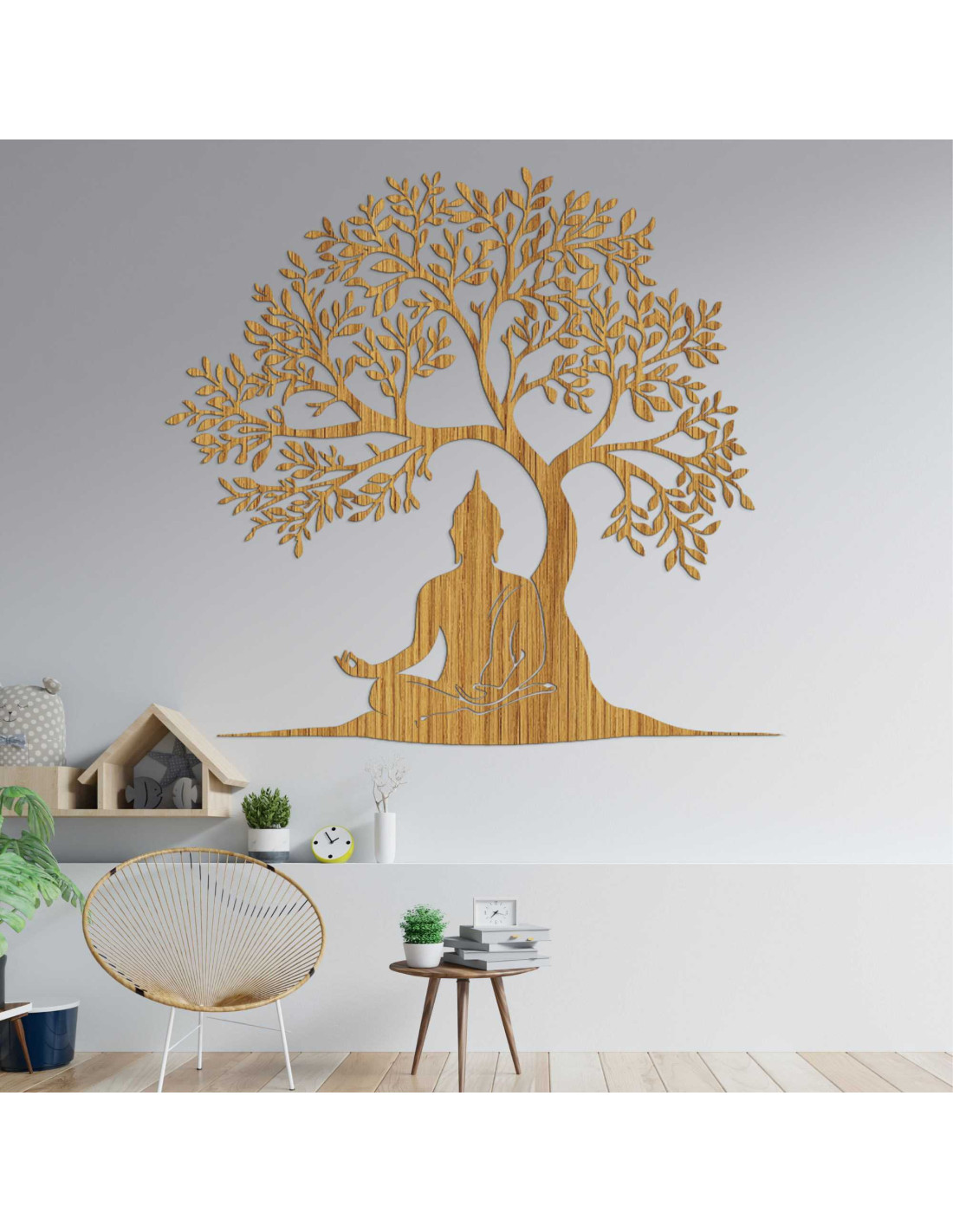 Design spojuje poselství moudrosti a přírodní harmonie do jedné výtvarné kompozice . Buddha v lotosové poloze pod stromem symbolizuje dosažení osvícení . Dekorace je navržena tak, aby vytvářela emocionální atmosféru bez použití slov. Každý prvek má svůj účel a odkaz, který působí déle než běžný pohled .