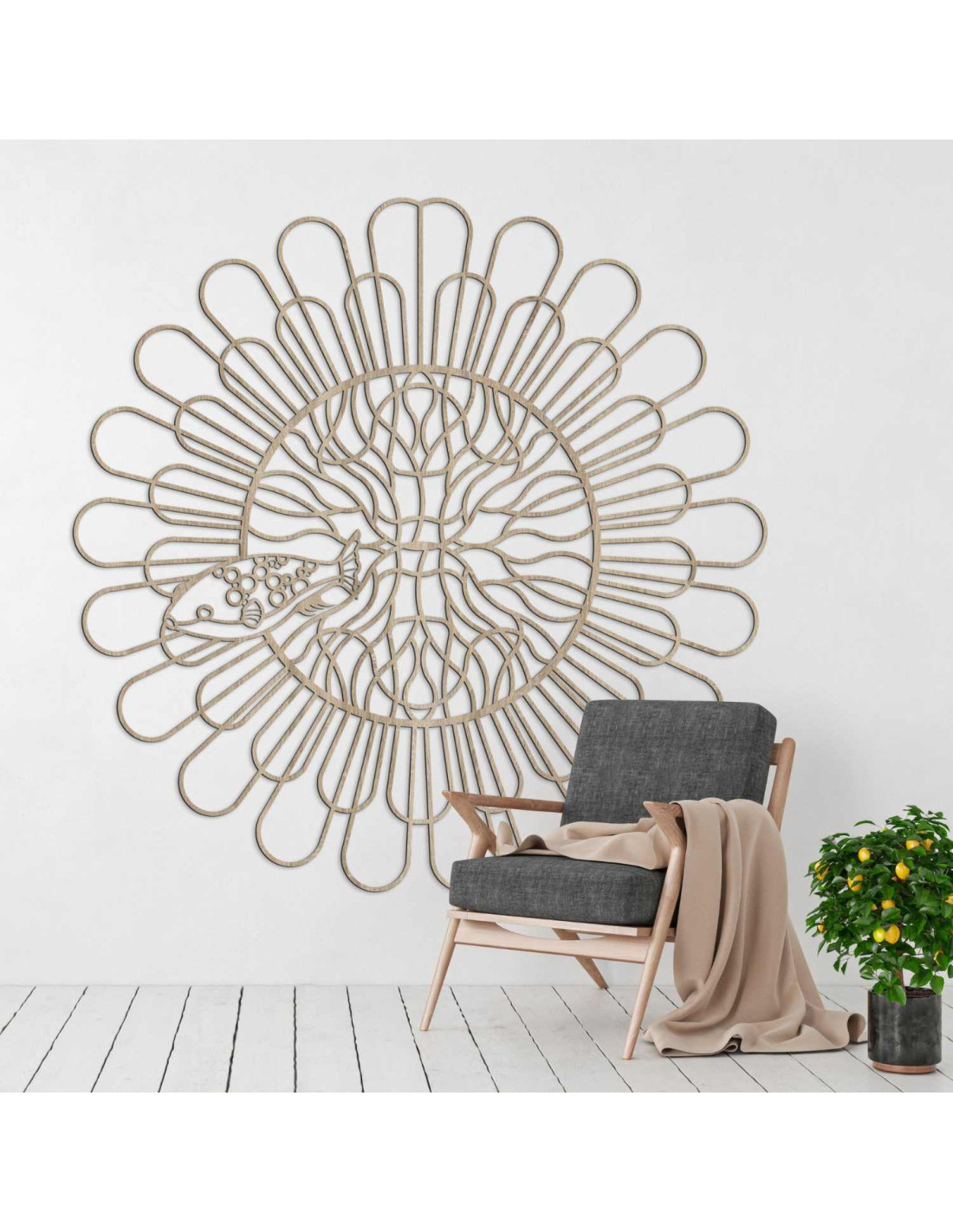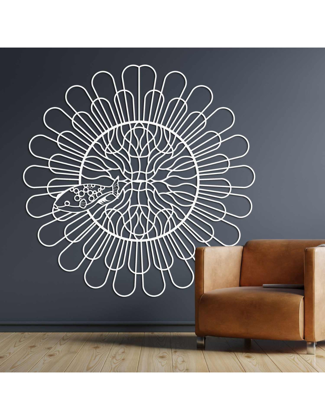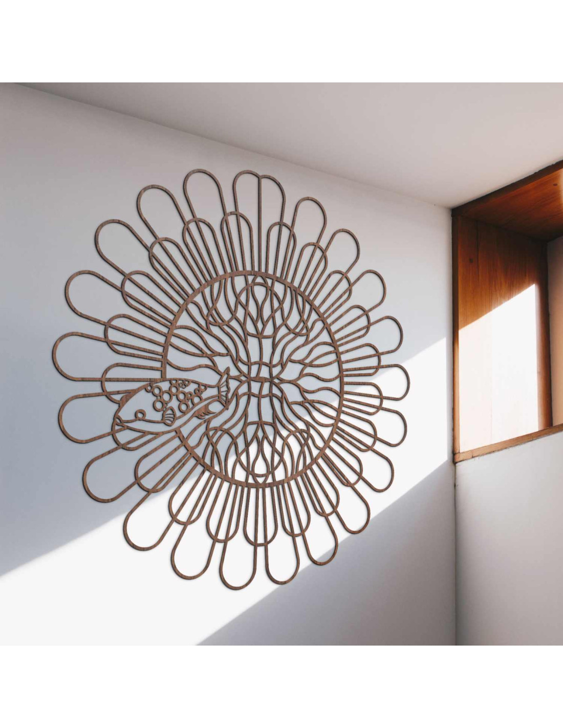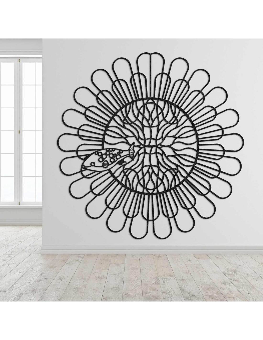 Černá dřevěná mandala s rybou na bílé stěně v moderním bytě