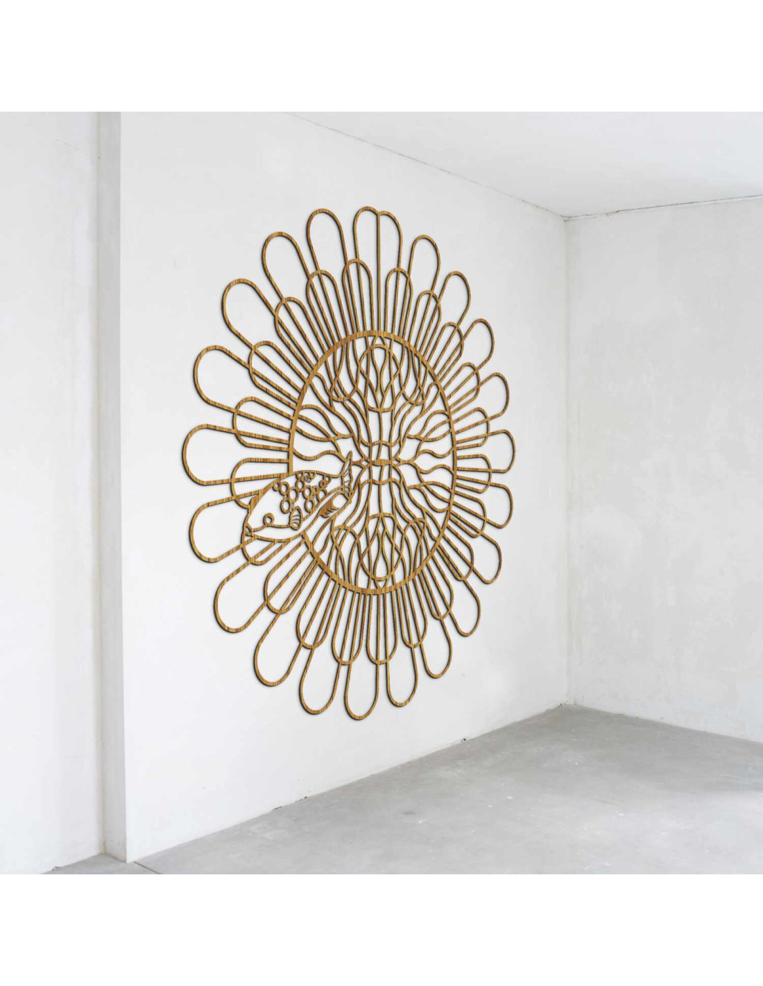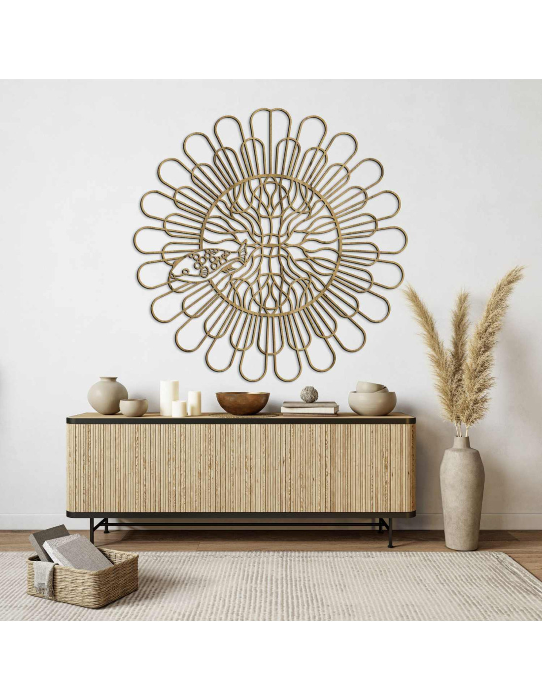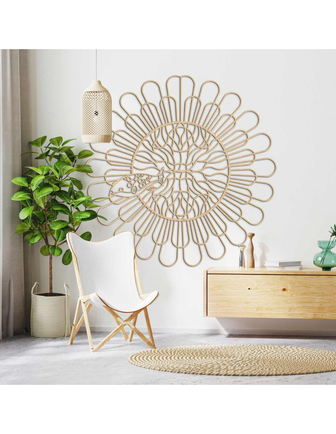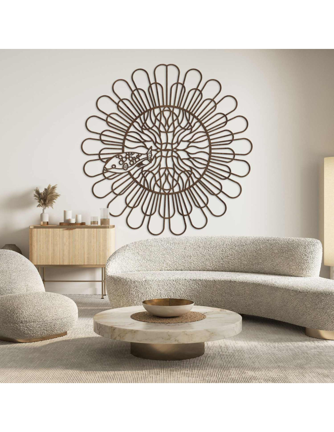 Černá dřevěná mandala s rybou na bílé stěně v moderním bytě