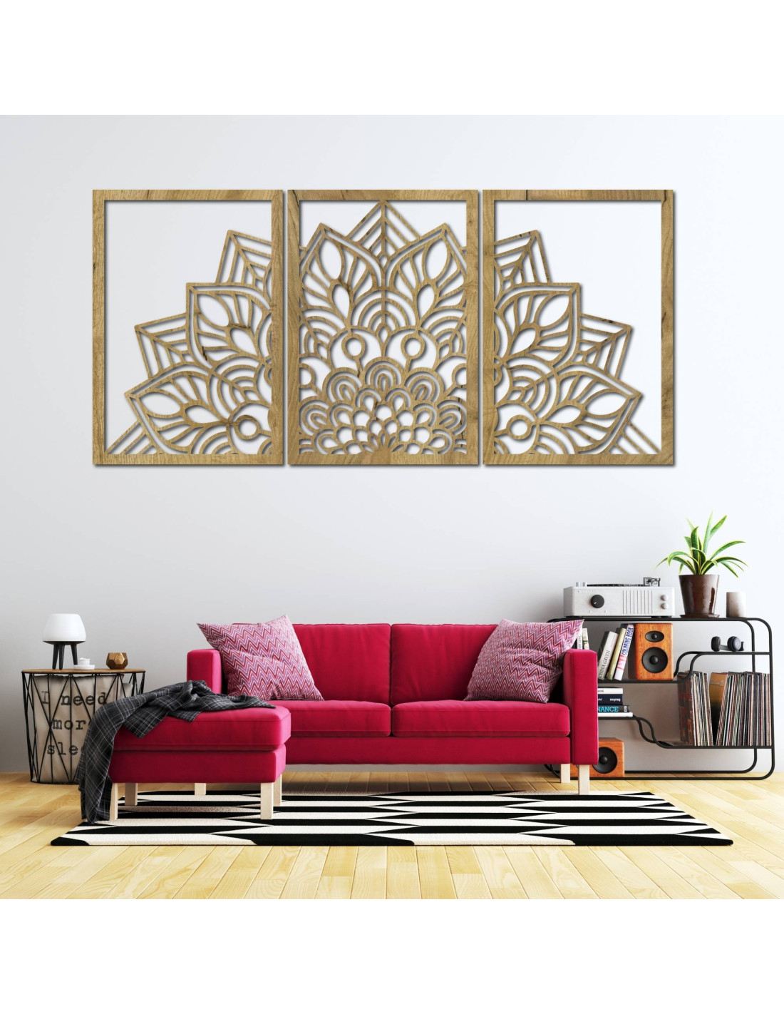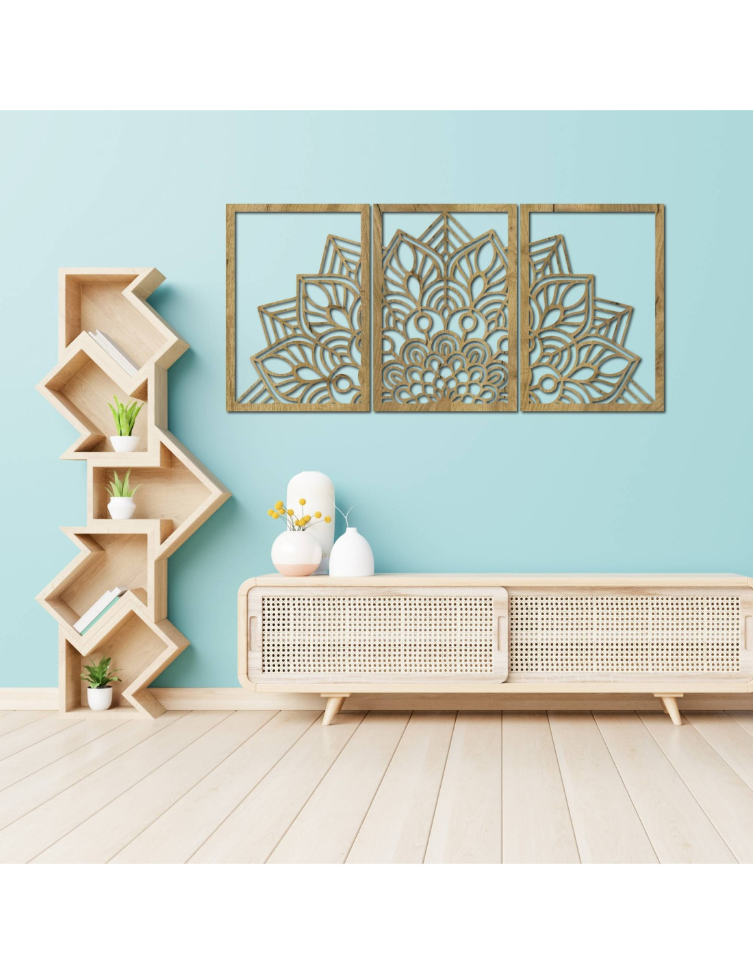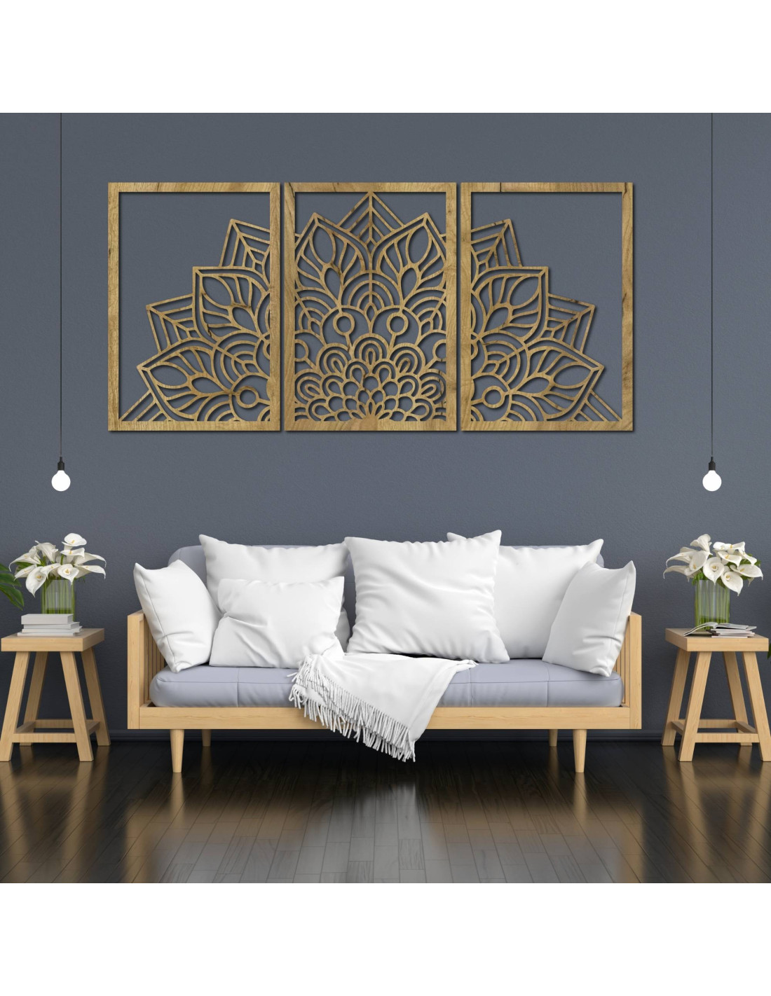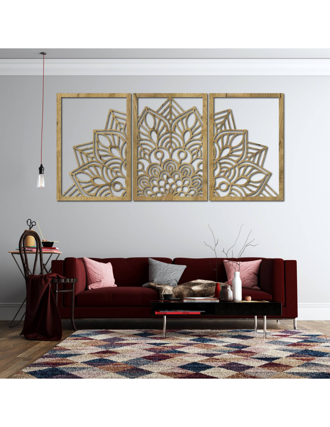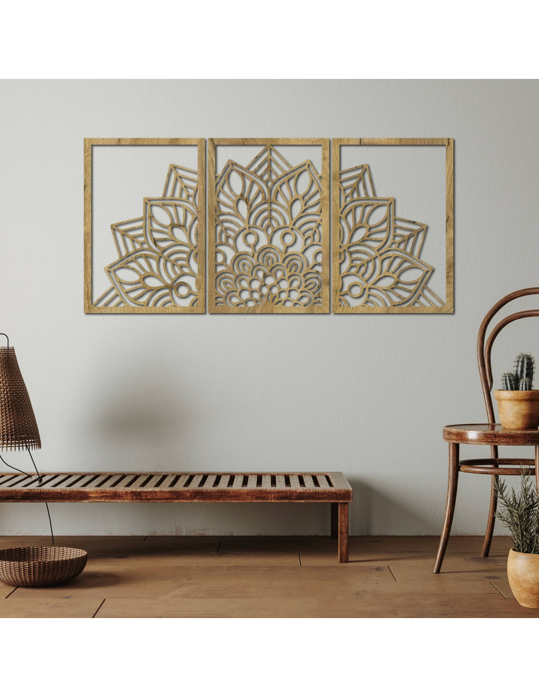Ať už jde o umělecké nástěnné hodiny ve tvaru květu života mandalu s hravými siluetami ptáků, nebo o majestátní třídílnou mandalu , tyto prvky díky preciznímu vyřezávání vizuálně otevírají a zvětšují prostor.