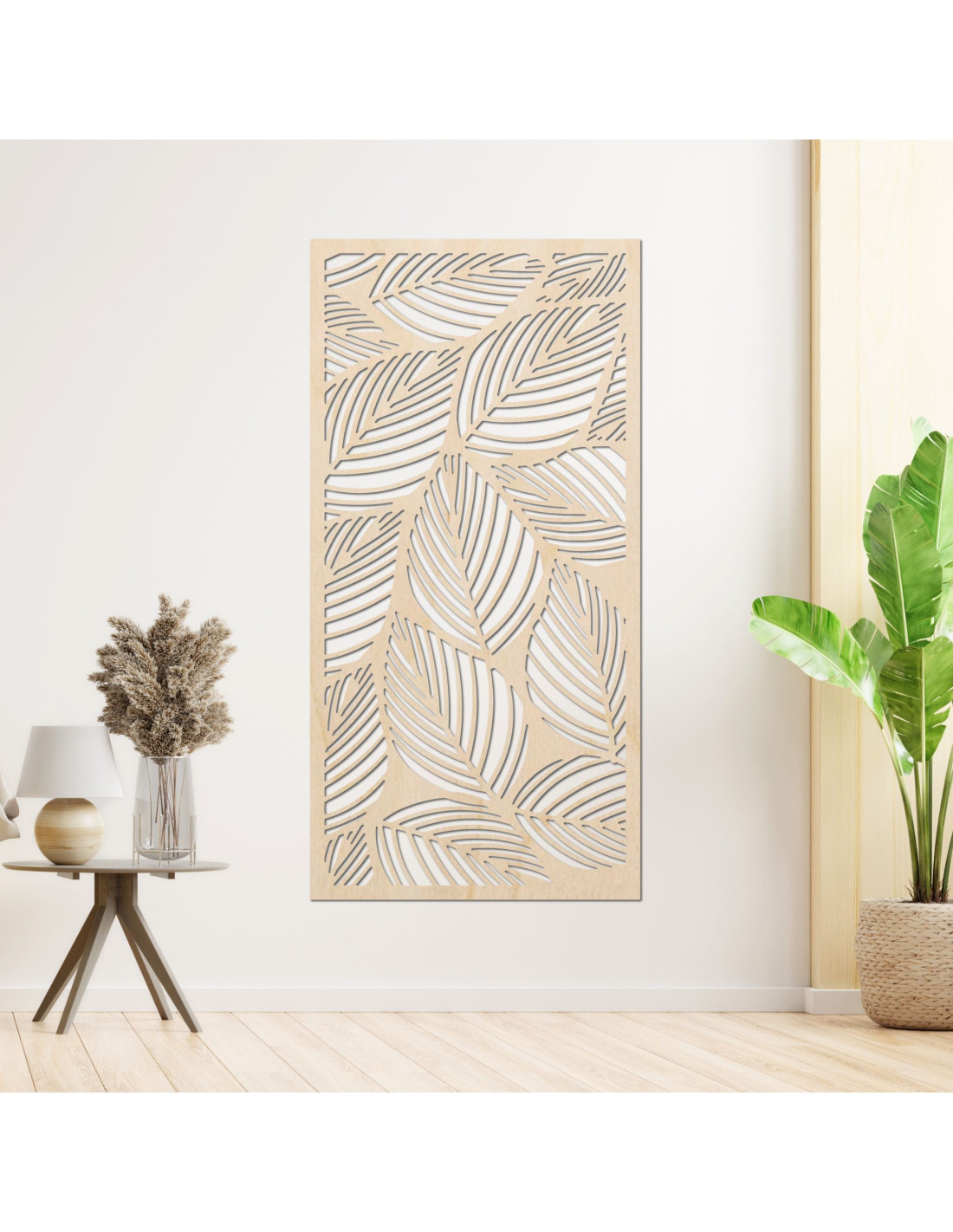 Dřevěná dekorace s listovým vzorem symbolizuje růst, klid a spojení s přírodou.