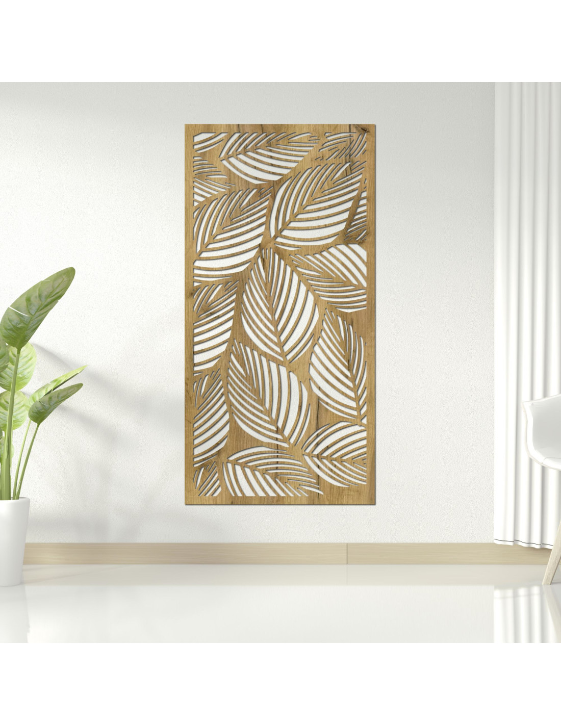 Dřevo krásně vynikne na stěně a doplní moderní i boho interiéry. Pro dokonalý efekt ji zkombinujte s dřevěným nábytkem nebo rostlinami.